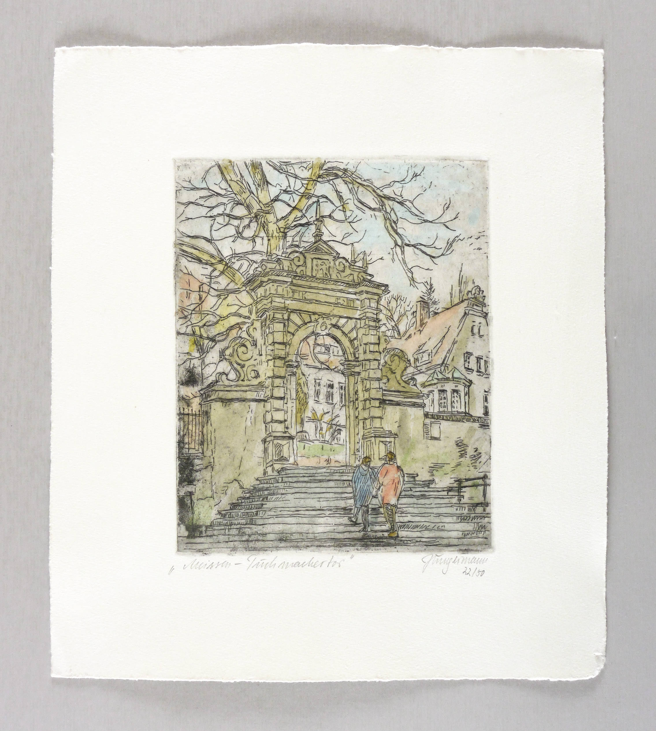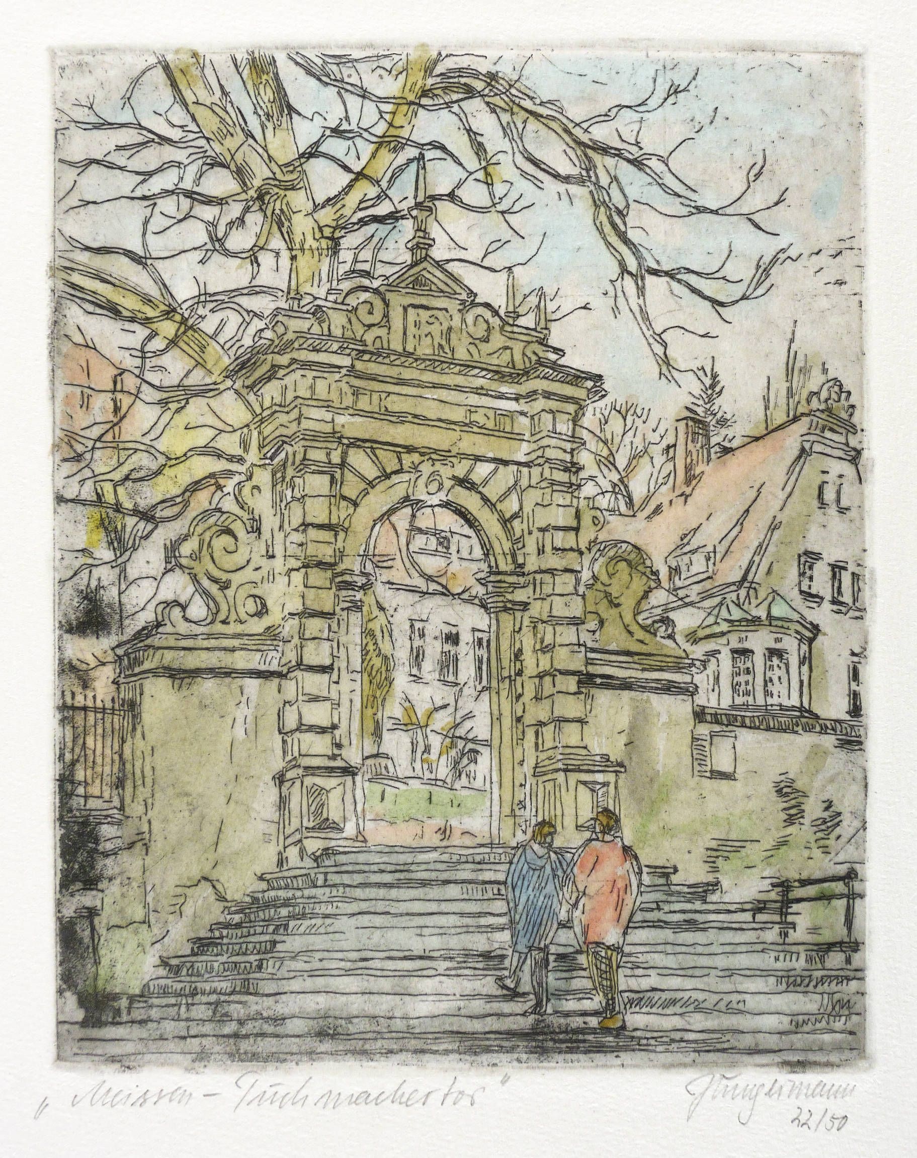 Rechts unten in Bleistift signiert: ″Jungermann″. Dazu Auflagenbezeichnung: ″22/50″. Links betitelt: ″Meissen - Tuchmachertor″. – Sehr guter Zustand.