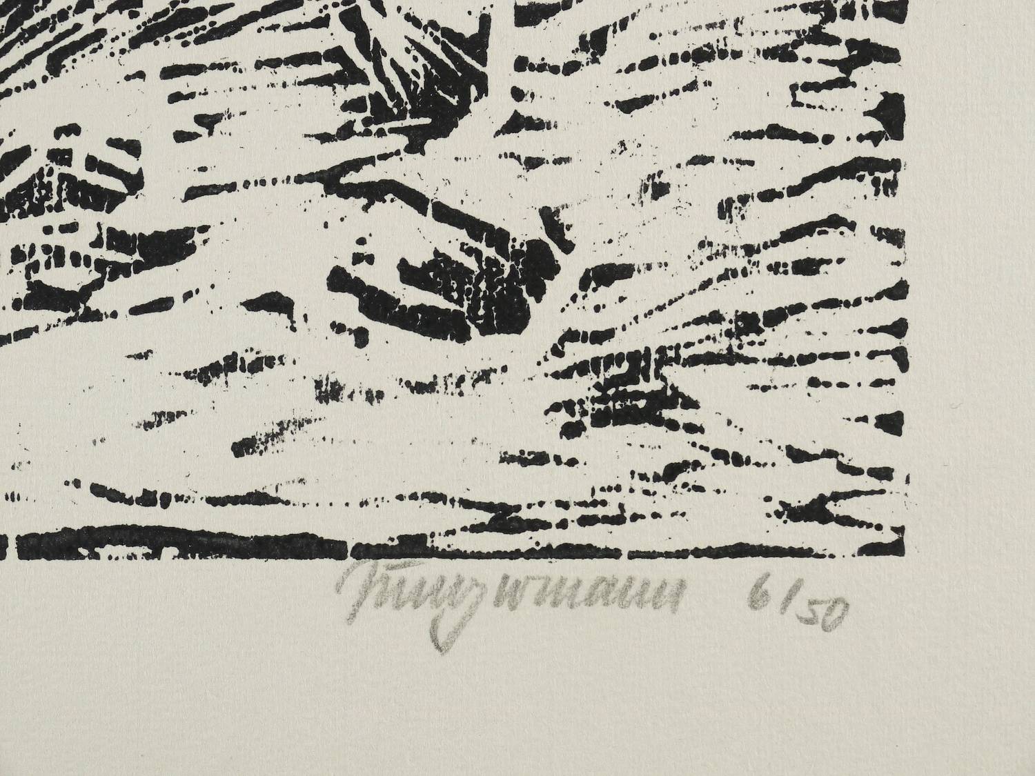 1981. Holzschnitt, in Schwarz, auf rauem hellchamois Bütten. – Originale Künstlergrafik, von Ulrich Jungermann. – Auflage Exemplar Nr. 6/50. – 34,0 x 42,0 cm (Darstellung / Druckstock), 40 x 47 cm (Blatt).