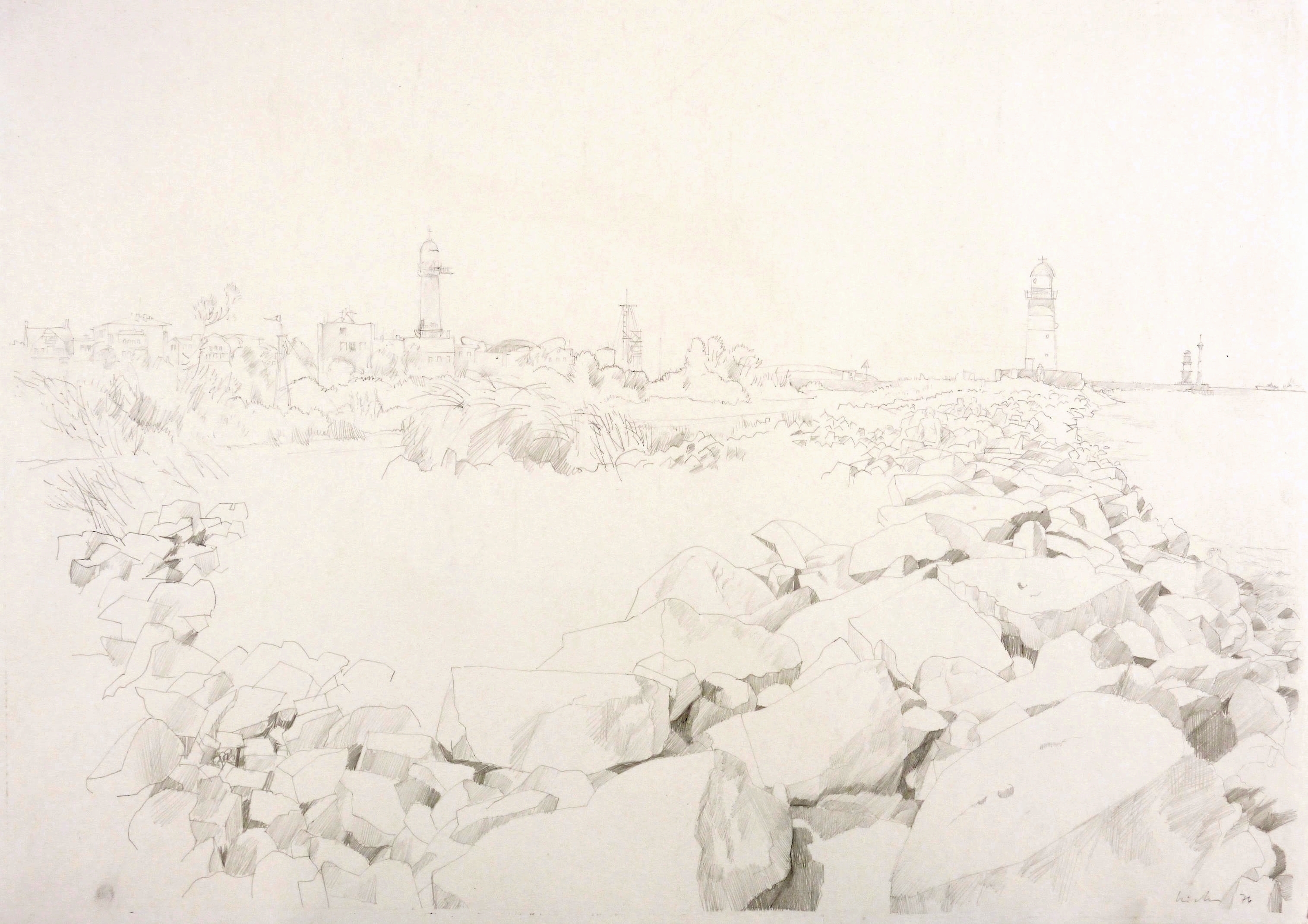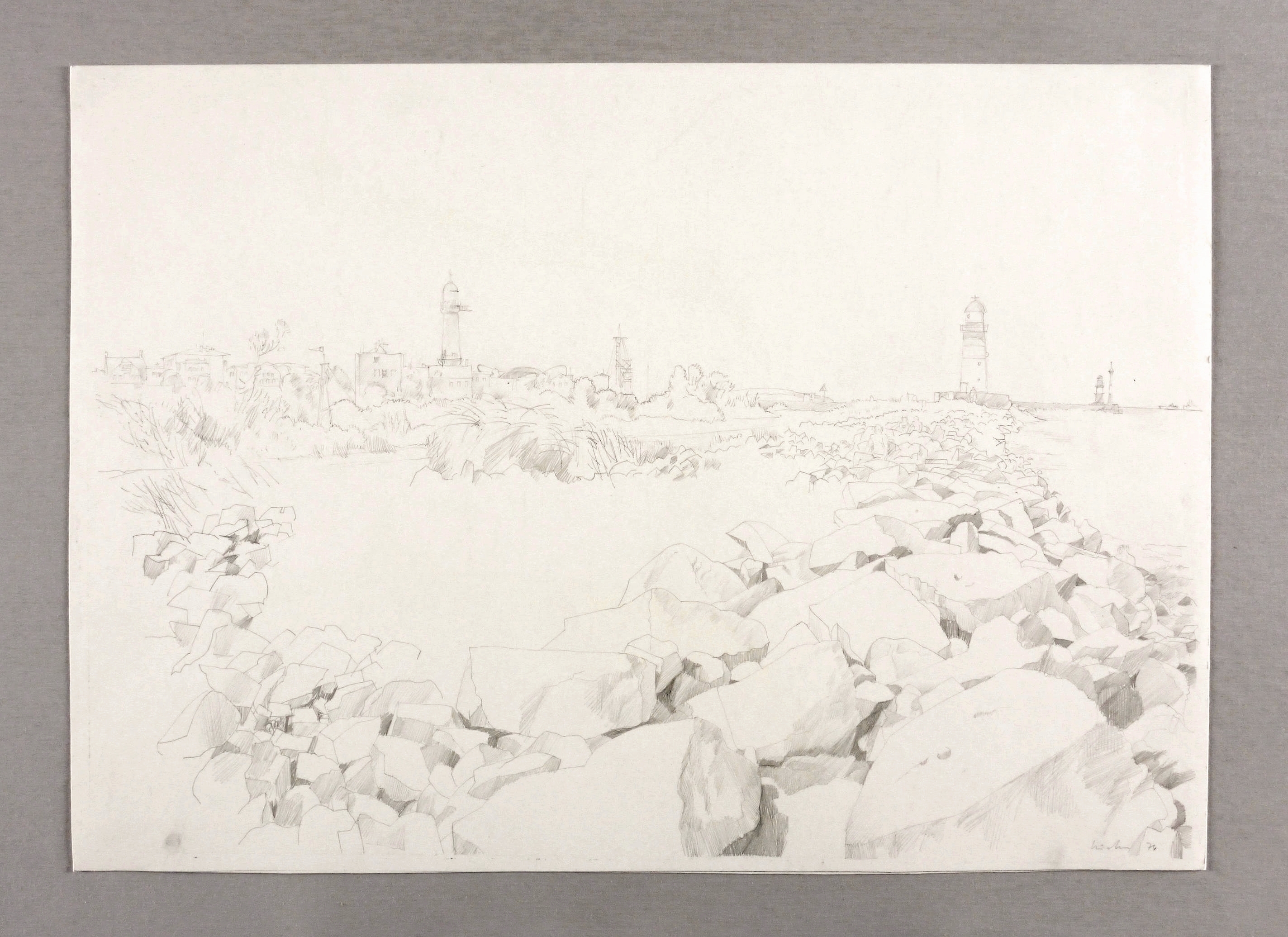 Nicht handsigniert. Verso in Bleistift ausführlich bezeichnet: ″Leuchttürme von Warnemünde″ / Bleistift / 1976, 30,0 x 42,0 cm″. Nachlass-Stempel. – Im Papier kaum merkliche unscheinbare Flecken. Guter Zustand.