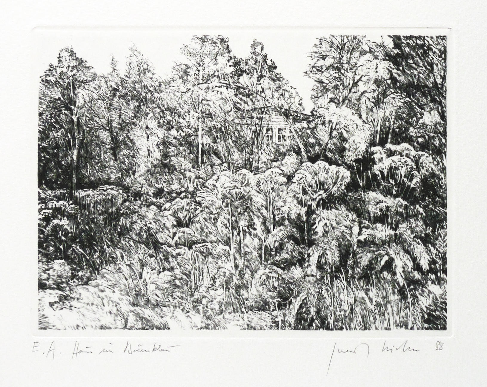 WVZ II-291. – Rechts unten in Bleistift signiert und datiert: ″Gerenot Richter 88″. Links Auflagenbezeichnung und Titel: ″E.A. Haus im Bärenklau″. Verso bezeichnet. Nachlass-Stempel des Künstlers. – Ohne Mängel. Sehr guter Zustand.