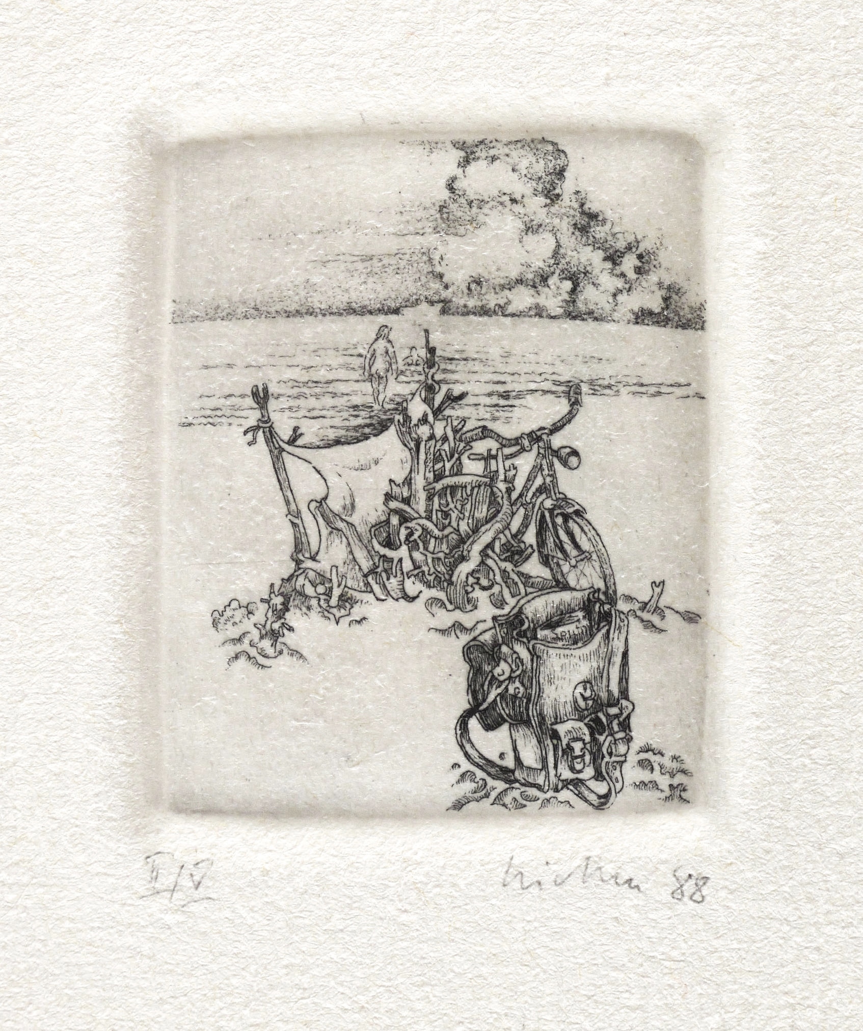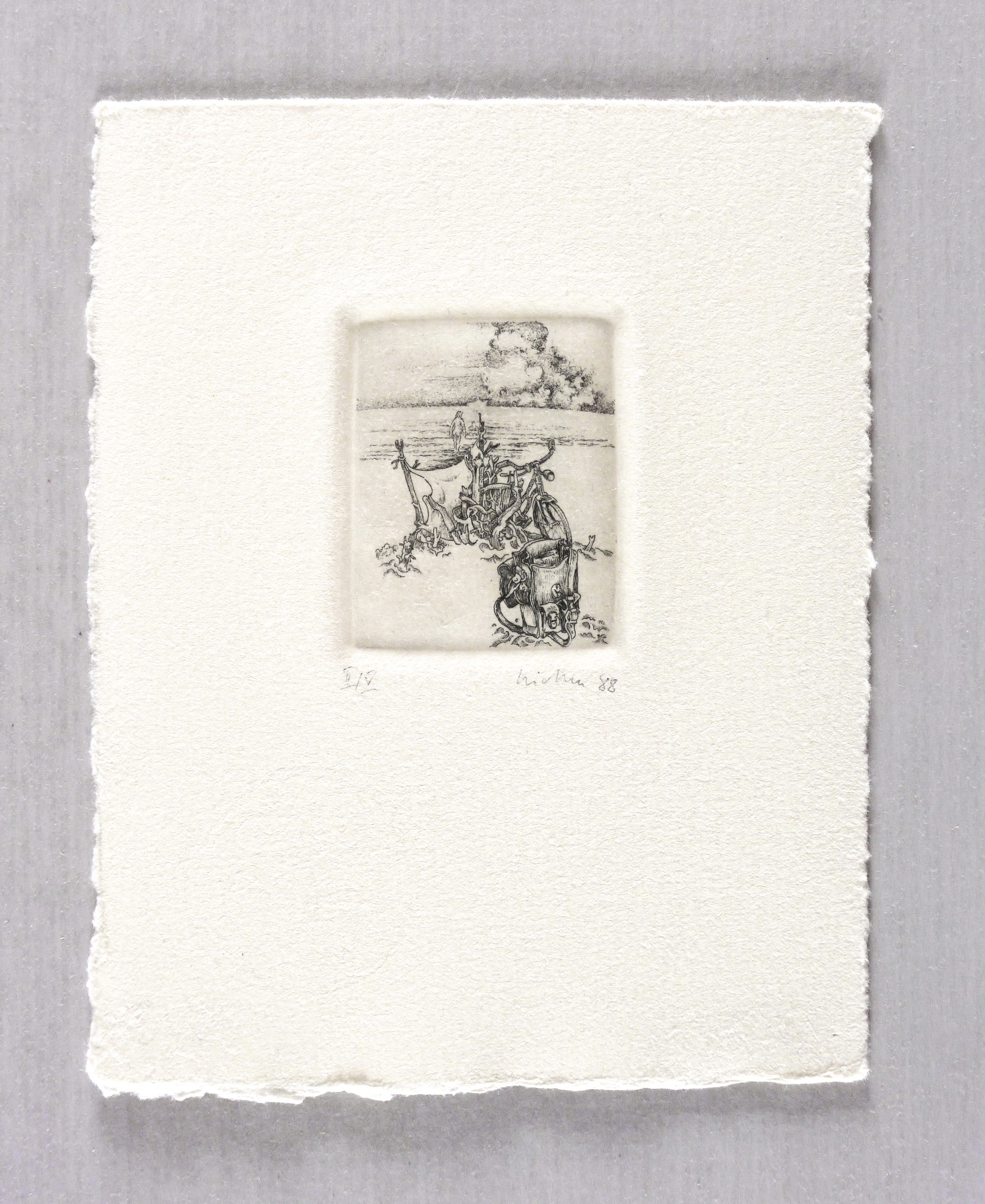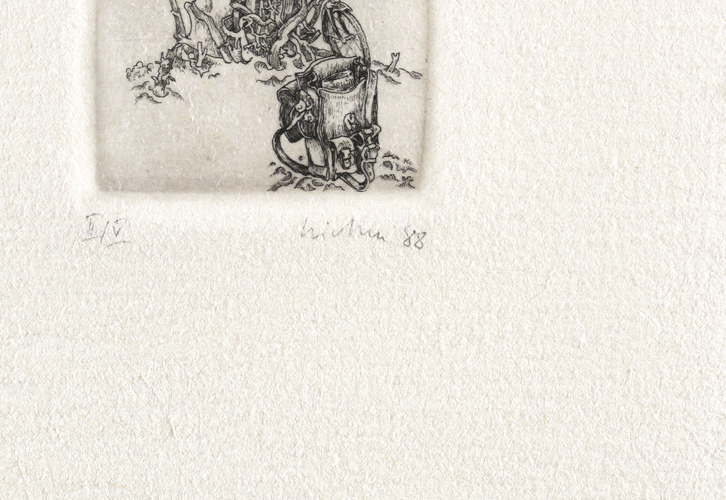 1988. Radierung / Strichätzung, in Schwarz, auf chamois Hahnemühle. – Originale Künstlergrafik, von Gerenot Richter. – Auflage Exemplar Nr. II/V. – 4,5 x 3,5 cm (Darstellung / Platte), 13 x 11 cm (Blatt).