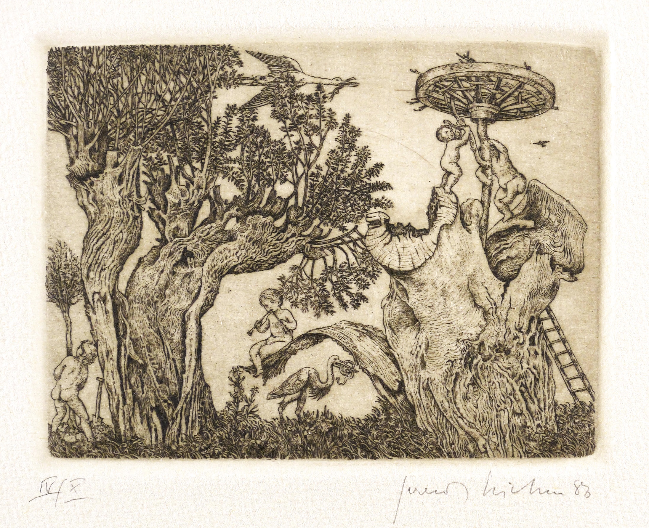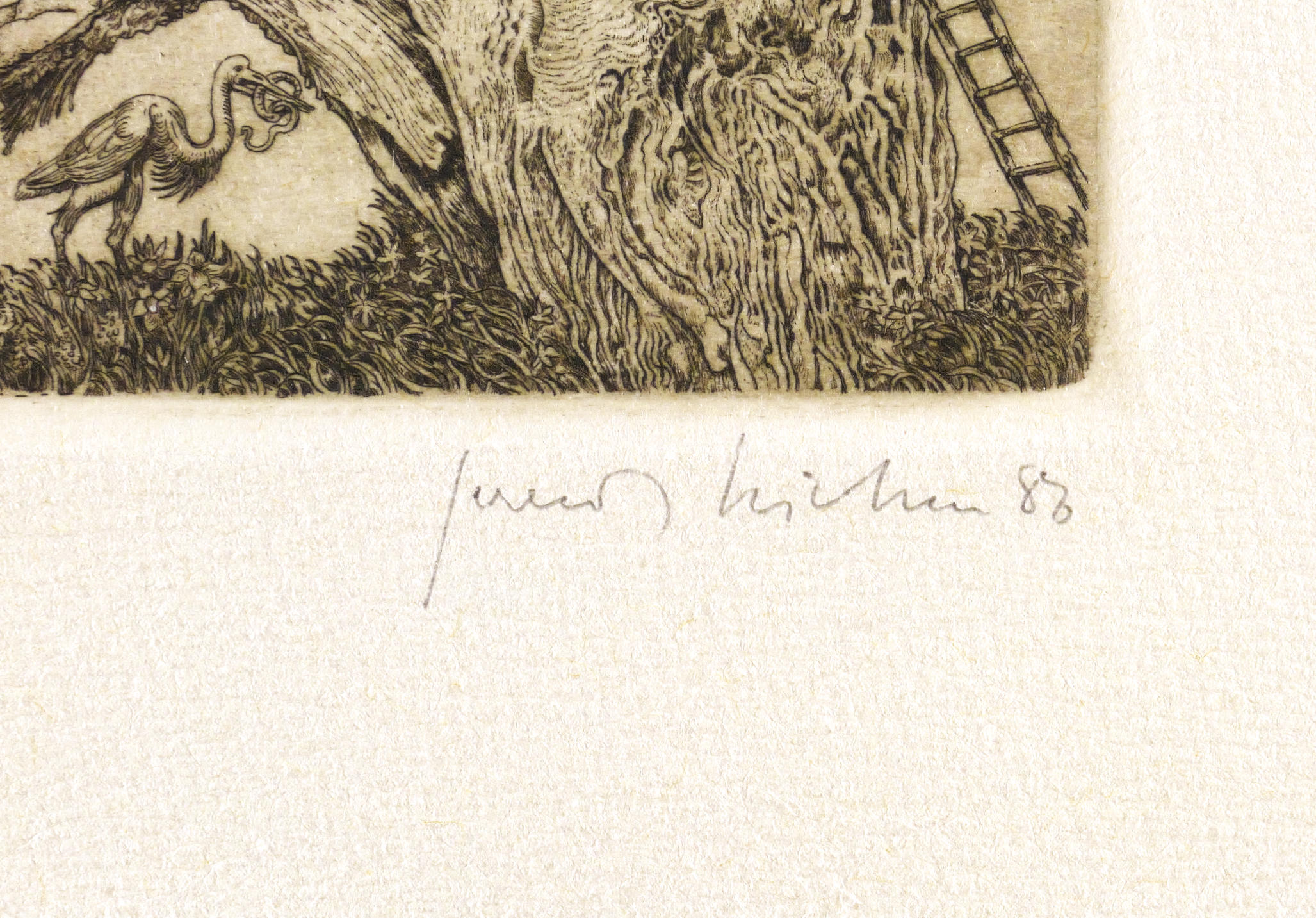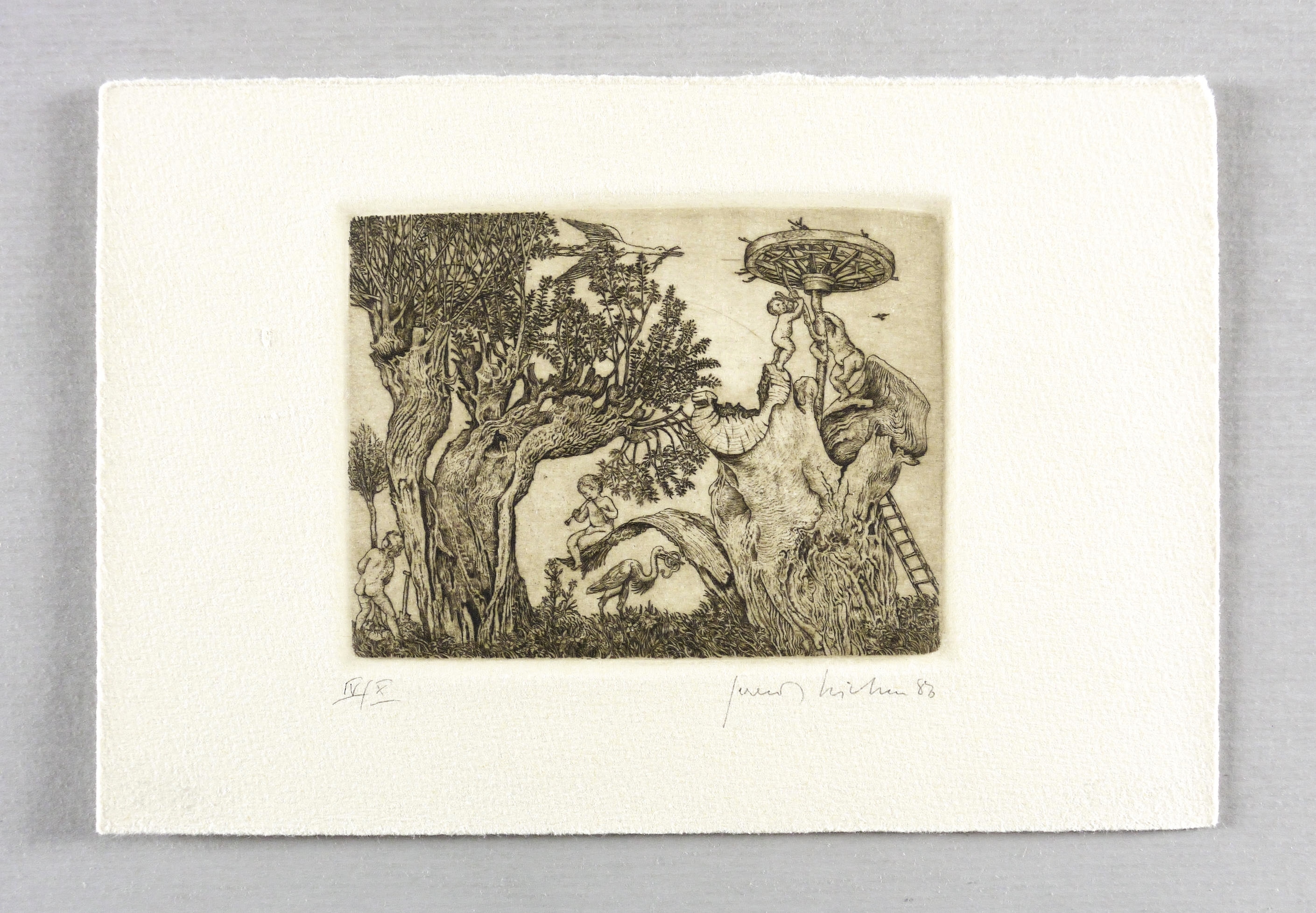 1986. Radierung / Strichätzung, in Schwarzbraun, auf chamois Velinkarton. – Originale Künstlergrafik, von Gerenot Richter. – Auflage Exemplar Nr. IV/X. – 8,0 x 10,6 cm (Darstellung / Platte), 13 x 20 cm (Blatt).