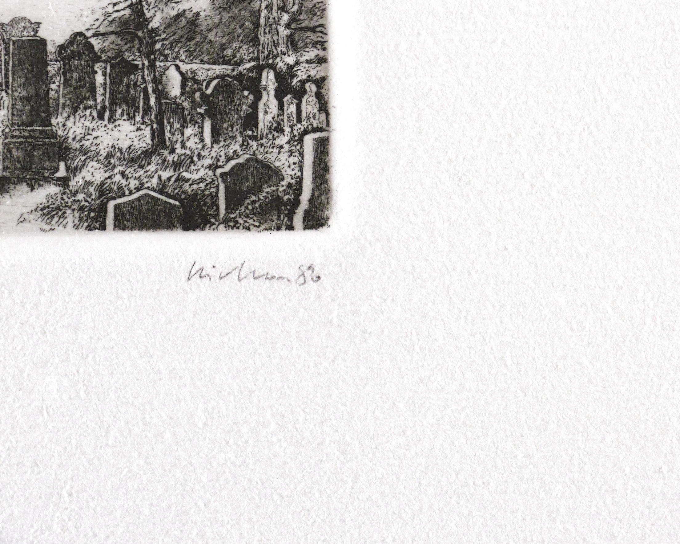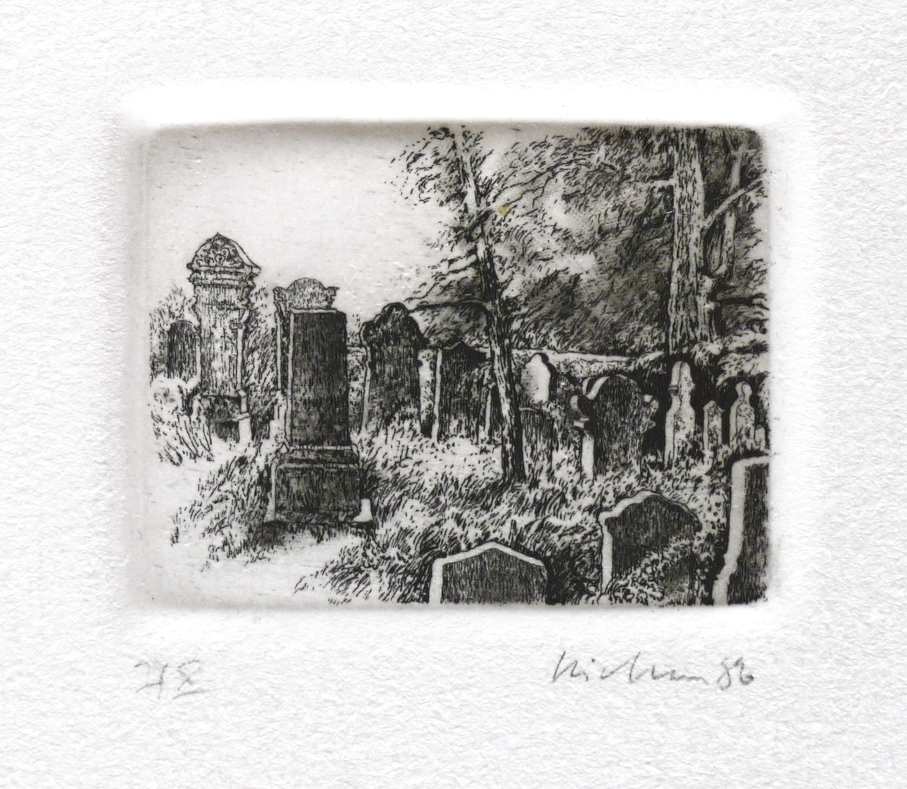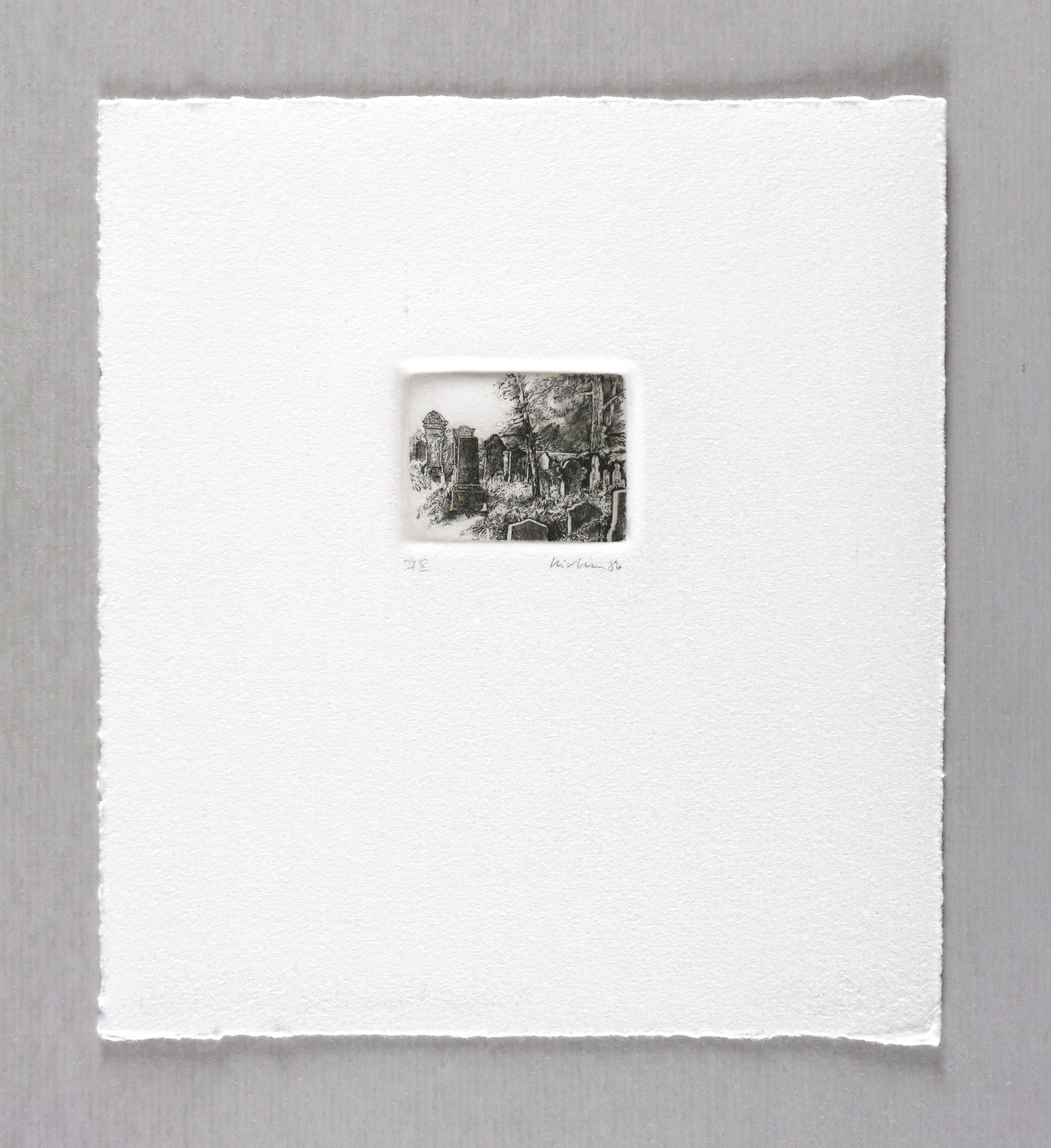 1986. Radierung / Strichätzung, in Schwarz, auf hellchamois Weißenborn. – Originale Künstlergrafik, von Gerenot Richter. – Auflage Exemplar Nr. I/X. – 4,0 x 5,0 cm (Darstellung / Platte), 19 x 17 cm (Blatt).