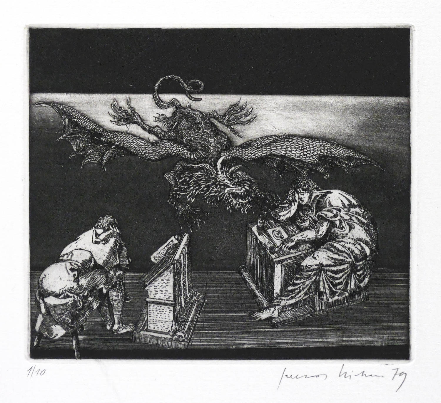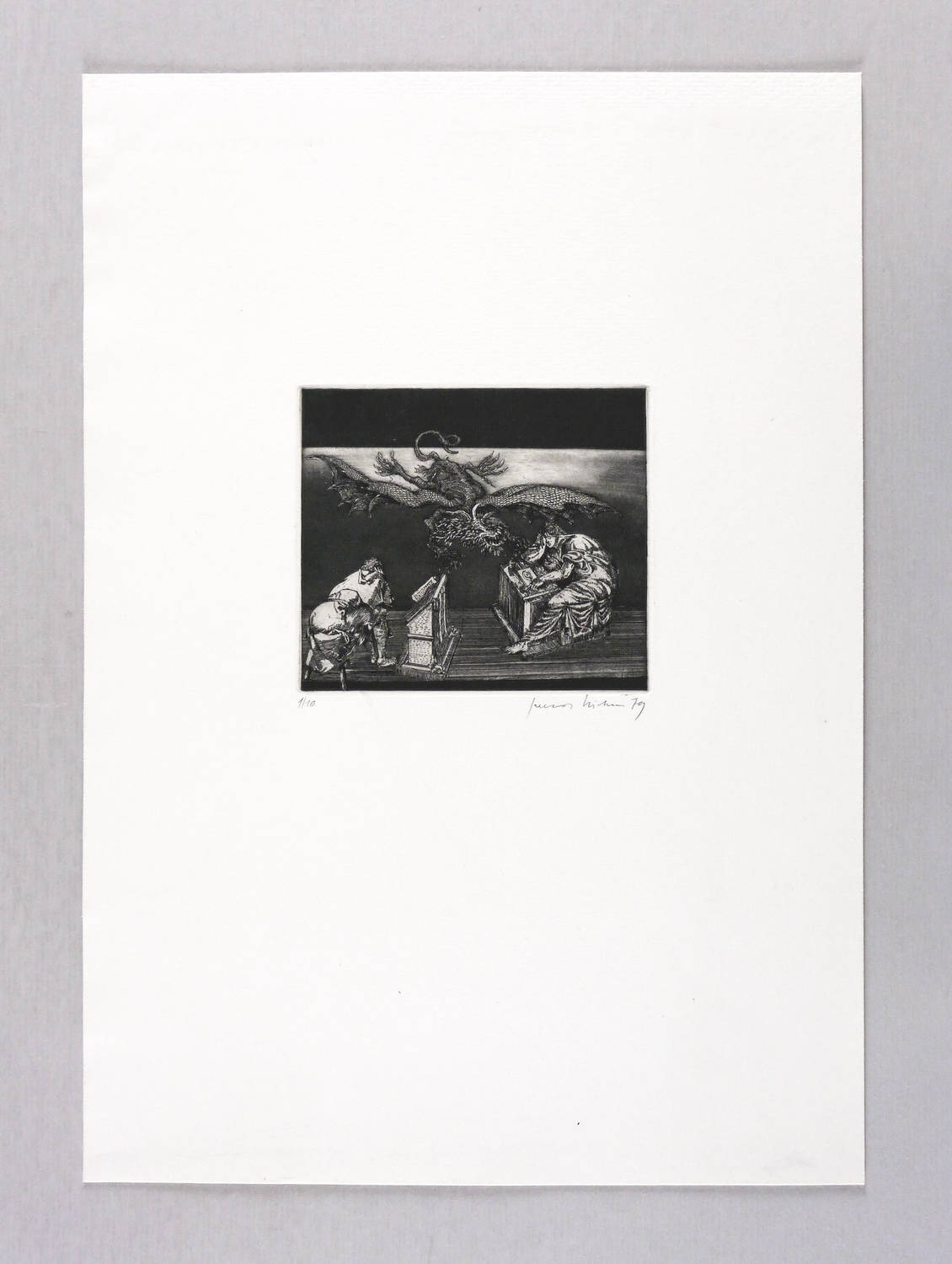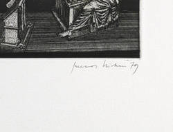 1979. Radierung / Aquatinta & Strichätzung, in Schwarz, auf hellchamois Weißenborn. – Originale Künstlergrafik, von Gerenot Richter. – Auflage Exemplar Nr. 1/10. – 9,4 x 10,9 cm (Darstellung / Platte), 35 x 24 cm (Blatt).