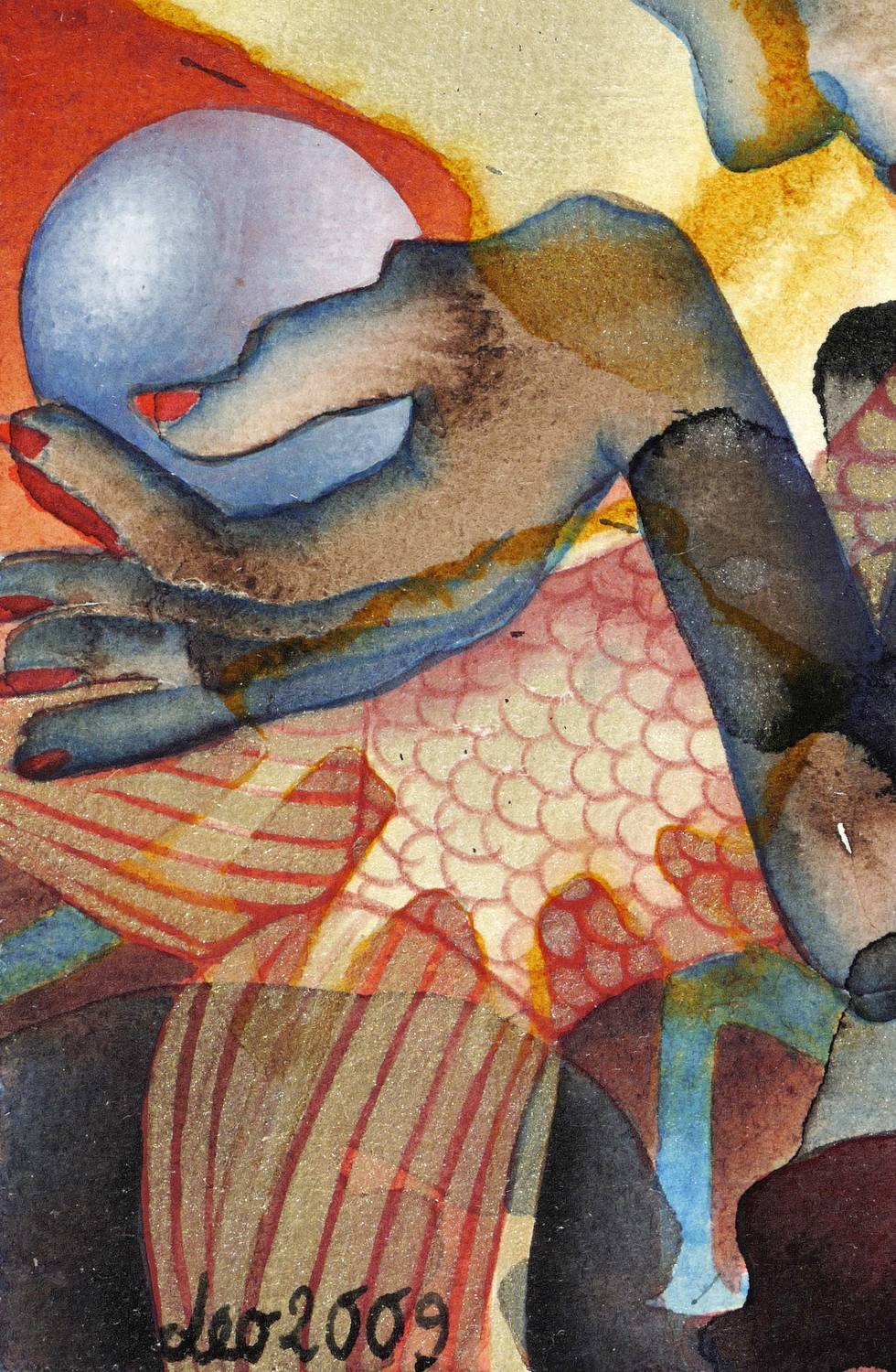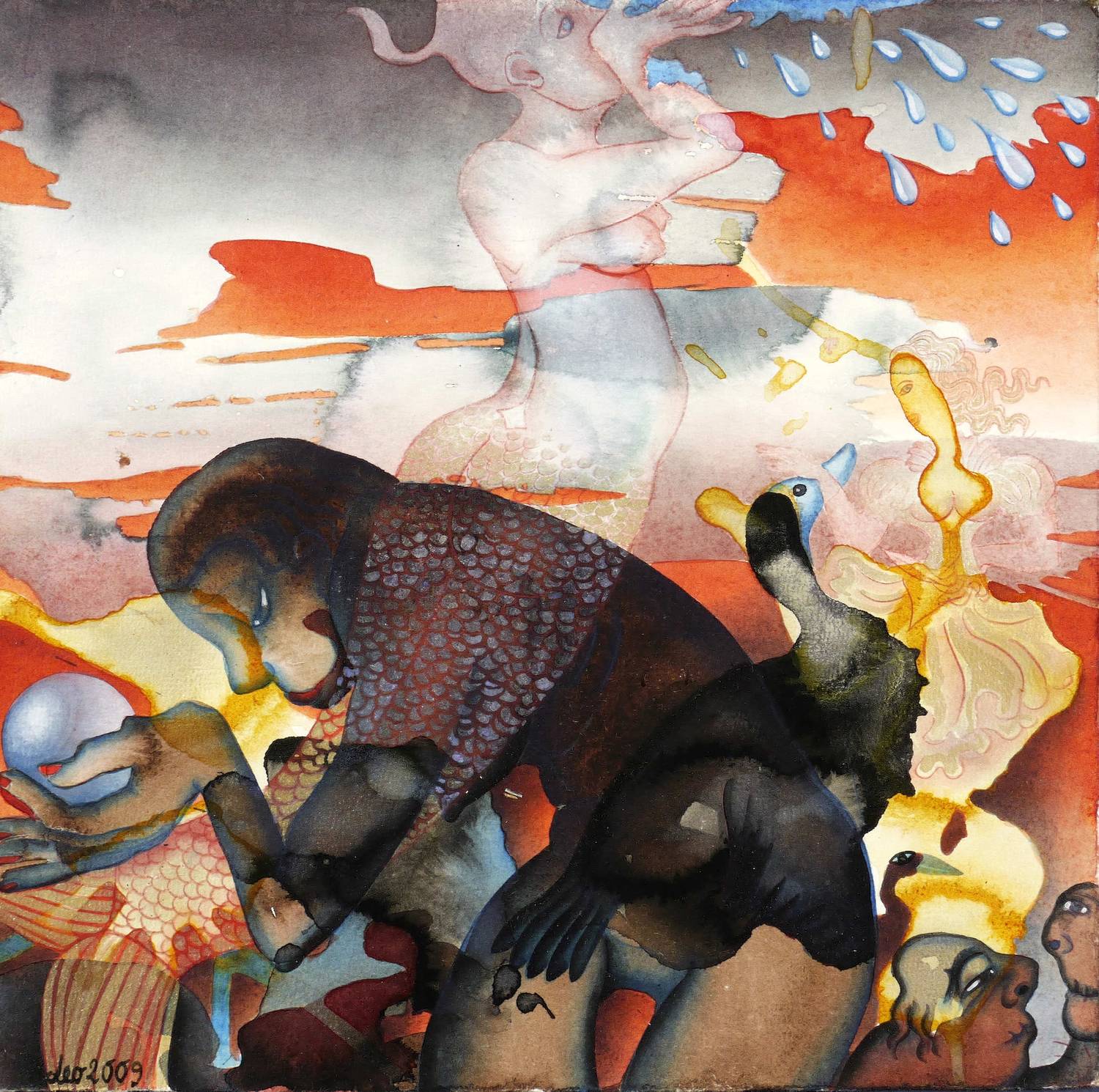 2009. Mischtechnik / farbige Tusche, Gouache & Acrylfarbe, auf Aquarellkarton. – Originale Künstlergrafik, von Leonore Adler. – Unikat. – 26,8 x 27,2 cm (Darstellung / Blatt).