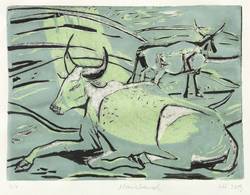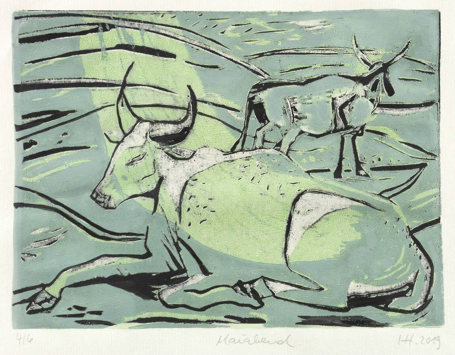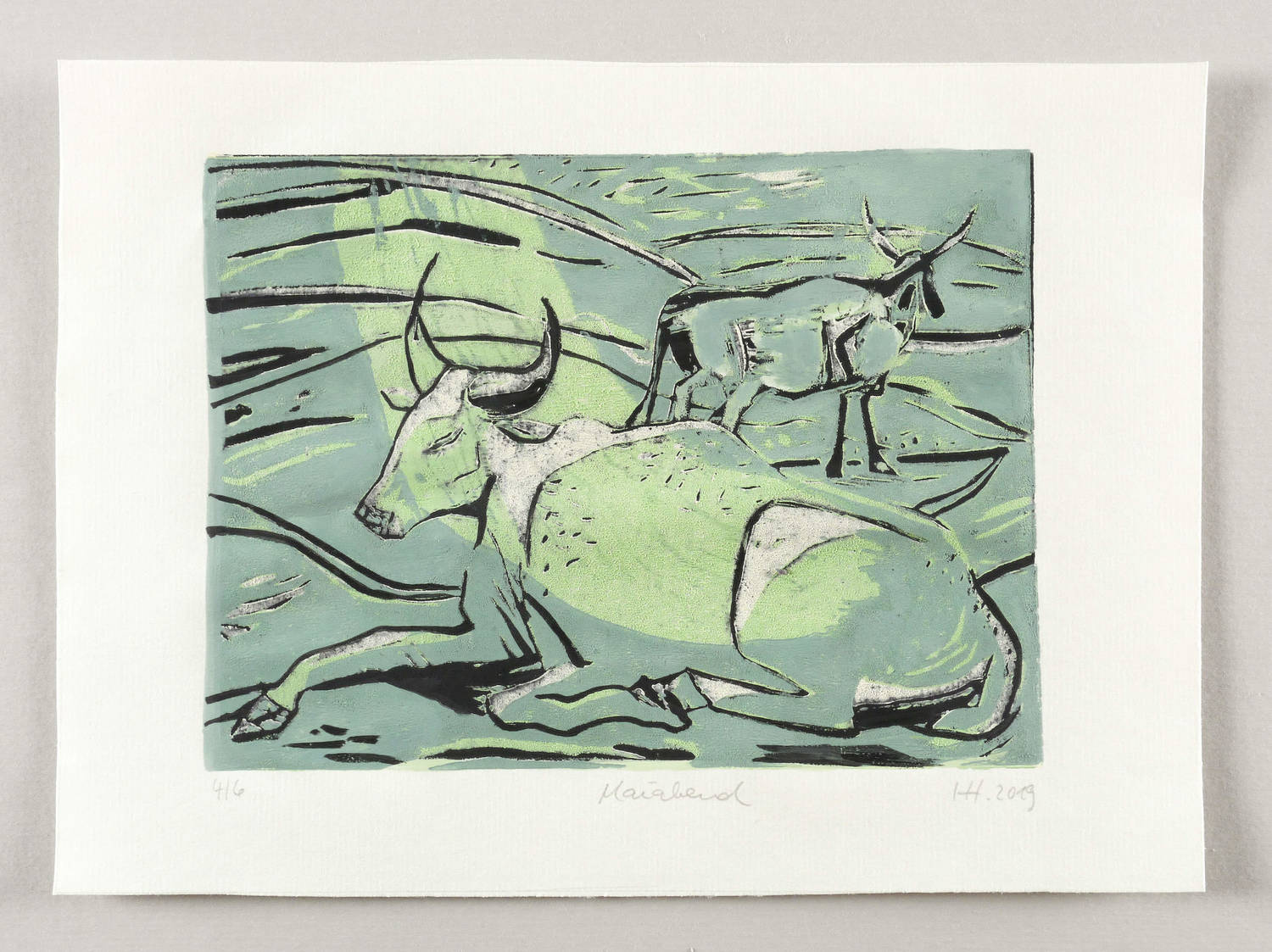 2019. Farblinolschnitt, in 4 Farben, auf leichtem hellgelbem Bütten. – Originale Künstlergrafik, von Helene Heyder. – Auflage Exemplar Nr. 4/6. – 15,2 x 20,4 cm (Darstellung / Druckbild), 21 x 28 cm (Blatt).