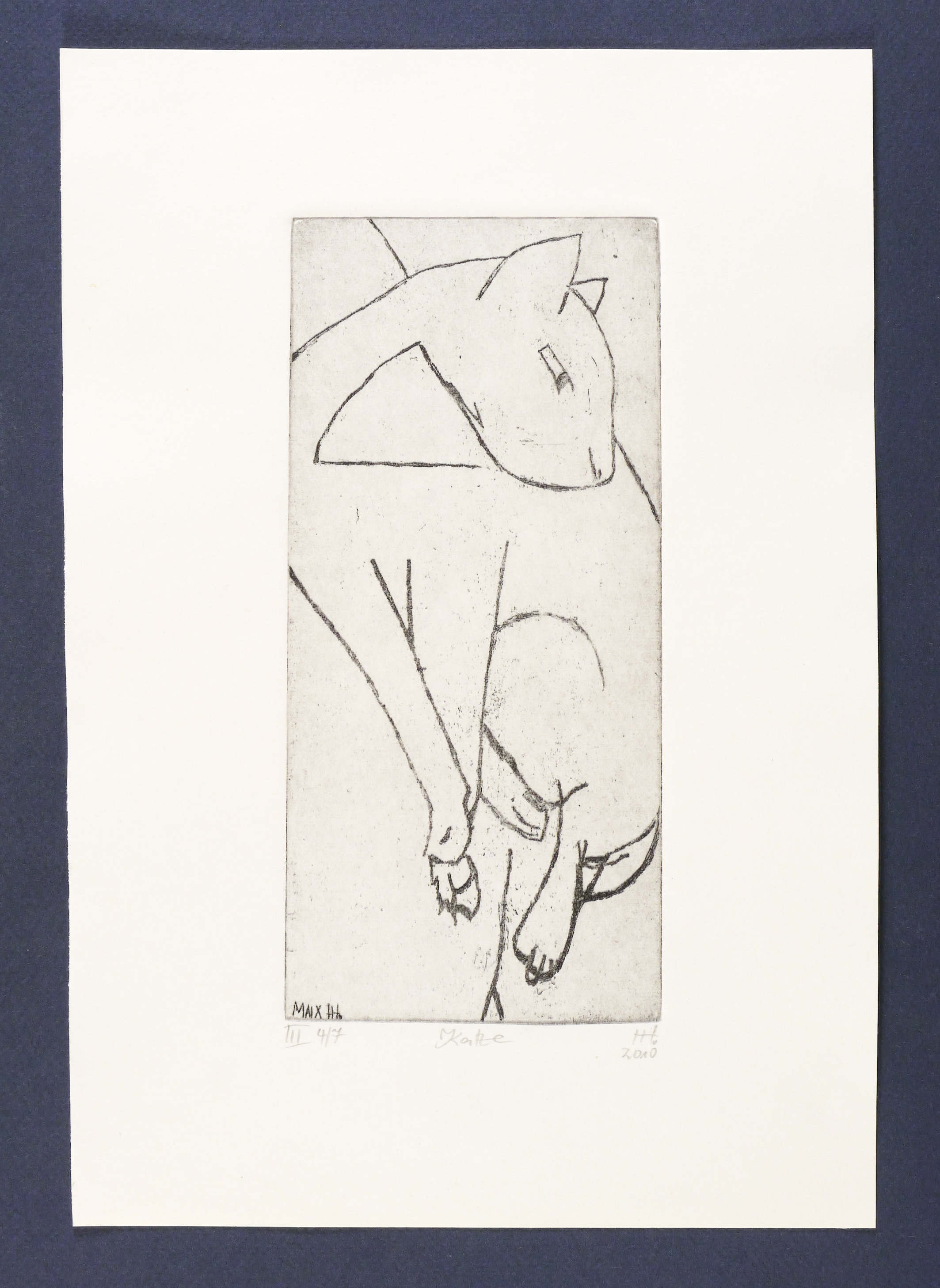 2010. Radierung / Vernis mou, mit Plattenton, in Schwarz, auf hellgelbem Büttenkarton. – Originale Künstlergrafik, von Helene Heyder. – Auflage Exemplar Nr. 4/7. – 21,1 x 9,8 cm (Darstellung / Platte), 31 x 21,5 cm (Blatt).