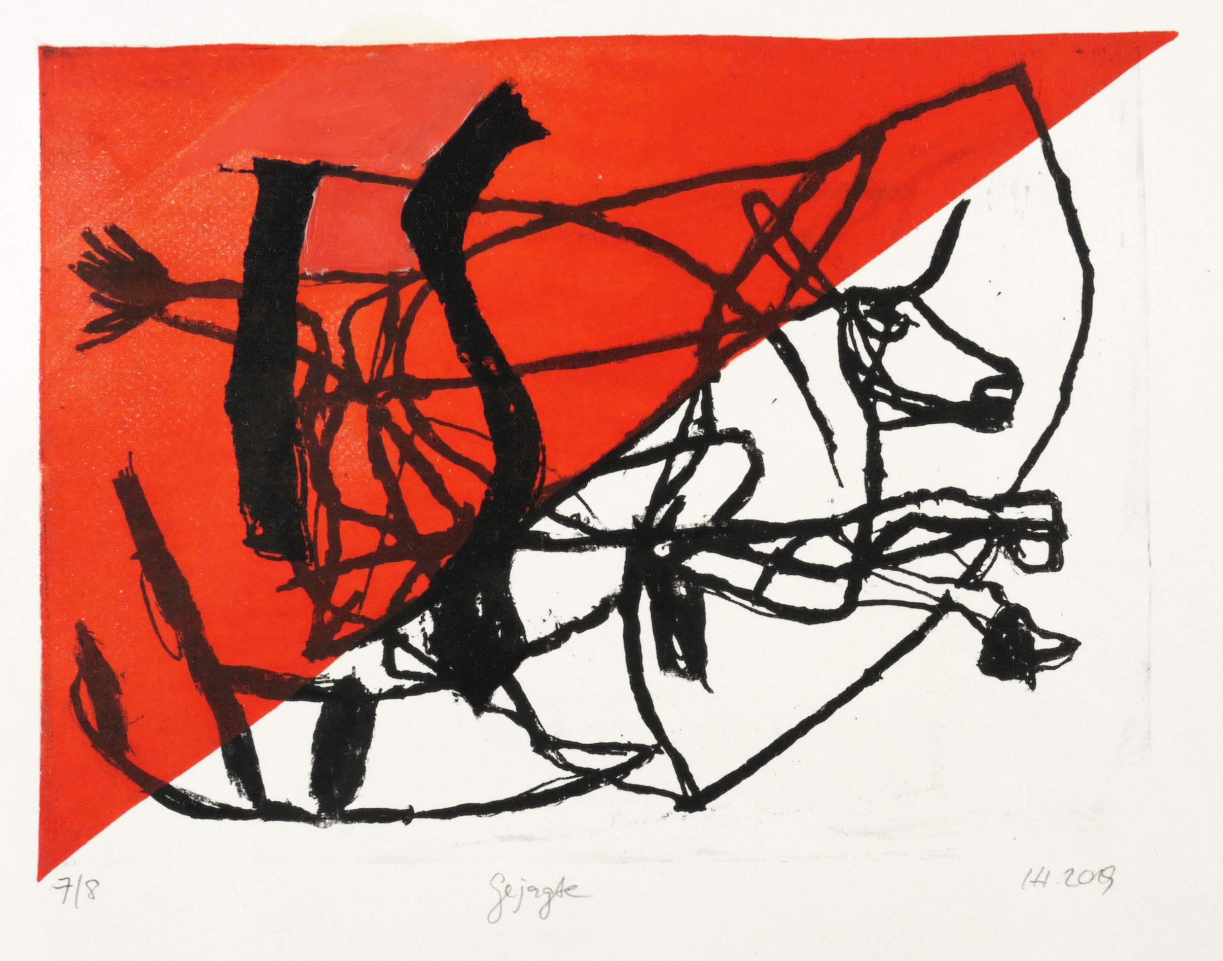 2019. Farblithografie / Pinsellithografie, in Rot & Schwarz, auf hellgelbem Karton. – Originale Künstlergrafik, von Helene Heyder. – Auflage Exemplar Nr. 7/8. – 15,1 x 20,5 cm (Darstellung / Druckbild), 25 x 32 cm (Blatt).