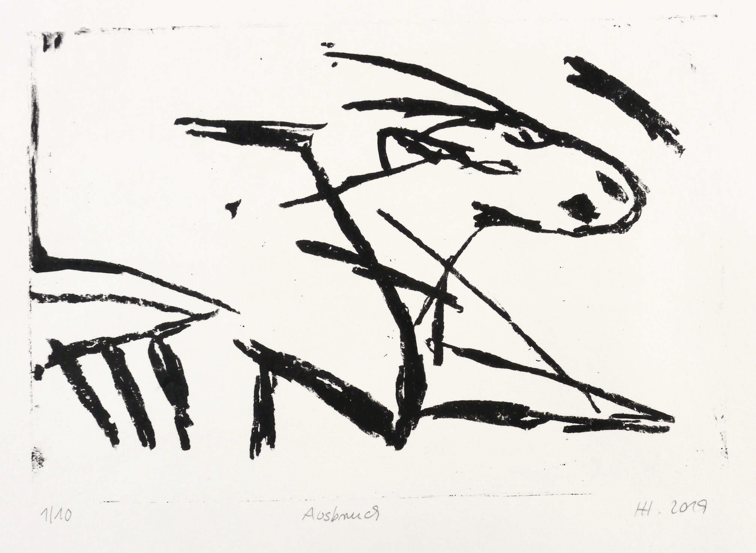2019. Lithografie / Pinsellithografie, in Schwarz, auf hellgelbem Karton. – Originale Künstlergrafik, von Helene Heyder. – Auflage Exemplar Nr. 1/10. – 13,9 x 20,0 cm (Darstellung / Druckbild), 24 x 31 cm (Blatt).