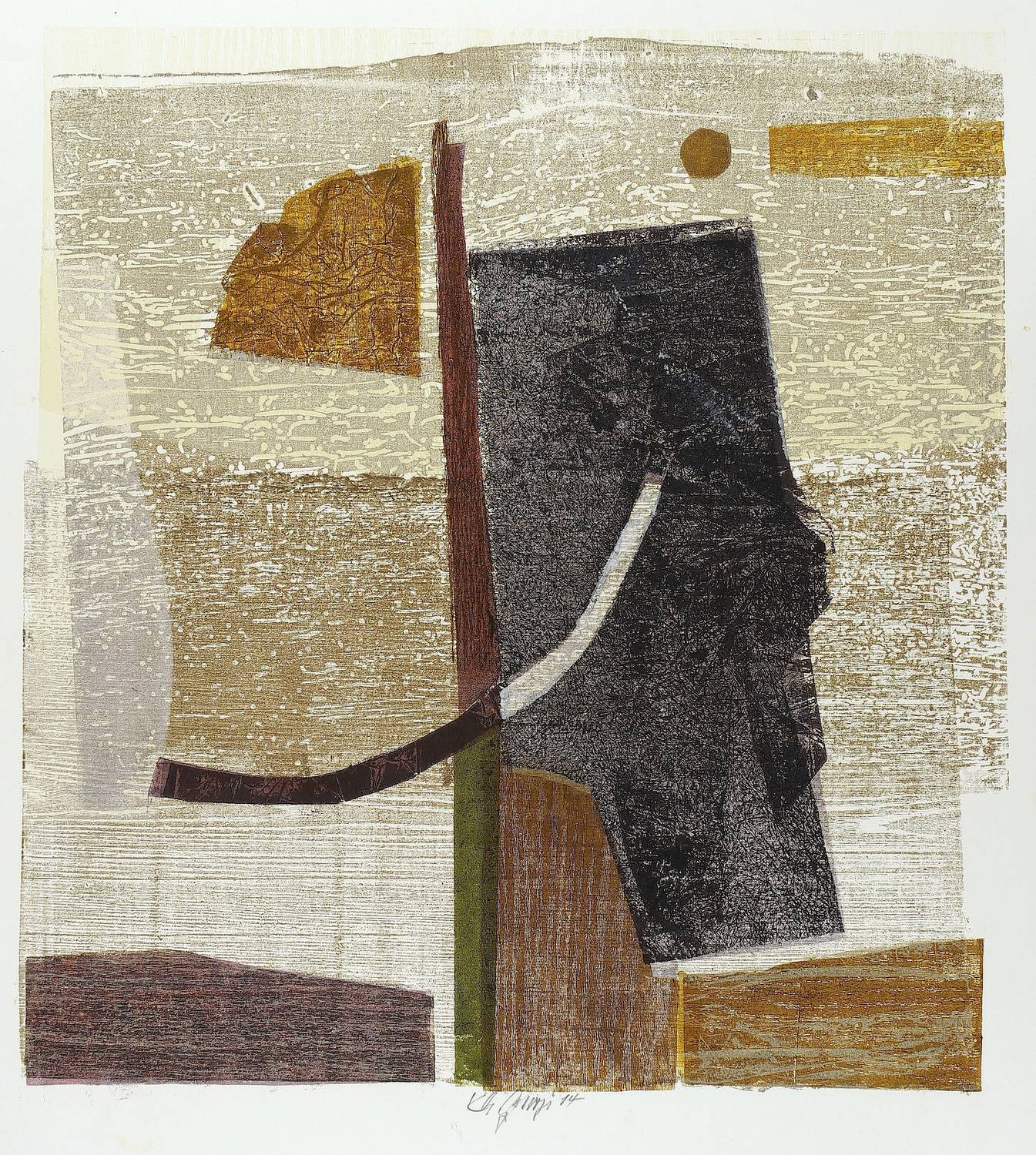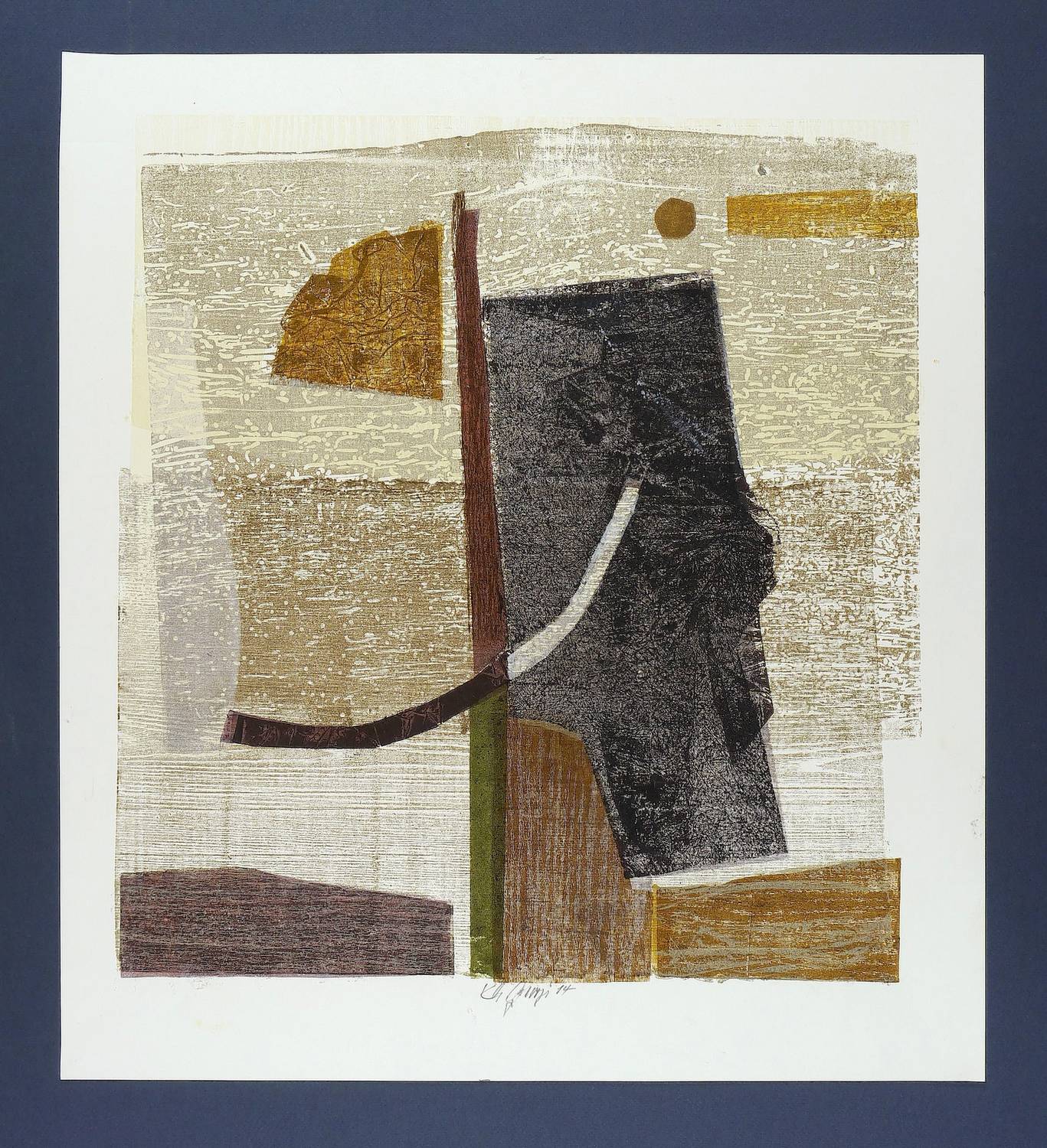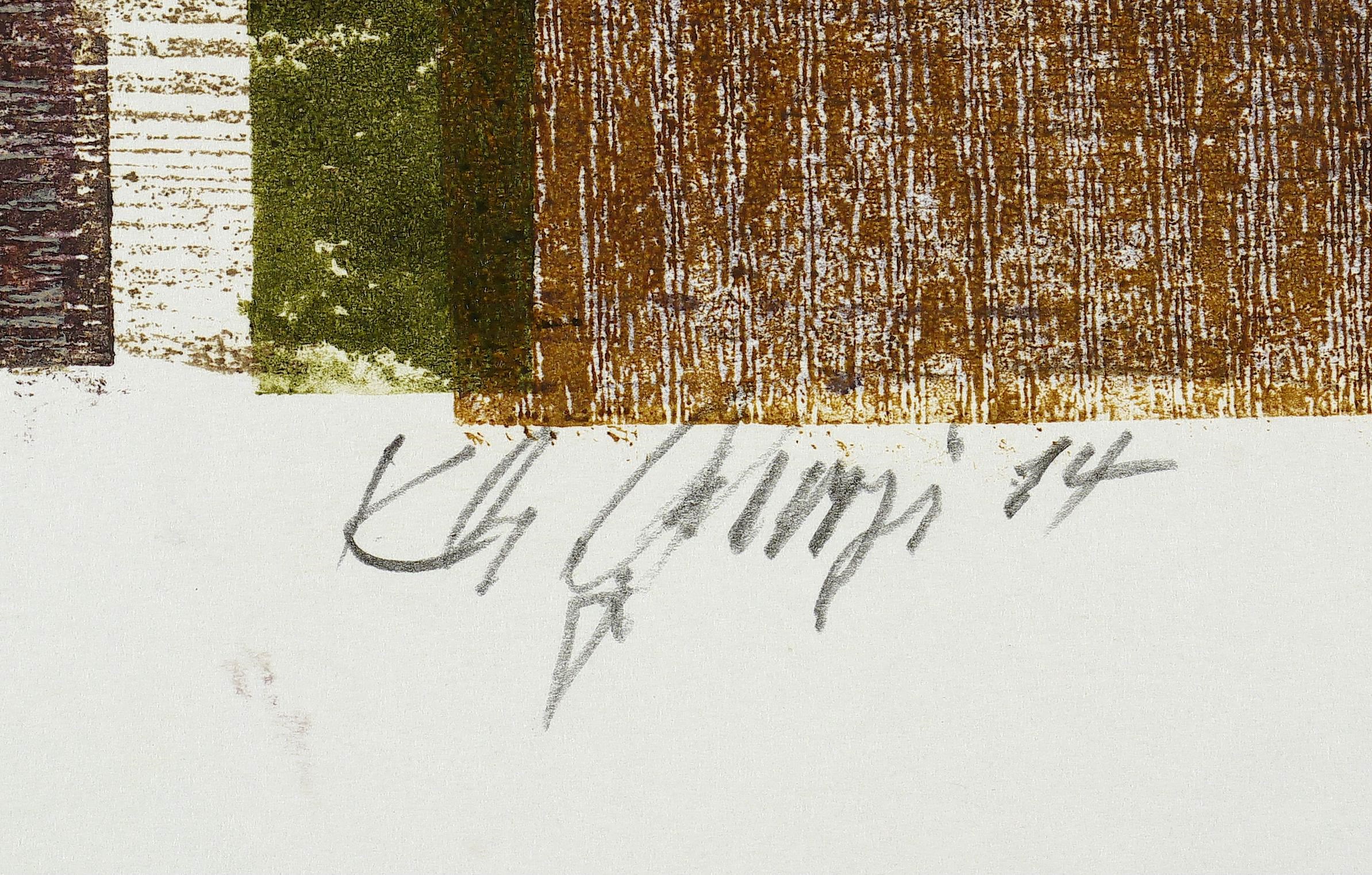 2014. Farbholzschnitt & Materialdruck, in 9 Farben, auf glattem weißem Velin. – Originale Künstlergrafik, von Karlheinz Georgi. – Auflage Exemplar 1/1 (Unikat). – 46,0 x 42,5 cm (Darstellung / Druckstock), 54,0 x 49,0 cm (Blatt).