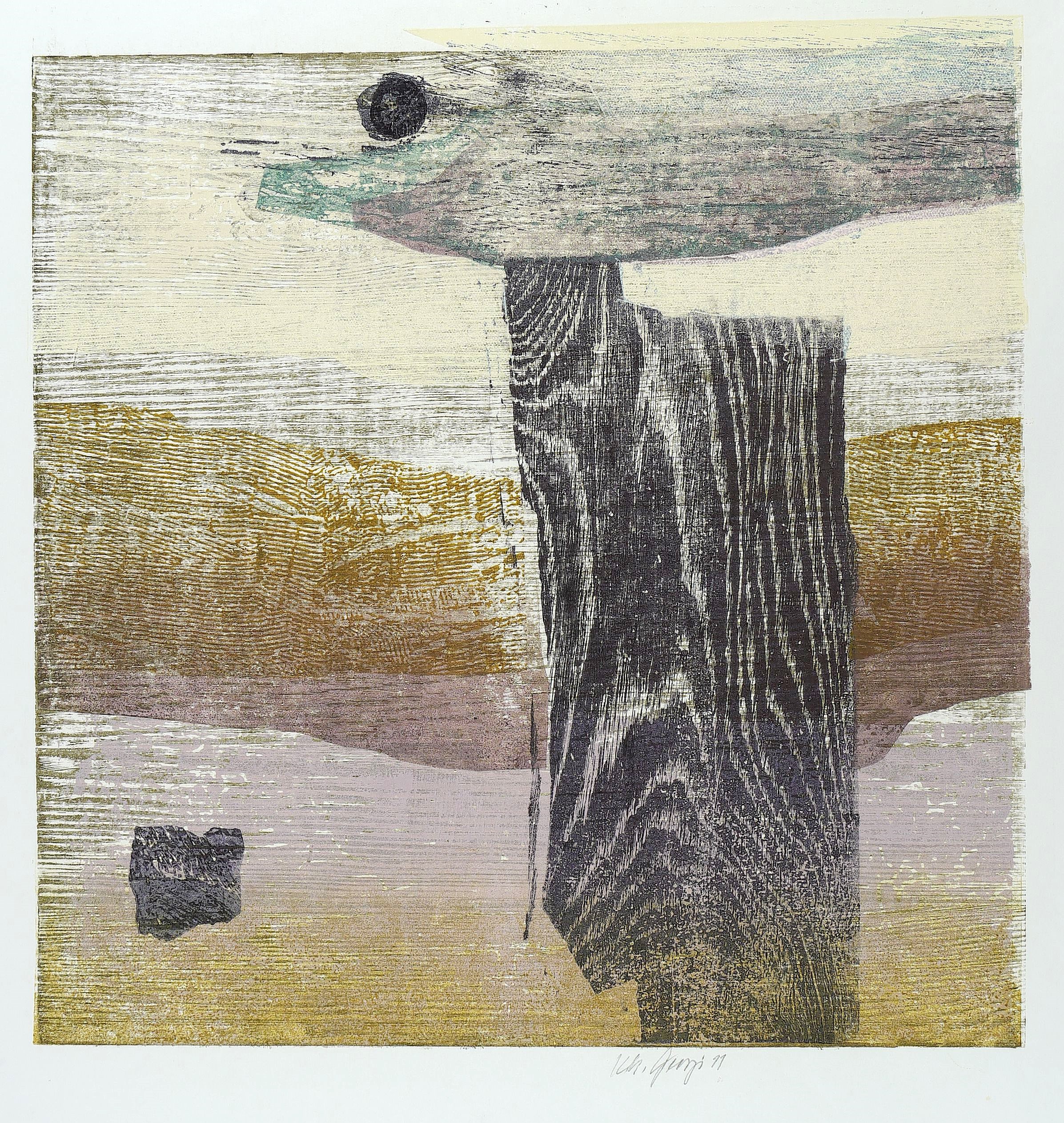 2011. Farbholzschnitt & Materialdruck, auf weißem Papier. – Originale Künstlergrafik, von Karlheinz Georgi. – Unikat. – 42,5 x 41,5 cm (Darstellung / Druckstock), 52 x 50 cm (Blatt).