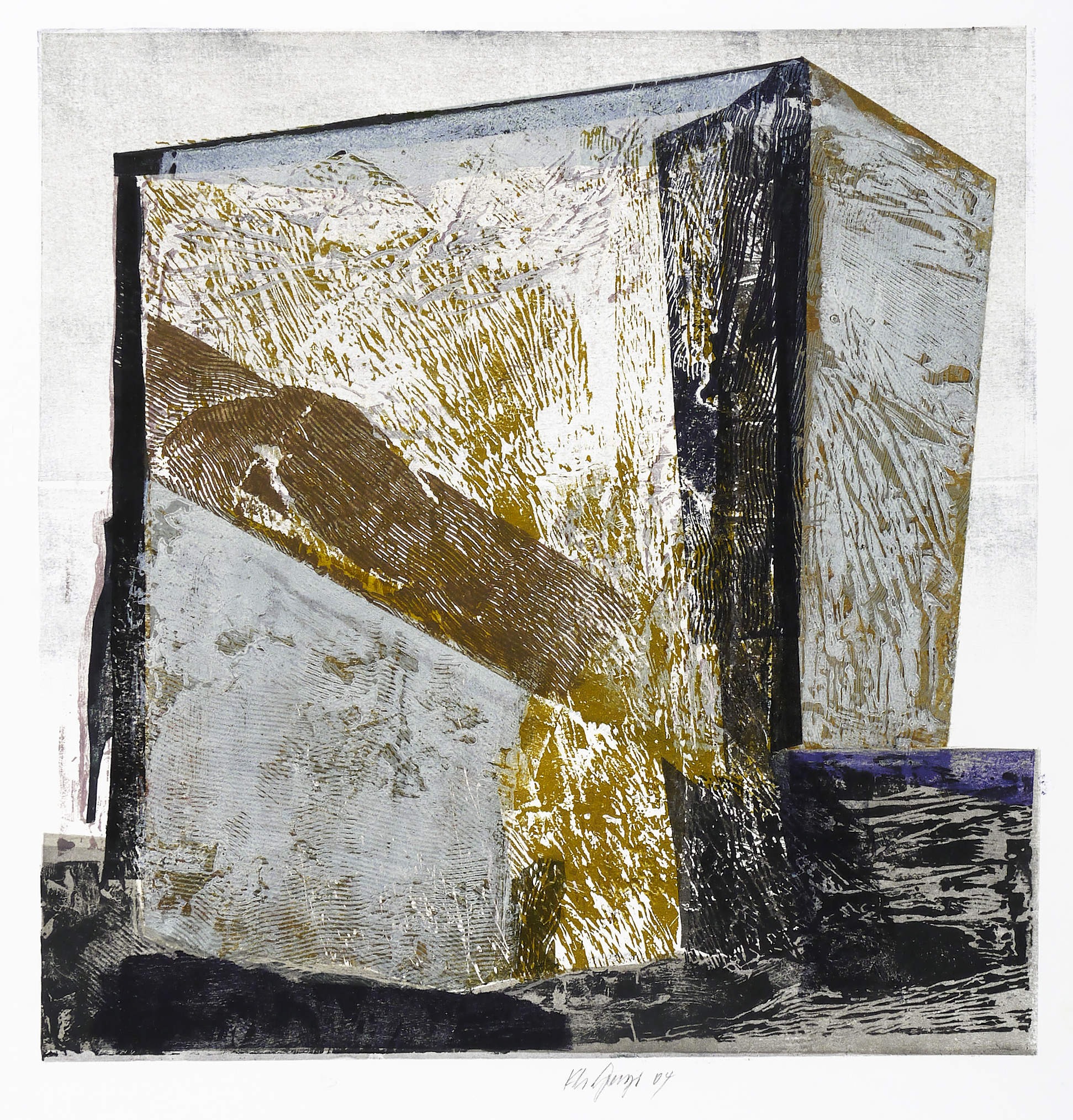2004. Farbholzschnitt & Materialdruck, in 7 Farben, auf glattem weißem Velin. – Originale Künstlergrafik, von Karlheinz Georgi. – Auflage Exemplar Nr. 1/1 (Unikat). – 43,4 x 42,2 cm (Darstellung / Druckbild), 54 x 49 cm (Blatt).