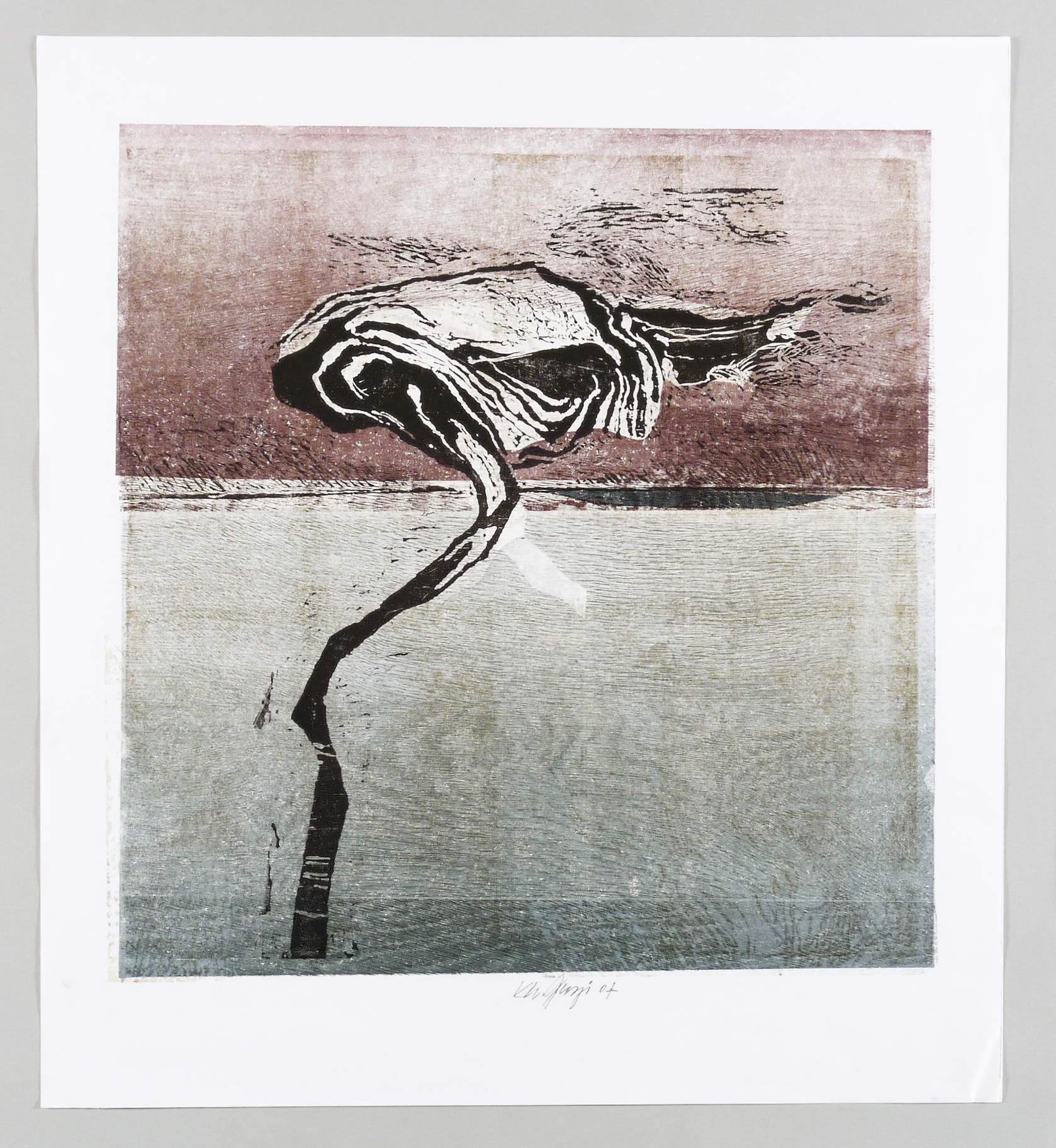 2007. Farbholzschnitt & Materialdruck, in 5 Farben, auf glattem weißem Velin. – Originale Künstlergrafik, von Karlheinz Georgi. – Auflage Exemplar 1/1 (Unikat). – 43,8 x 42,1 cm (Darstellung / Druckbild), 56 x 50 cm (Blatt).