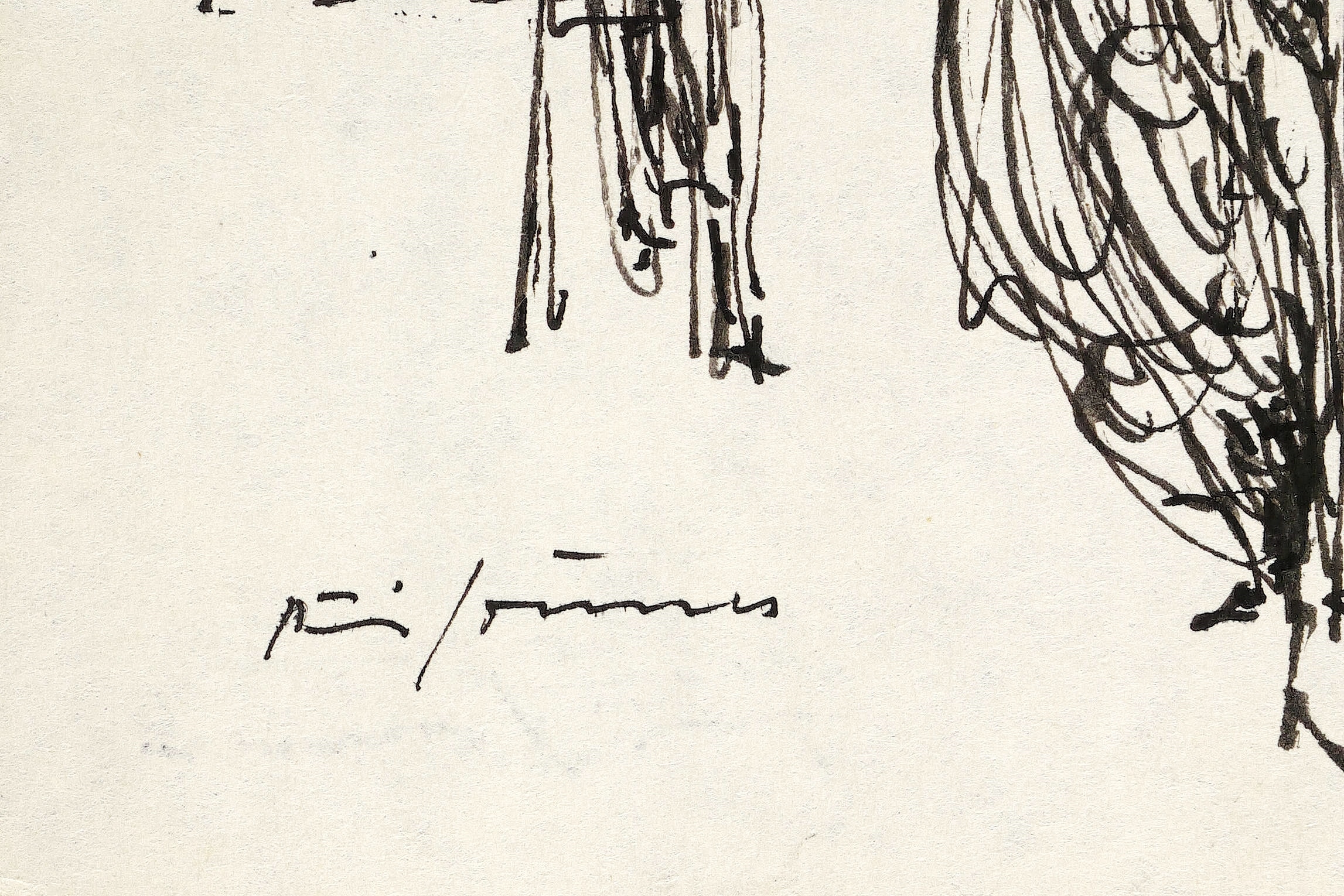 1950-1960. Zeichnung / Federzeichnung, in schwarzer Tusche, auf Papier. – Originale Künstlergrafik, von Rudi Gruner. – Unikat. – 21,1 x 14,8 cm (Darstellung / Blatt).
