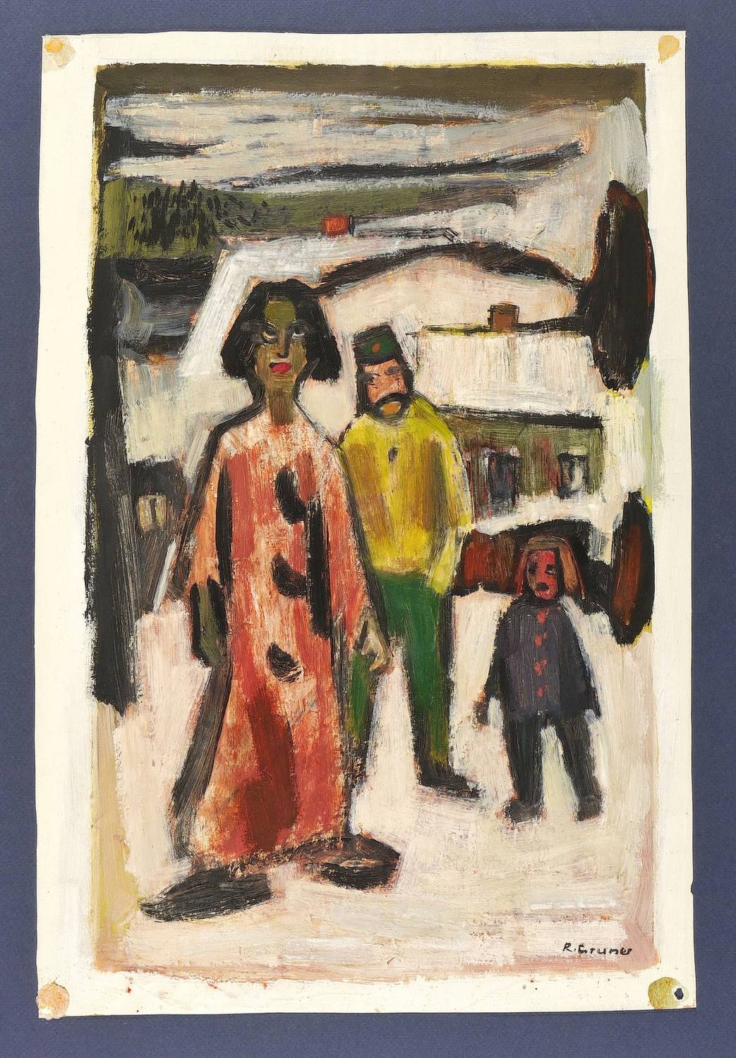 Rechts unten mit Pinsel in schwarzer Deckfarbe signiert: ″R. Gruner″. Verso in Bleistift bezeichnet: ″Assoziation / im Karneval der Kinder / nach dem Kriege″. – Unbeschnitten. Mit Klebepunkten der originalen Montierung hinter Passepartout in den Ecken. Sehr guter Zustand.