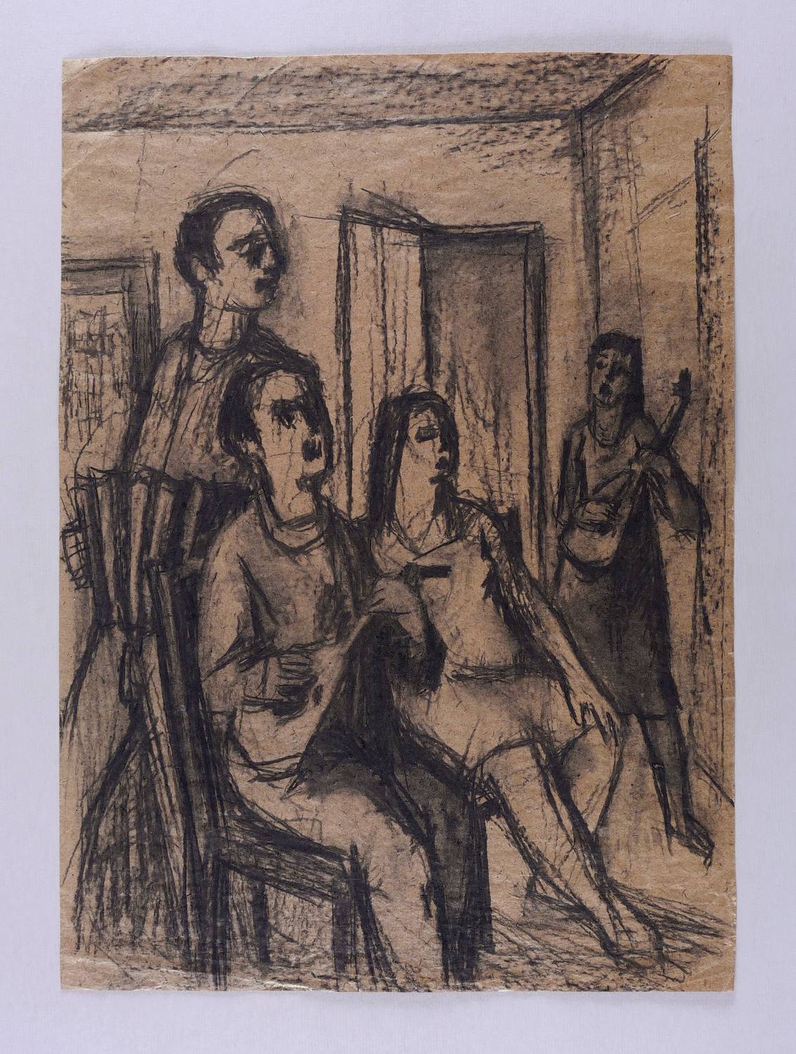 Um 1950. Zeichnung / Kohlezeichnung, partiell gewischt, auf grobem rötlich-braunem Papier. – Originale Künstlergrafik, von Rudi Gruner. – Unikat. – 50,1 x 36,2 cm (Darstellung / Blatt).