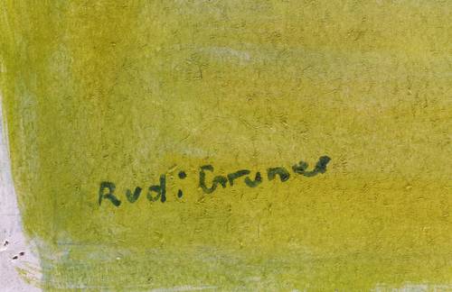 Links unten mit Pinsel in Wasserfarbe signiert: ″Rudi Gruner″. Verso nochmals signiert und bezeichnet. – Originale Reißzwecklöchlein im Rand. Verso Spuren ehemaliger Montierung. Im Randbereich rückseitig partiell geringfügig ausgedünnt. Insgesamt guter Zustand.