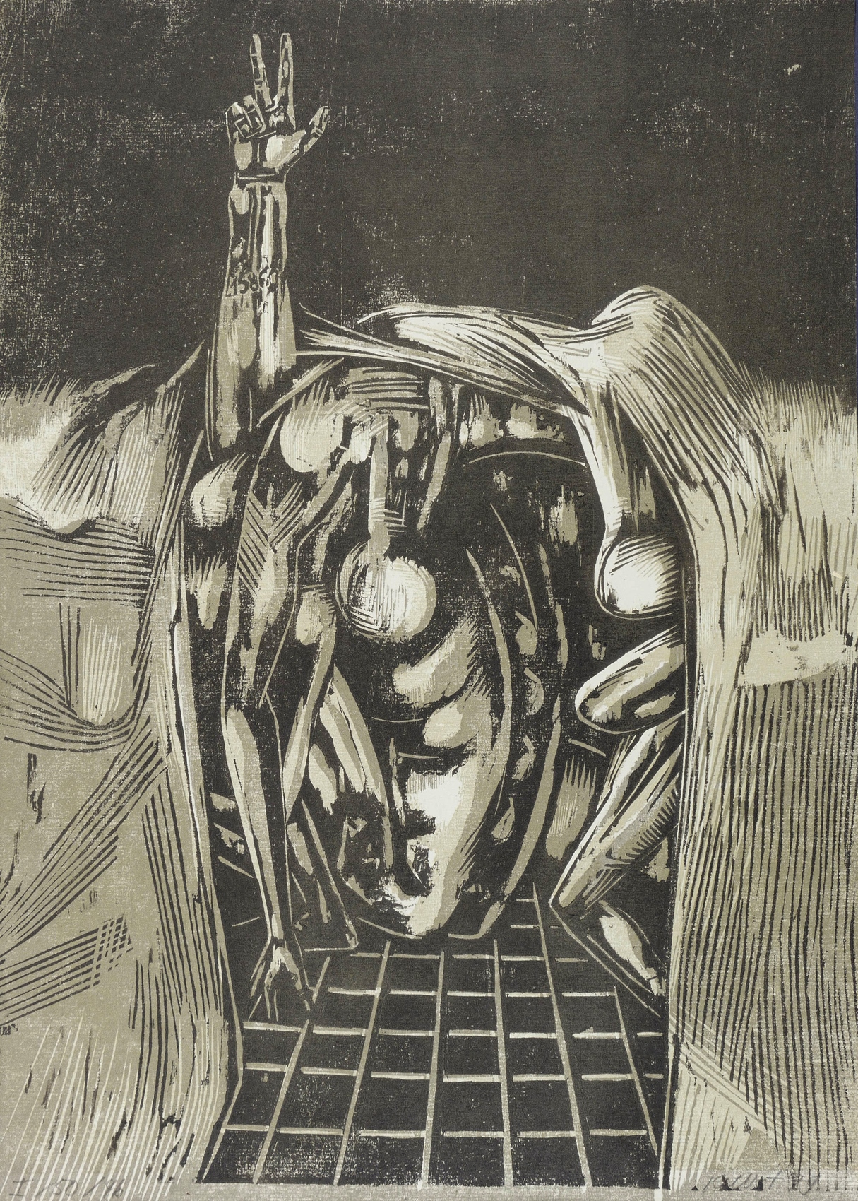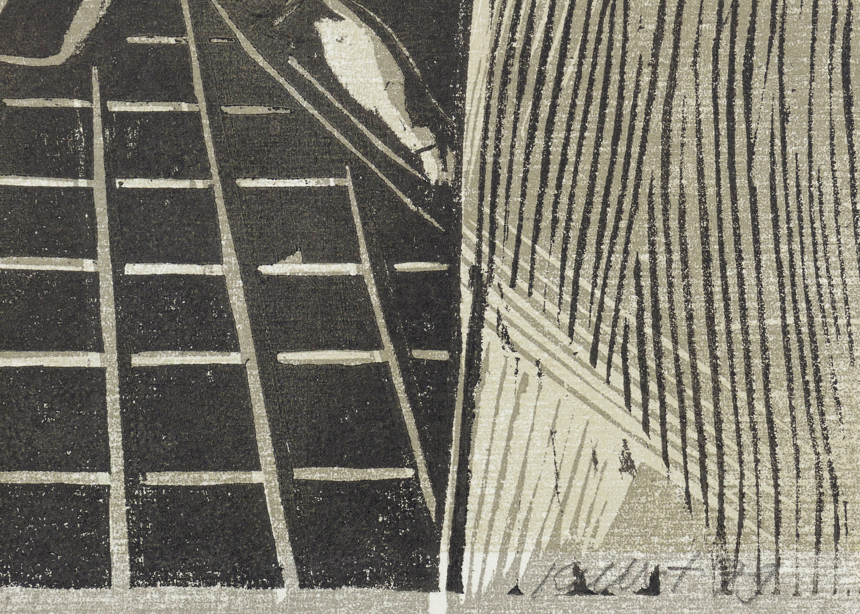 1979. Farbholzschnitt / Clair-obscure, in 3 Farben, auf hellgrauem Achat-Bütten. – Originale Künstlergrafik, von Rolf Kuhrt. – Auflage Exemplar Nr. 46/50. – 48,0 x 34,0 cm (Darstellung / Blatt).
