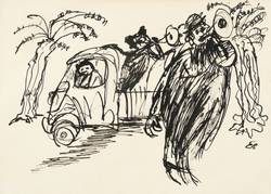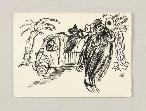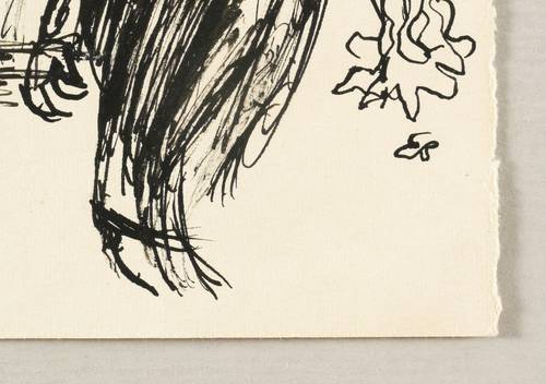 1986. Zeichnung / Federzeichnung, in schwarzer Tusche, auf hellchamois Velin. – Originale Künstlergrafik, von Egmont Schaefer. – Unikat. – 10,7 x 14,8 cm (Darstellung / Blatt).