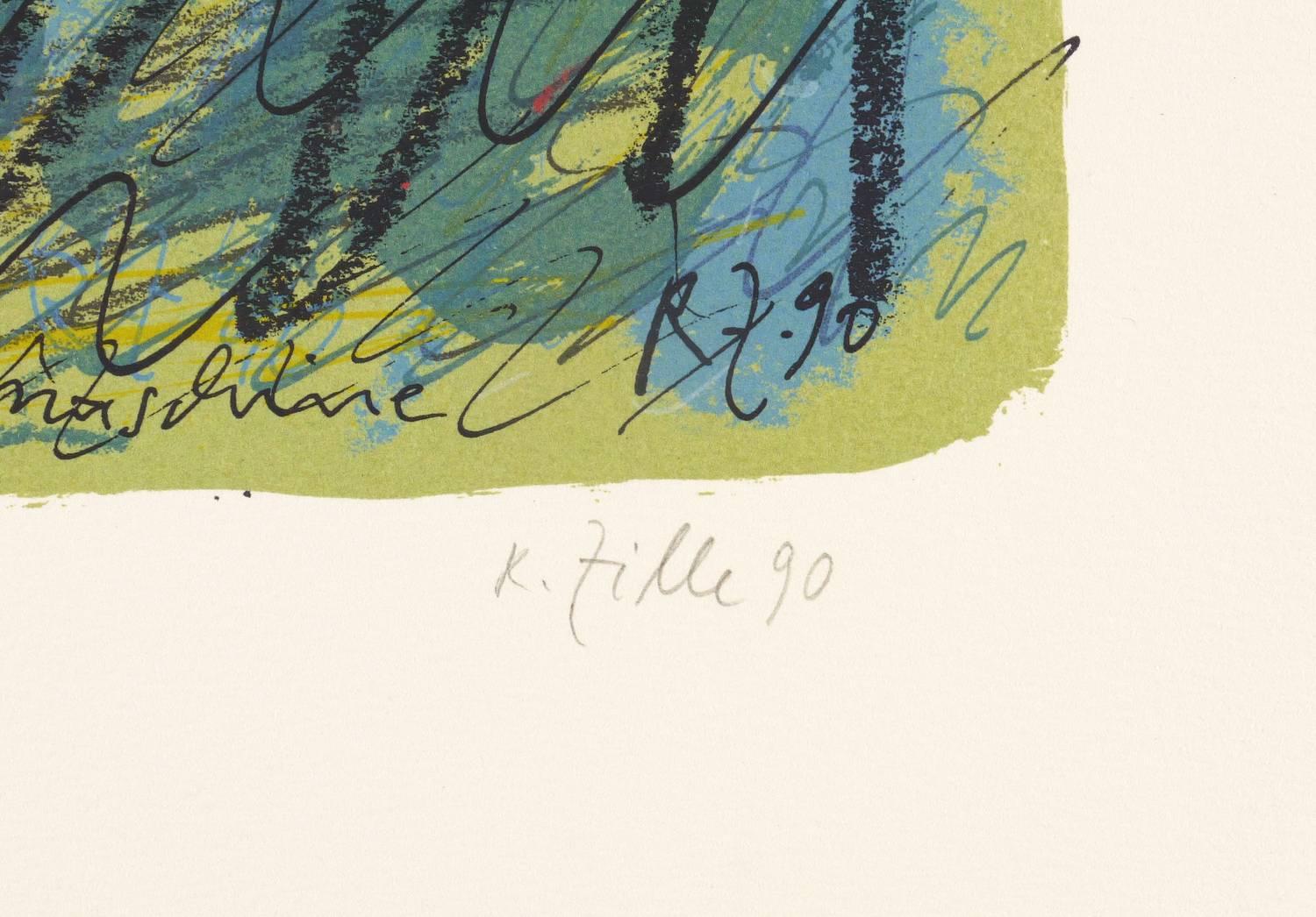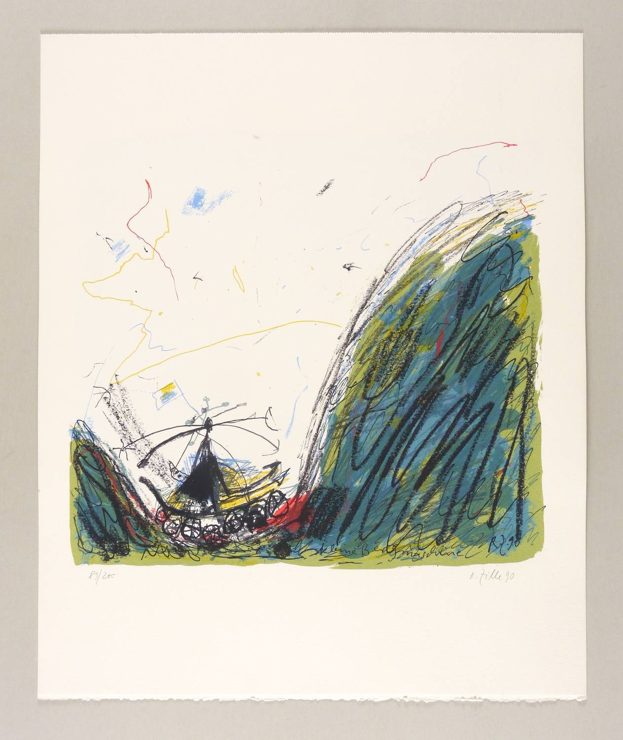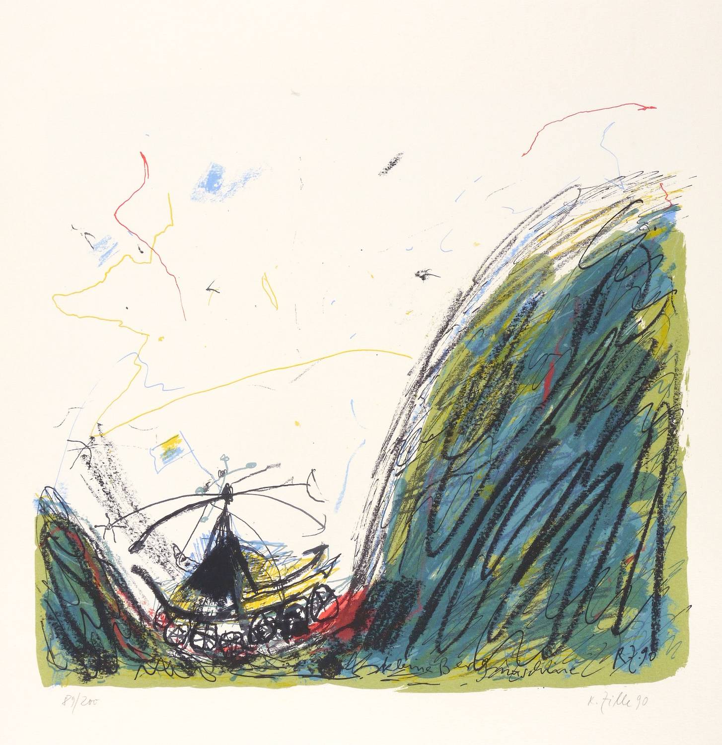 1990. Farblithografie / Kreide- & Pinsellithografie, in 7 Farben, auf kräftigem hellchamois Velinkarton. – Originale Künstlergrafik, von Rainer Zille. – Auflage Exemplar Nr. 89/200. – 33,5 x 36,5 cm (Darstellung / Druckbild), 52 x 43 cm (Blatt).