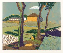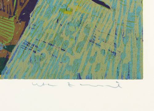1990-2000. Farbholzschnitt, in 6 Farben, auf weißem Werkdruck. – Originale Künstlergrafik, von Uta Zaumseil. – 35,2 x 42,3 cm (Darstellung / Druckbild), 43 x 57 cm (Blatt).