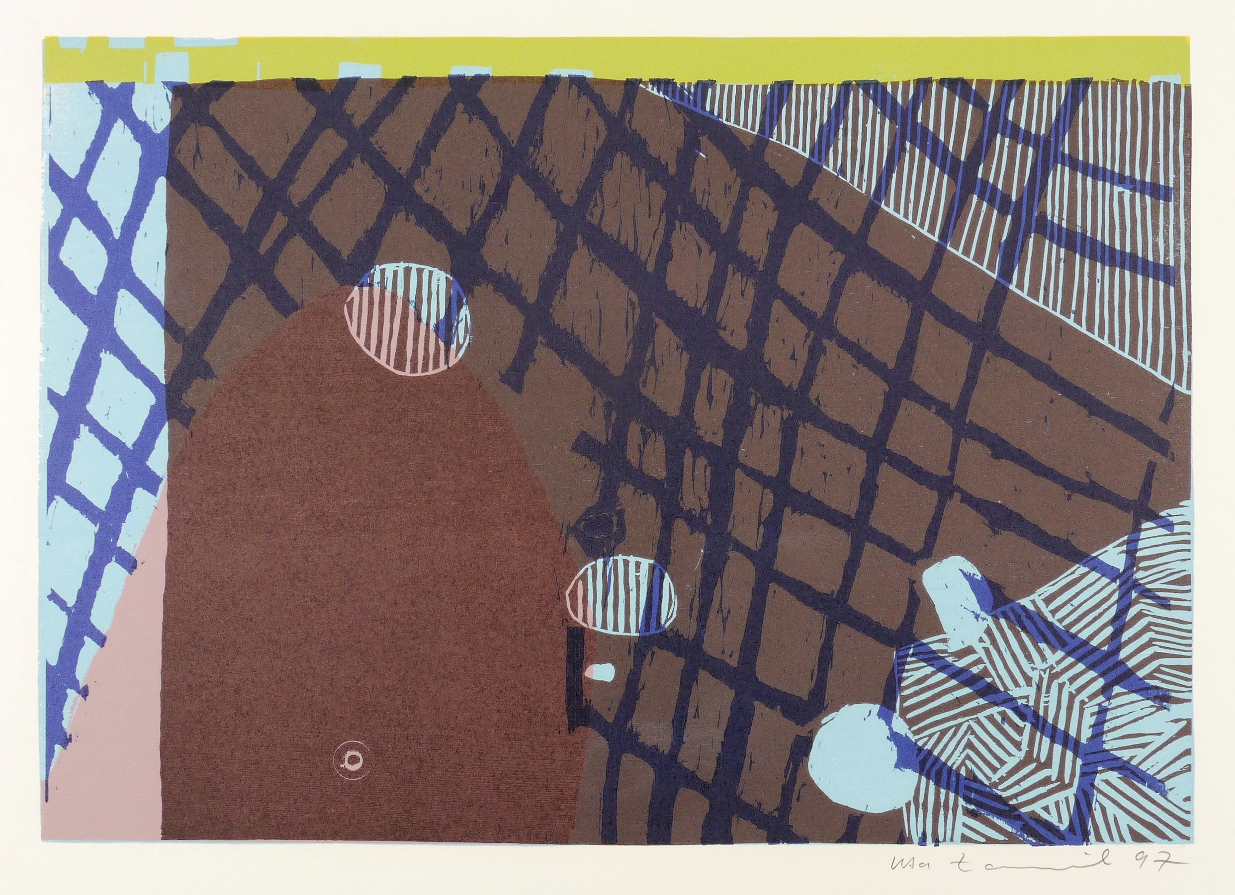 1997. Farbholzschnitt, in 5 Farben, auf weißem Werkdruck. – Originale Künstlergrafik, von Uta Zaumseil. – 32,0 x 45,3 cm (Darstellung / Druckstock), 46 x 56 cm (Blatt).