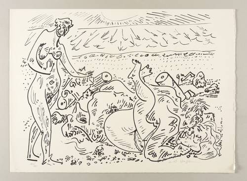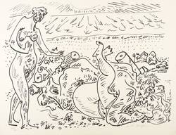 André Masson (1896 Balagny-sur-Thérain - 1987 Paris). Französischer Maler, Grafiker und Bildhauer. Ab 1910 Studium an der Kunstakademie in Brüssel, später bei Paul Baudoin an der École Nationale Supérieure des Beaux-Arts in Paris. Ab 1914 als Freiwilliger im 1. Weltkrieg, 1917 schwere Verletzung. Bezog Anfang der 1920er Jahre in der Rue Blomet in Paris ein Atelier neben seinem Freund Joan Miró. Anfangs dem Kubismus zuneigend schloss er sich 1924 den Surrealisten an. In dieser Phase entwickelte er eine lyrische, spontan-abstrakte Malerei, als Psychischer Automatismus (écriture automatique) bezeichnet, um bewusst Irrationales und Unterbewusstes zur Anschauung zu bringen. Freundschaft mit Michel Leiris und Georges Bataille. 1928 illustrierte er den erotischen Roman "Le Con d'Irène" von Louis Aragon. 1938 Beteiligung an der Exposition Internationale du Surréalisme in Galerie Beaux-Arts Paris. 1942 Emigration aus Spanien in die USA. 1945 Rückkehr nach Frankreich. 1955, '59 und '64 Teilnahme an der documenta in Kassel. Neben Malerei und Grafik bzw. Illustration schuf er auch Skulpturen und Bühnenbilder. Im Théatre Odéon in Paris entstand ein Deckengemälde.