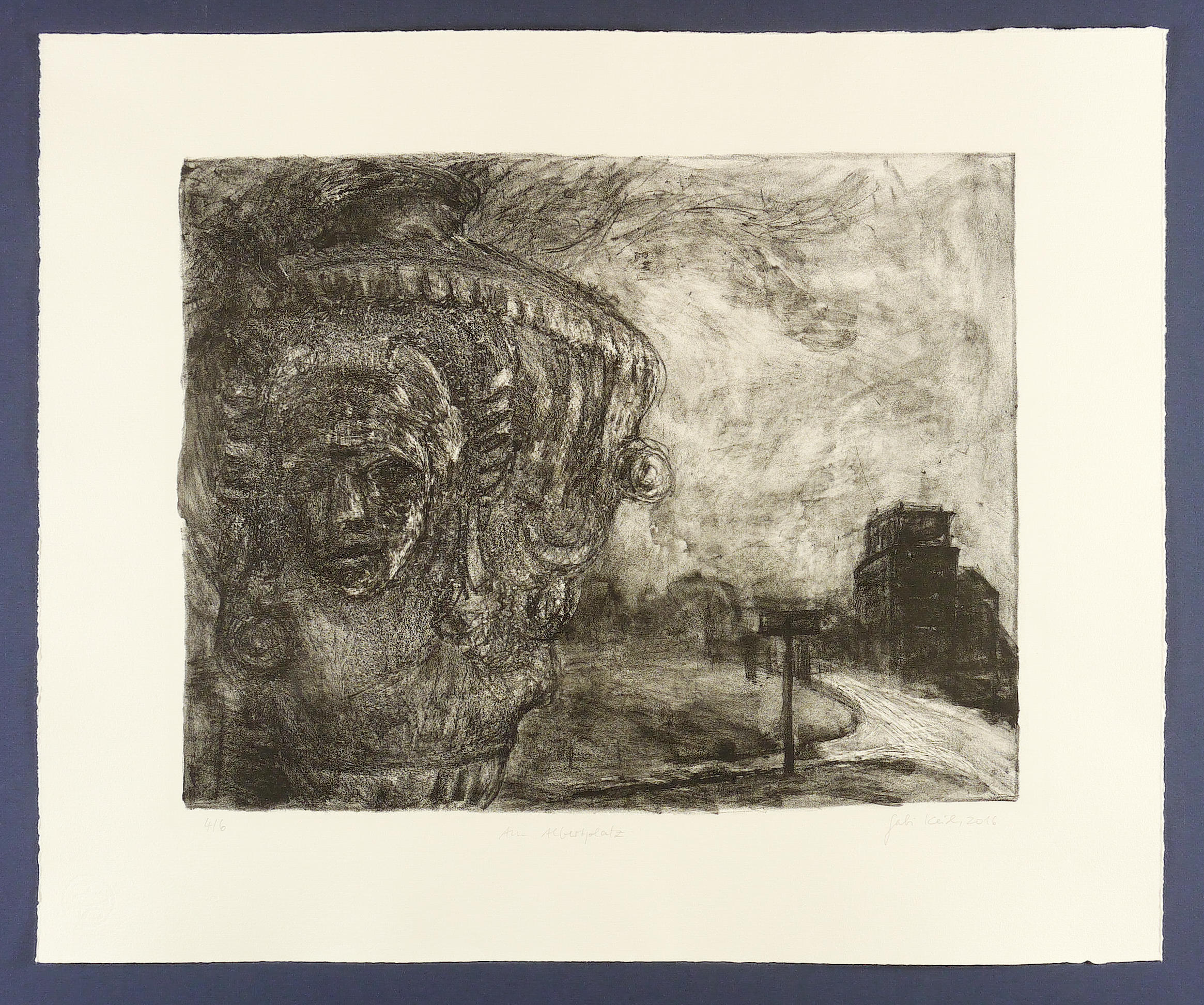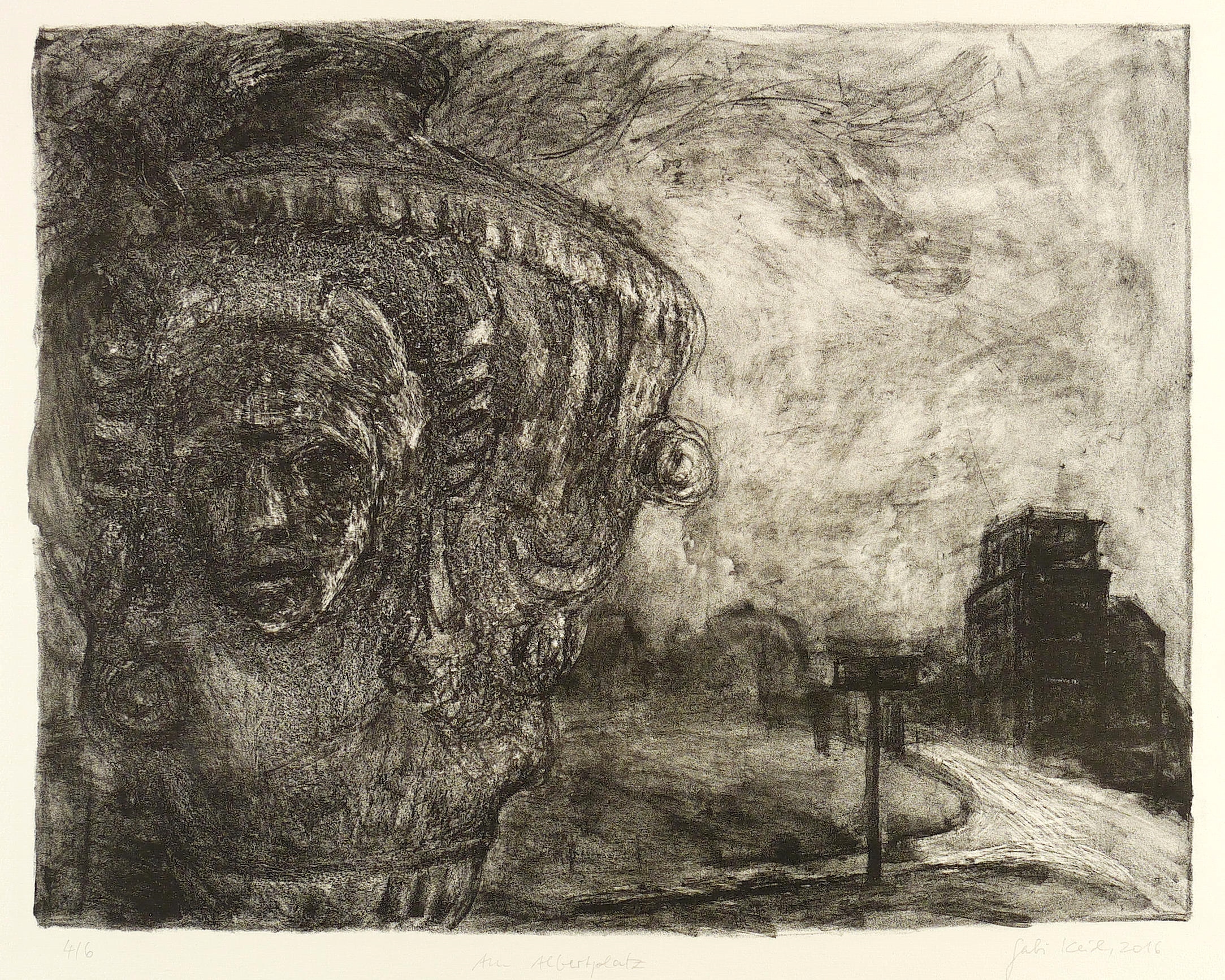 2016. Lithografie / Kreidelithografie, in Schwarz, auf Hahnemühle-Büttenpapier. – Originale Künstlergrafik, von Gabi Keil. – Auflage Exemplar Nr. 4/6. – 38,0 x 48,5 cm (Darstellung), 53,5 x 65,5 cm (Blatt).