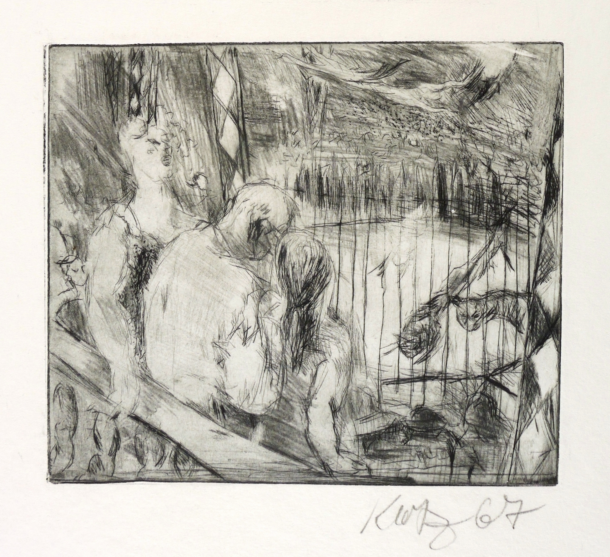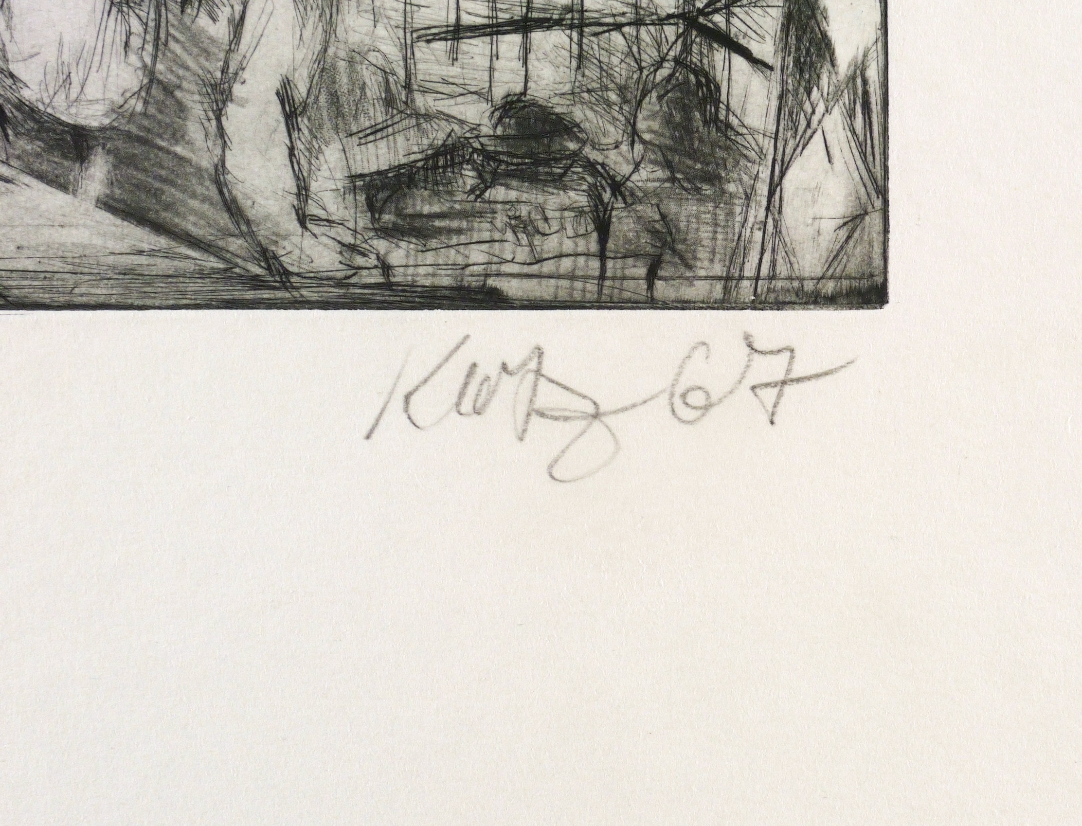 1967. Radierung / Kaltnadel & Roulette, mit Plattenton, in Schwarz, auf hellchamois Velinkarton. – Originale Künstlergrafik, von Siegfried Klotz. – 15,8 x 18,5 cm (Darstellung / Platte), 50 x 37 cm (Blatt).