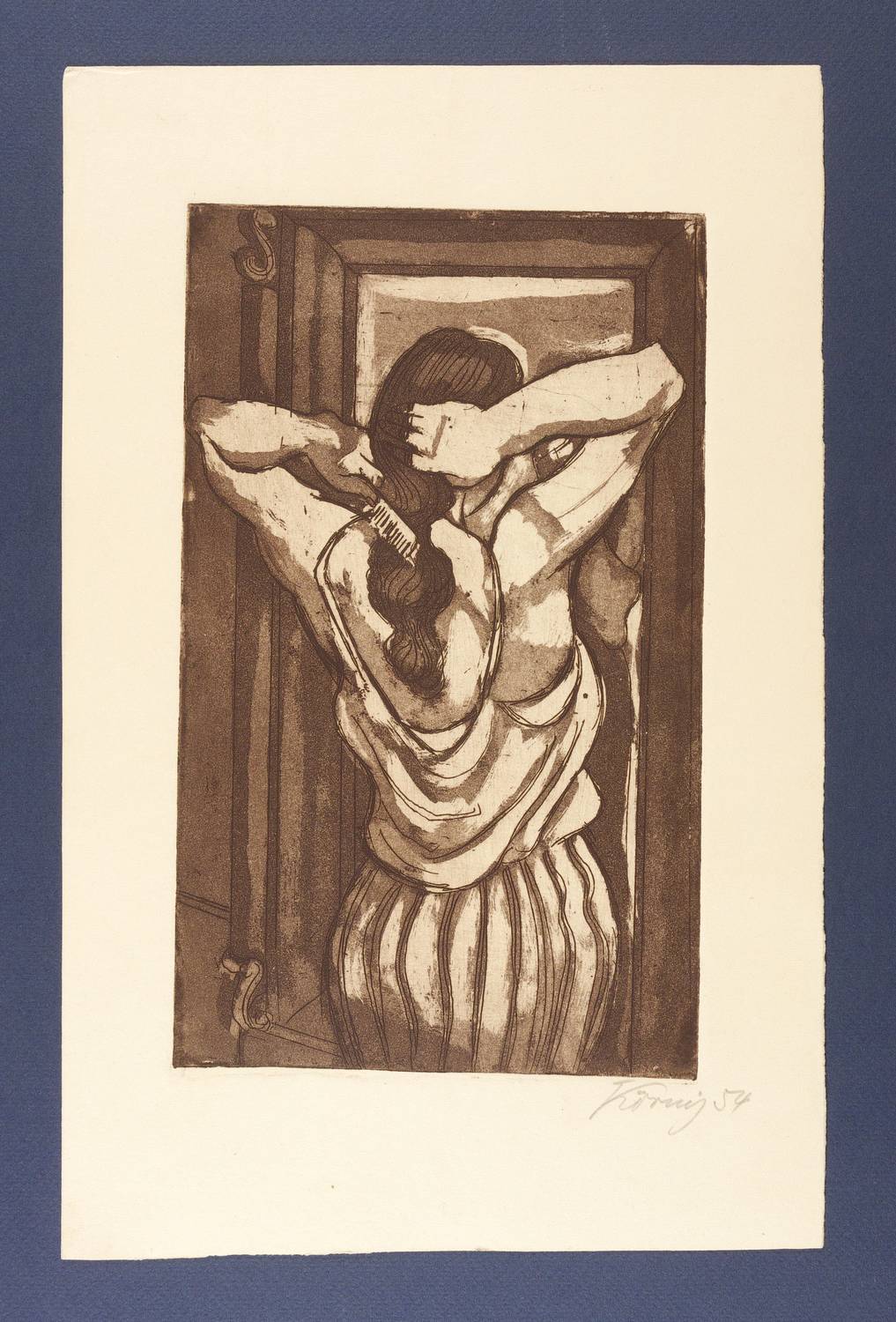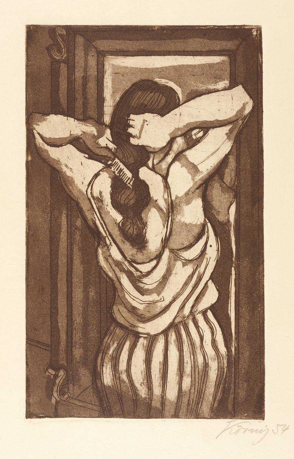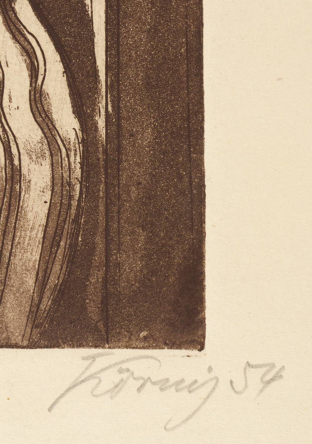 1954. Radierung / Aquatinta & Strichätzung, in Dunkelbraun, auf gelblichem Velin. – Originale Künstlergrafik, von Hans Körnig. – 24,4 x 14,9 cm (Darstellung / Platte), 34 x 22 cm (Blatt).