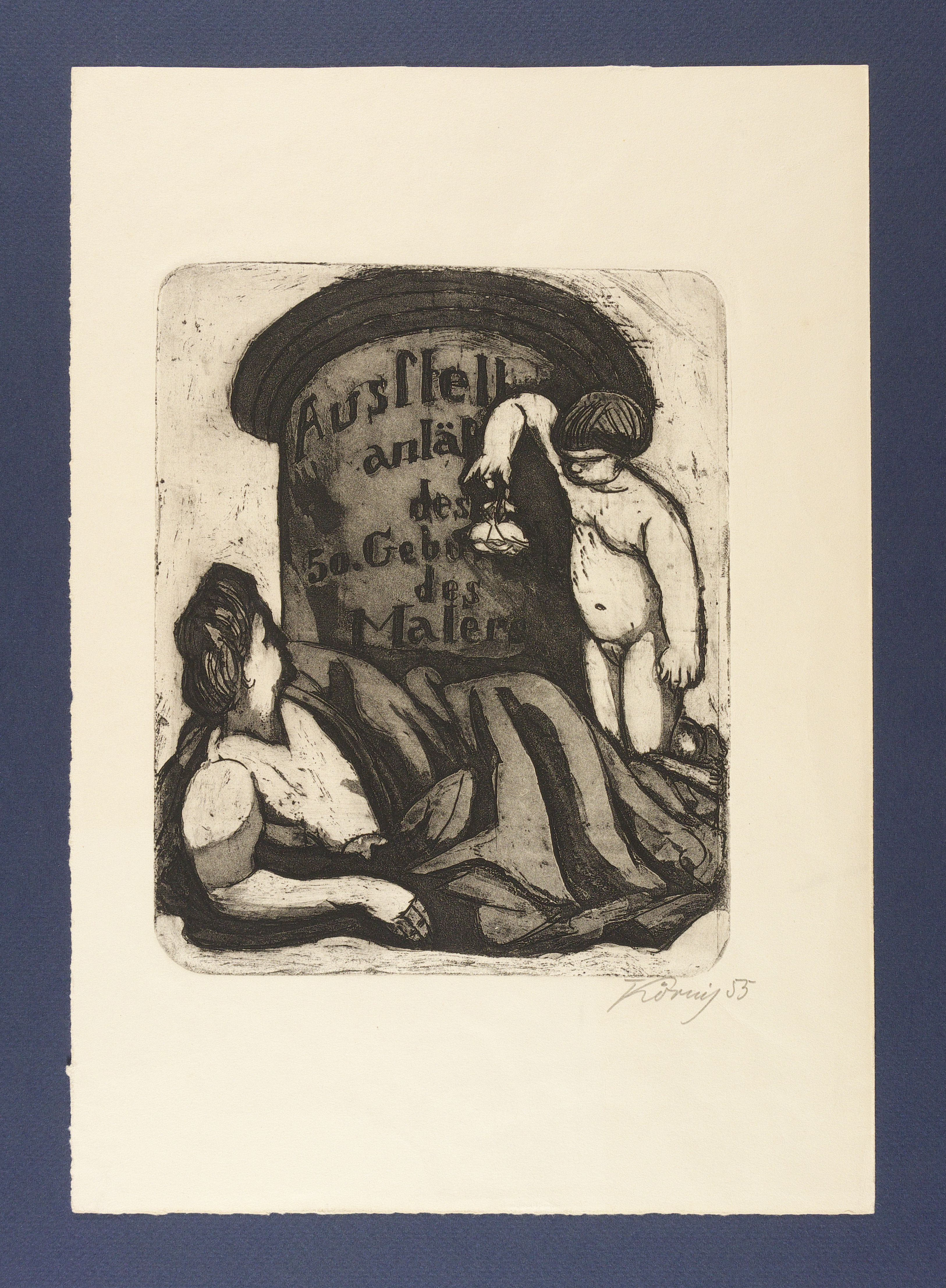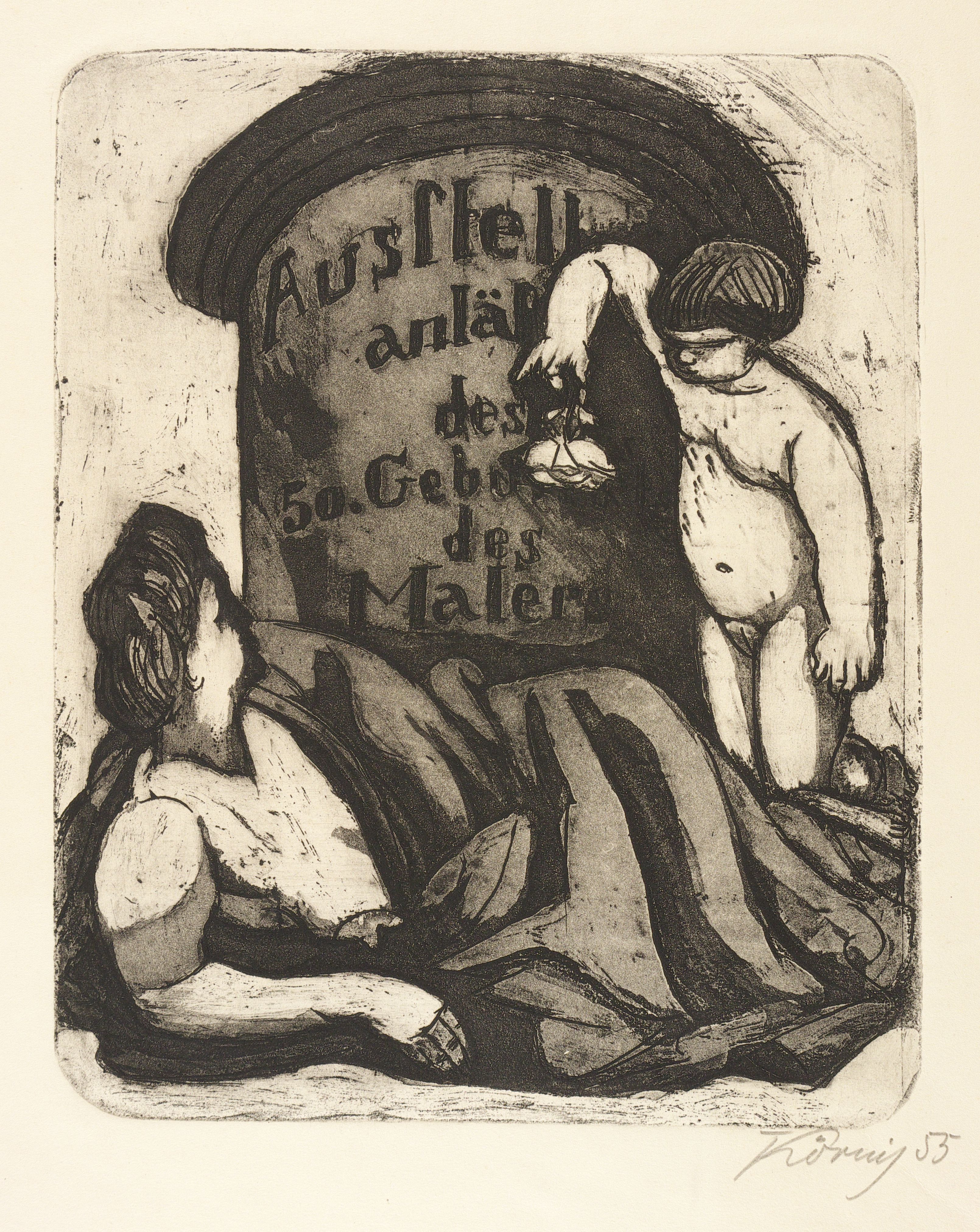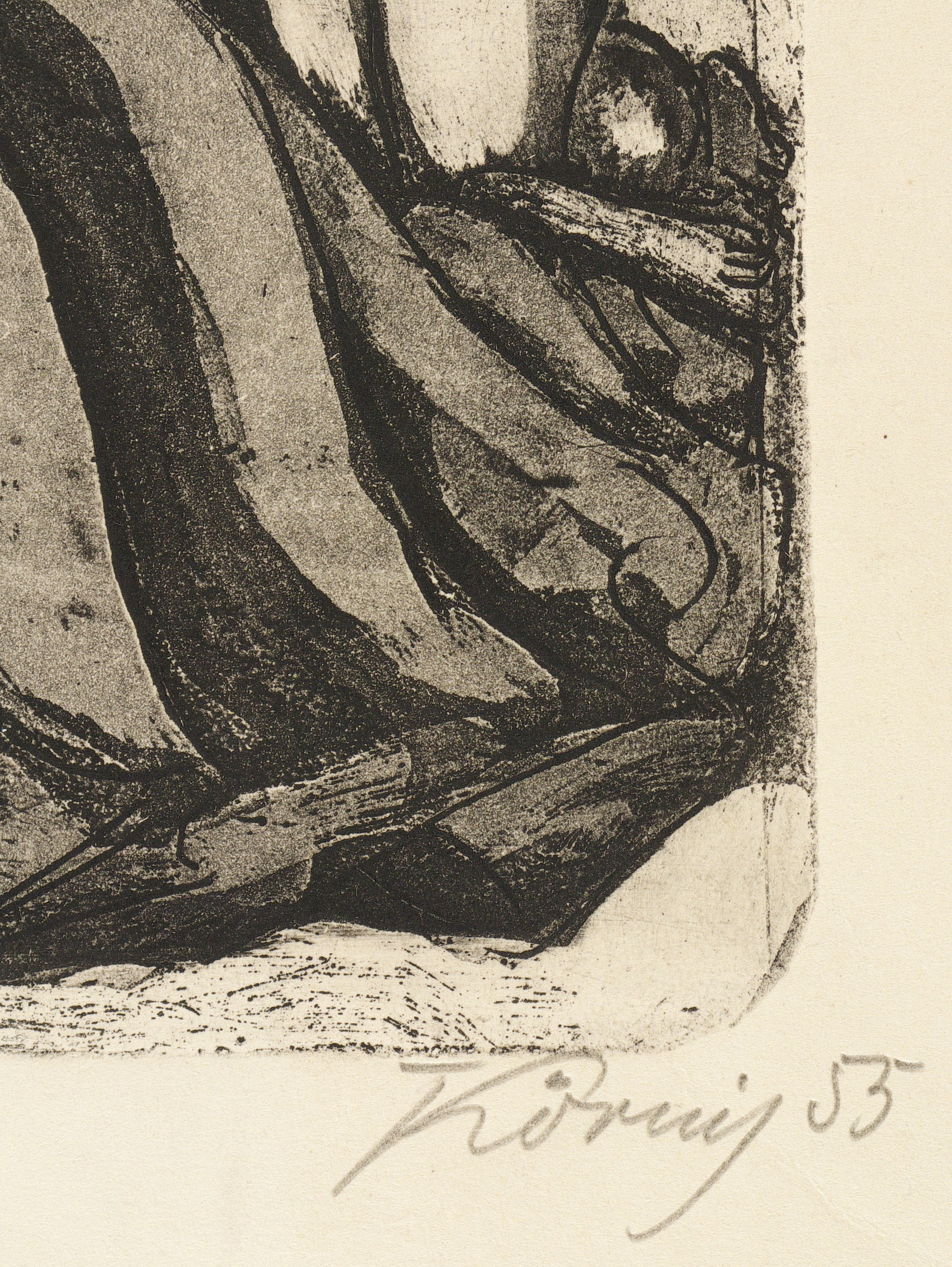 Rechts unten in Bleistift signiert und datiert: ″Körnig 55″. – Ältere liegende Frau und kleines Mädchen vor Litfaßsäule mit Ausstellungsplakat. – Papier etwas gebräunt und leicht berieben. Minimal knickspurig. Guter Zustand.