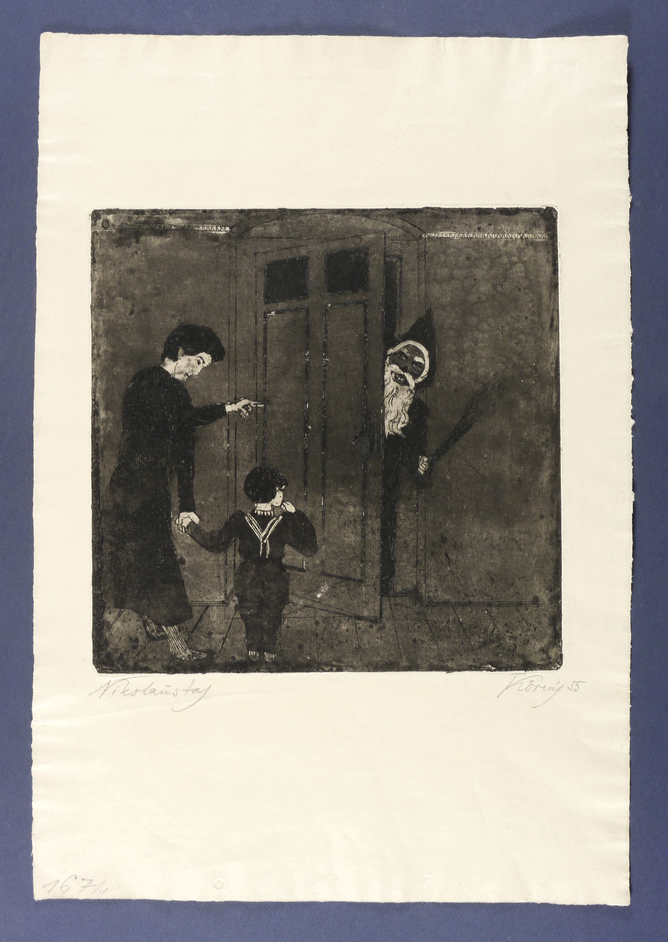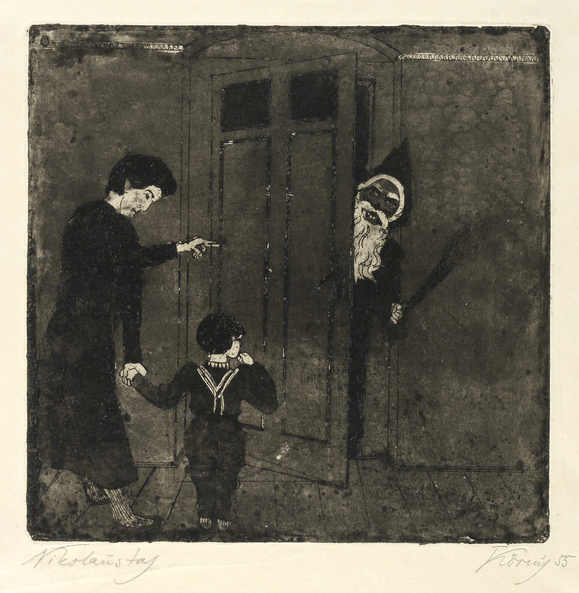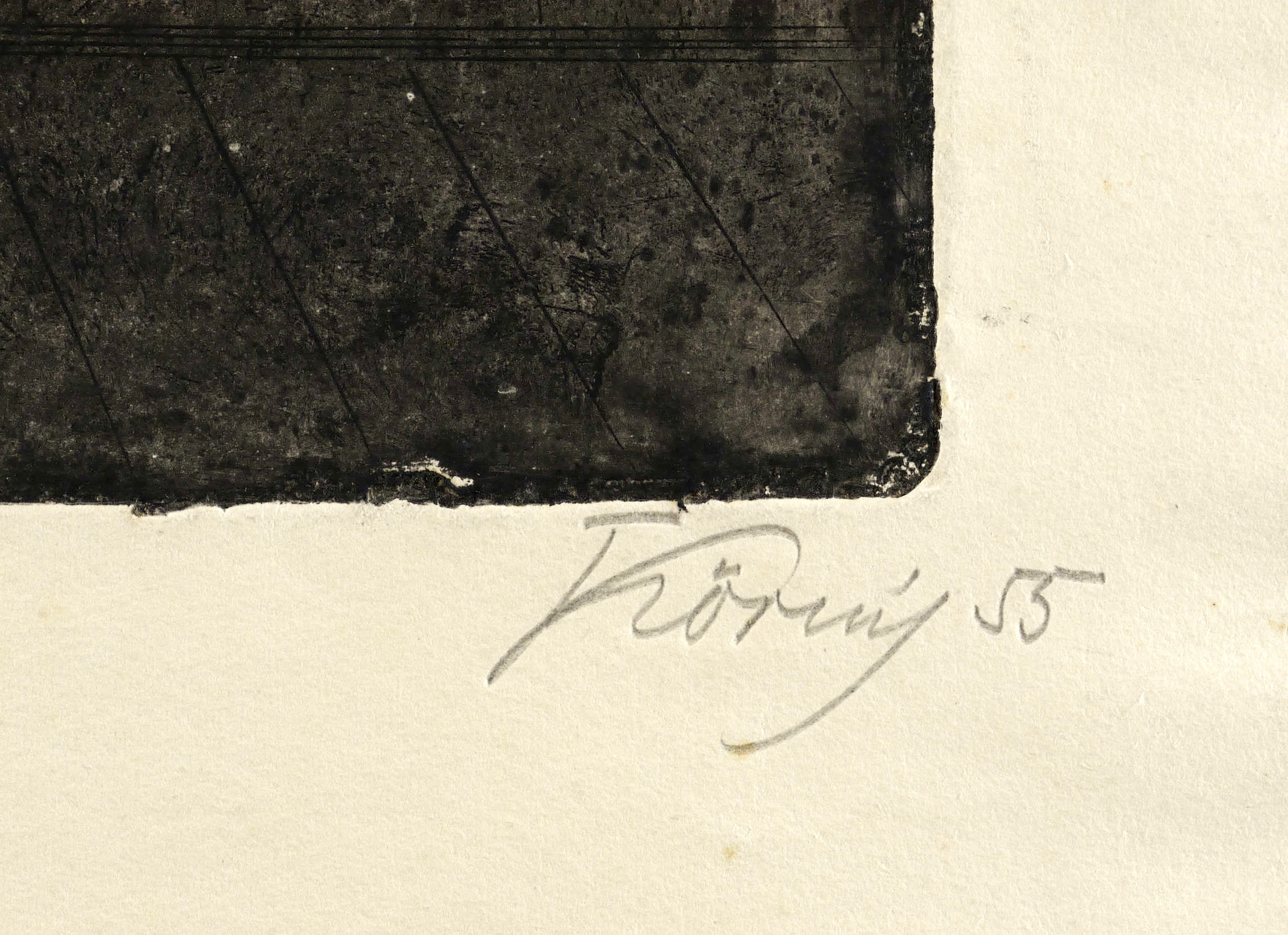 1955. Radierung / Aquatinta, in Schwarz, auf gelbem Büttenkarton. – Originale Künstlergrafik, von Hans Körnig. – Auflage Exemplar Nr. 167/1. – 32,2 x 32,5 cm (Darstellung / Platte), 60 x 41 cm (Blatt).