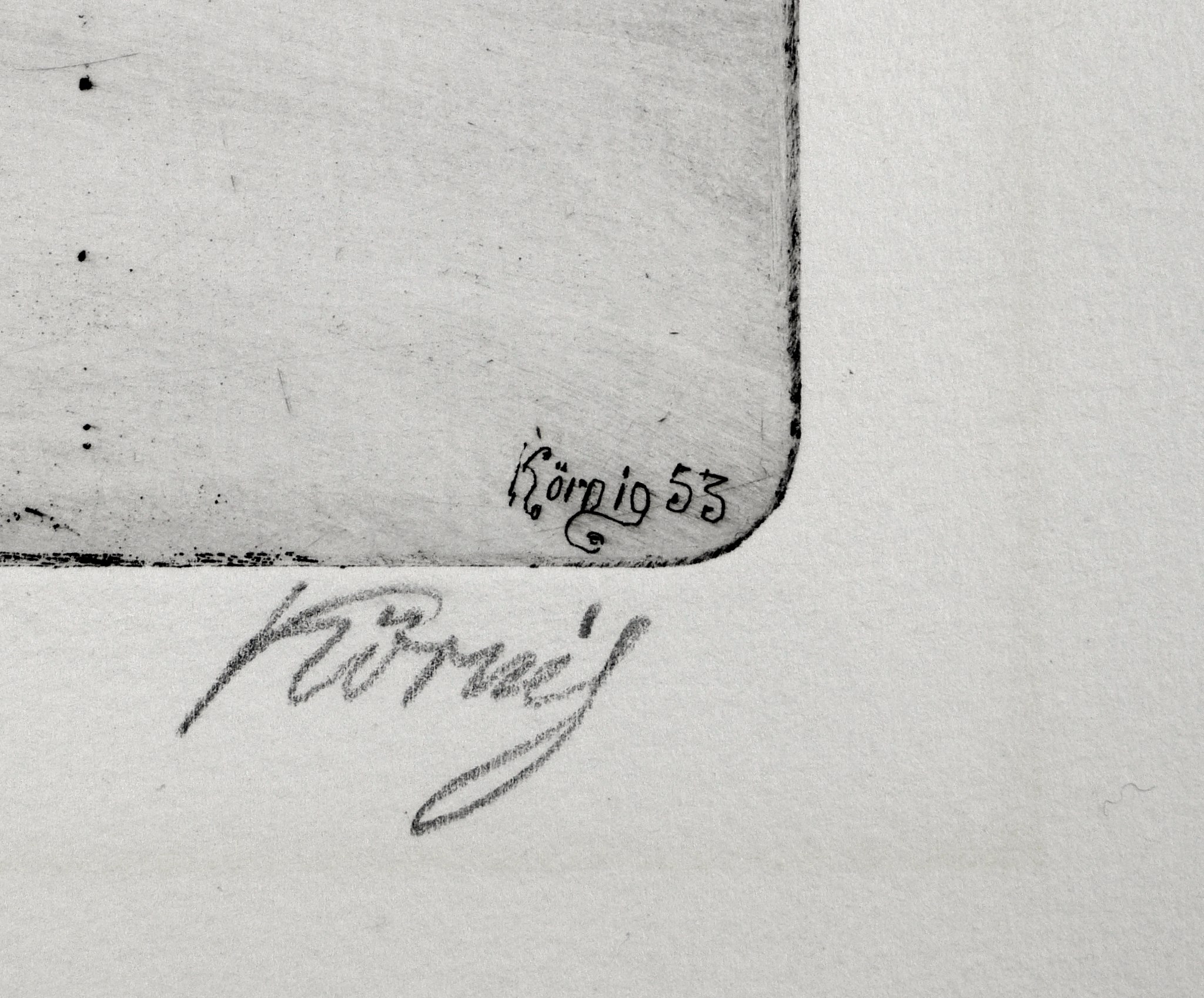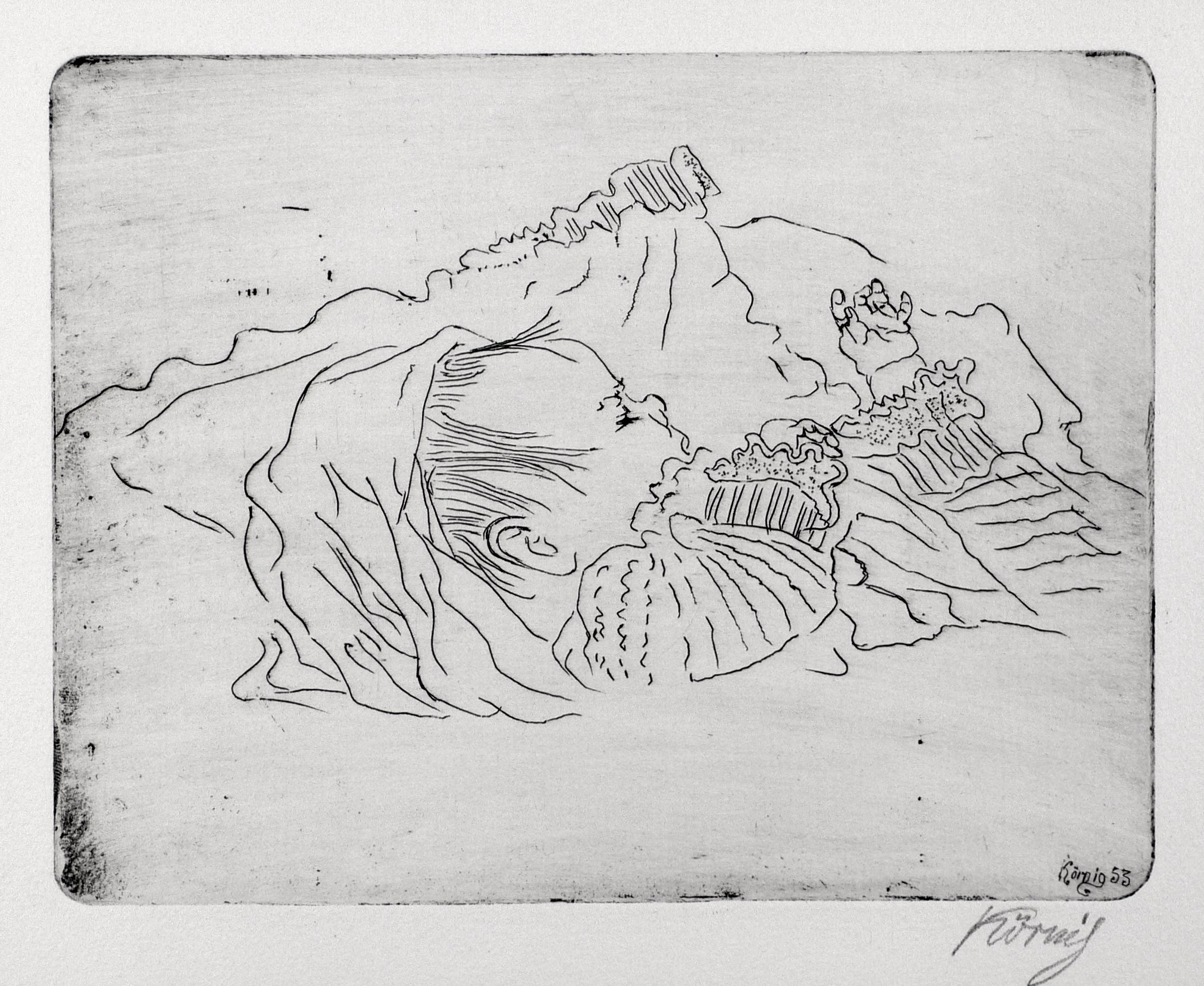 1953. Radierung / Strichätzung, mit Plattenton, in Schwarz, auf Velinkarton. – Originale Künstlergrafik, von Hans Körnig. – Auflage Exemplar Nr. 19/23. – 15,6 x 20,5 cm (Darstellung / Platte), 25 x 31 cm (Blatt).