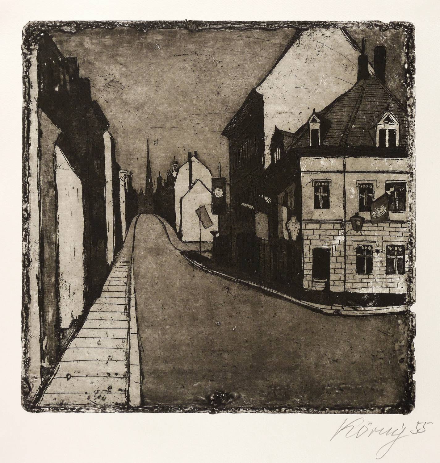 Hans Körnig (1905 Flöha - 1989 Niederwinkling in Bayern). Deutscher Maler und Grafiker, bedeutender Vertreter der Dresdner Malerei in den 1950er und 60er Jahren. Nach einer Elektrikerlehre 1930-33 Studium an der Kunstakademie Dresden bei Richard Müller und Hermann Dittrich, später bei Ferdinand Dorsch und Max Feldbauer. 1933 verließ er die Akademie aus Protest gegen die Entlassung von Otto Dix. Danach Arbeit als freier Künstler und Reisen nach Italien (Venedig, Florenz, Rom, Neapel, Mailand & Gardasee), die Schweiz und schließlich 1937 Paris. 1940 Kriegsdienst an der Russlandfront, 1945 Amputation des rechten Unterschenkels infolge einer Verwundung. August 1945 Rückkehr aus russischer Kriegsgefangenschaft nach Dresden. 1953 erste Versuche mit Aquatintaradierung, die er forthin besonders pflegte (insgesamt über 1000 Radierungen). Organisierte mangels offizieller Ausstellungsmöglichkeiten die berühmten 'Dachboden-Ausstellungen' in seinem Atelier im Dresdner Wallgässchen. Wegen dem Bild 'Straße der Befreiung' 1958 Ausschluß aus dem Verband Bildender Künstler. Weilte während dem Mauerbau 1961 mit seiner Familie in Holland und blieb im Westen, das Werk wurde in Dresden beschlagnahmt und blieb bis 1990 unzugänglich. Arbeitete dann in Niederbayern, wo er sich, vereinsamt, verarmt und erblindet, das Leben nahm.
