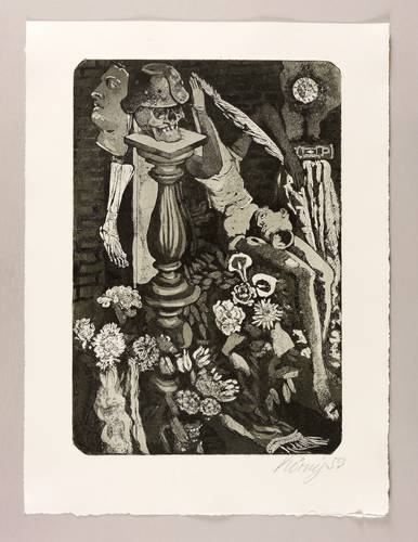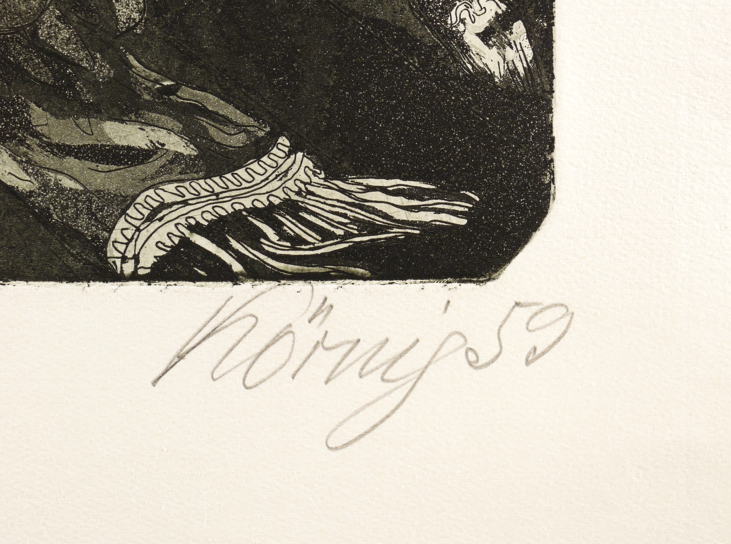 WVZ 250. – Rechts unten in Bleistift signiert und datiert: ″Körnig 59″. Verso Auflagenbezeichnung und WVZ-Nr. Wasserzeichen der Hahnemühle. – Für die Mappe ″Fastnachtsspuk im Wallgäßchen″ (Dresden: eikon Grafik Presse 1988) gedruckt. – Sehr gut erhalten.