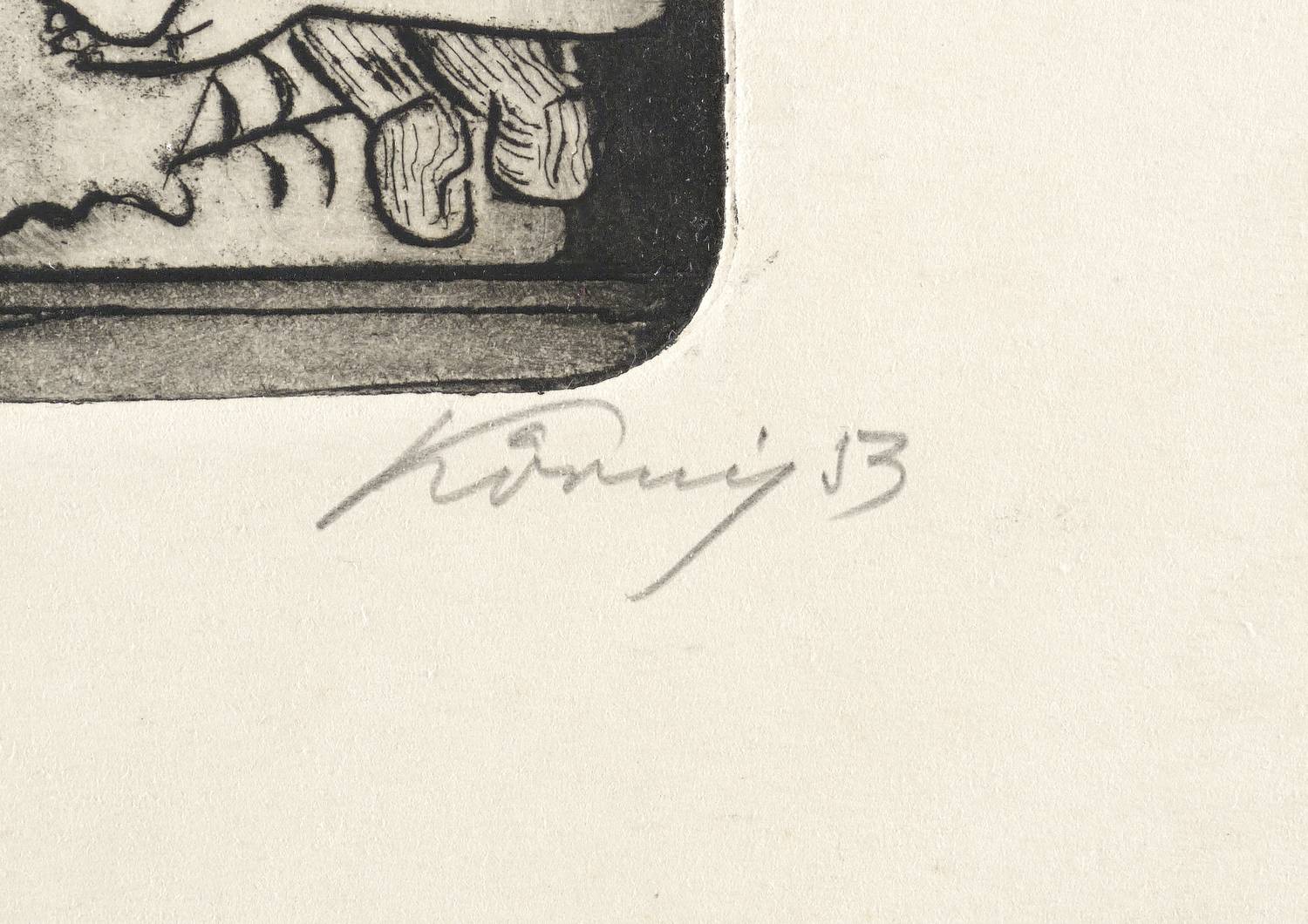 1953. Radierung / Aquatinta & Strichätzung, in Schwarz, auf kräftigem chamois Velinkarton. – Originale Künstlergrafik, von Hans Körnig. – 13,2 x 7,0 cm (Darstellung / Platte), 24 x 18 cm (Blatt).