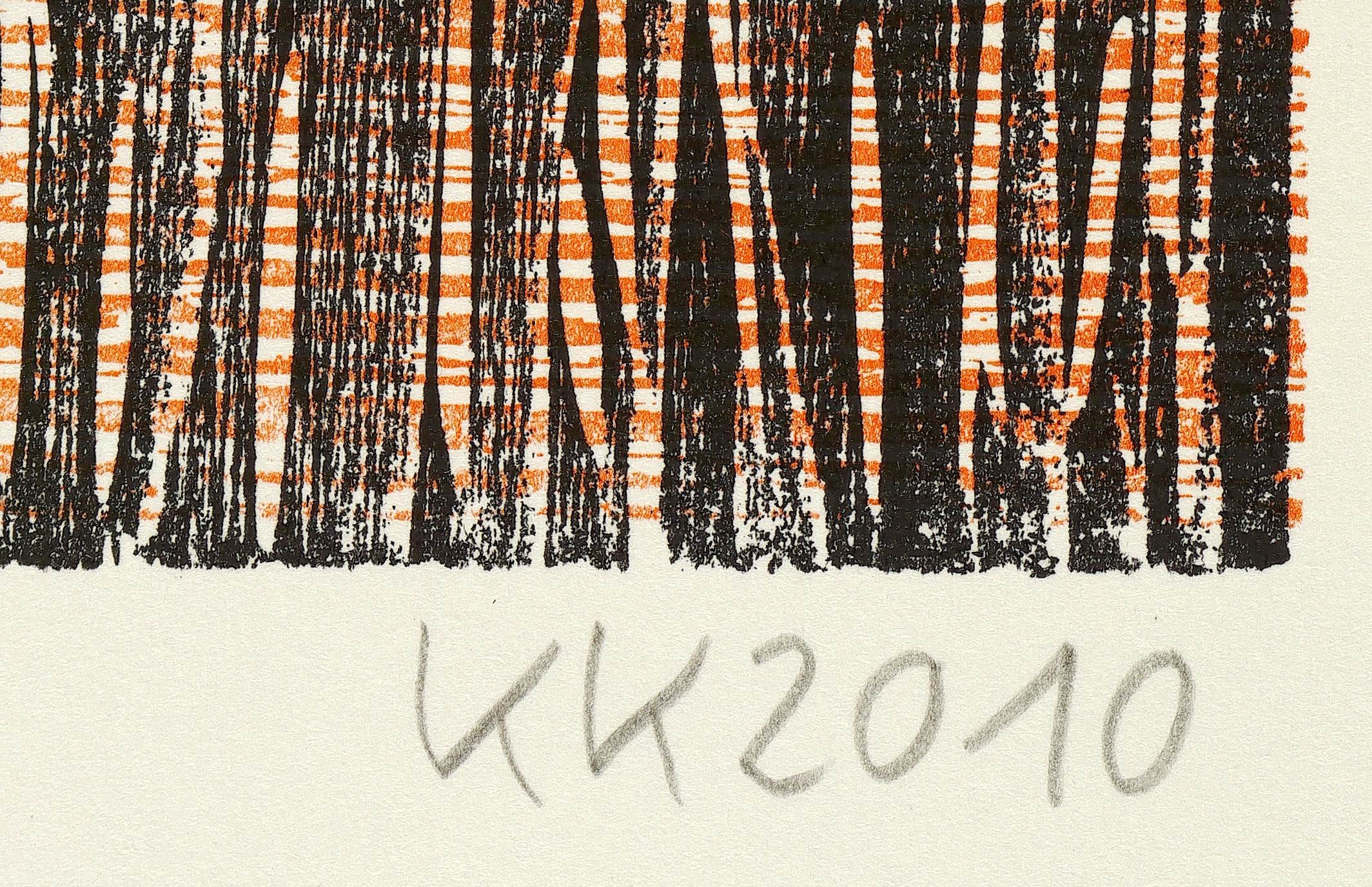 2010. Farbholzschnitt, in drei Farben, auf Büttenpapier. – Originale Künstlergrafik, von Katharina Kretschmer. – Auflage Exemplar Nr. 3/7. – 37,2 x 29,2 cm (Darstellung / Druckstock), 90 x 50 cm (Blatt).