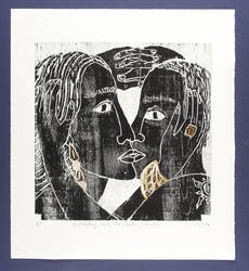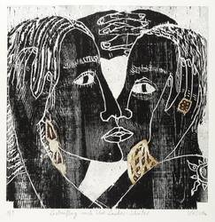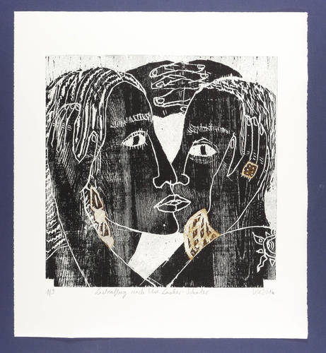 2016. Farbholzschnitt, mit Materialdruck, in 2 Farben, auf Velin. – Originale Künstlergrafik, von Katharina Kretschmer. – Auflage Exemplar Nr. 1/9. – 42,8 x 42,8 cm (Darstellung / Druckstock), 60,5 x 54,5 cm (Blatt).