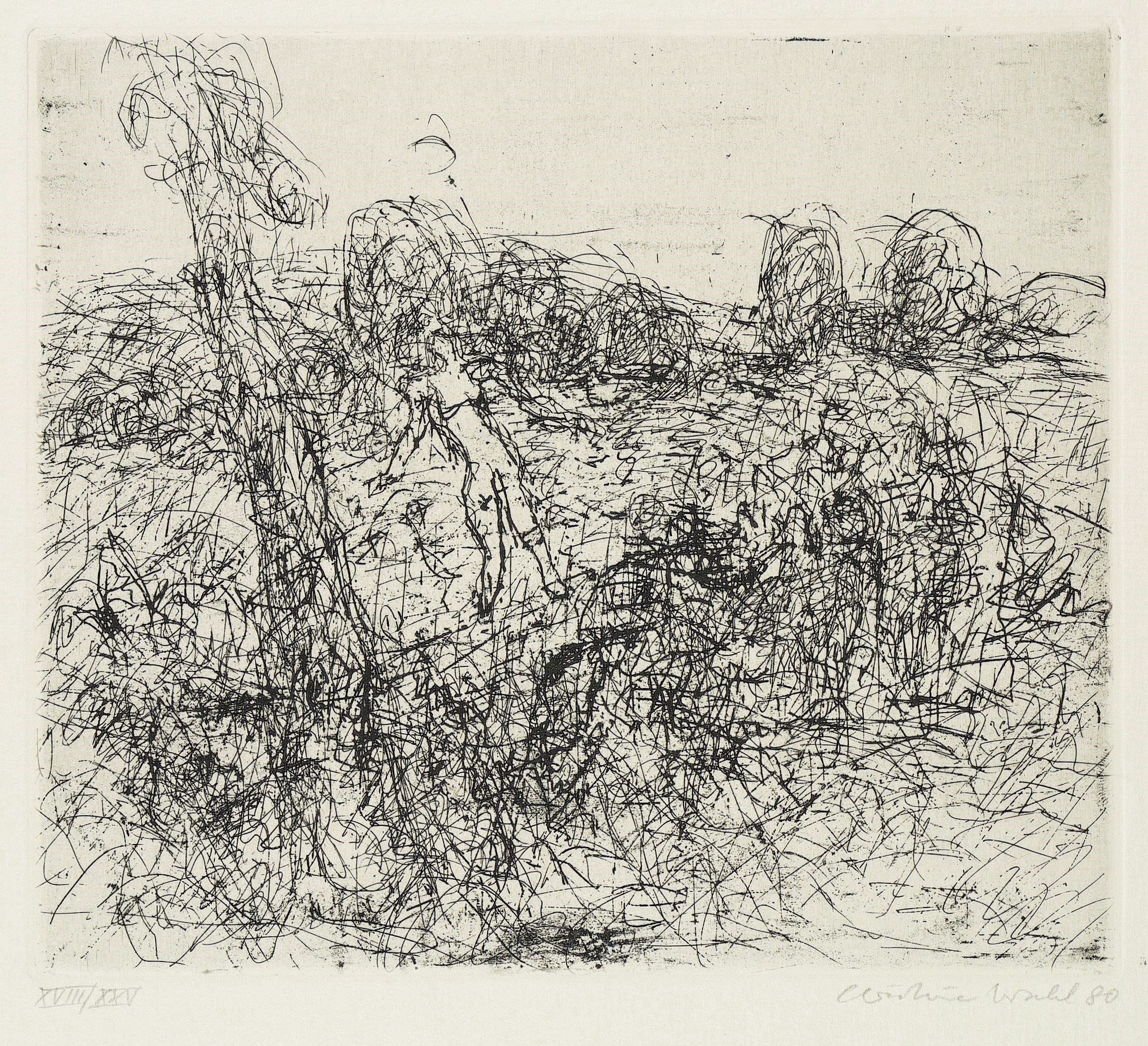 1968/1980. Radierung / Strichätzung, in Schwarz, auf Velin. – Originale Künstlergrafik, von Christine Wahl. – Auflage Exemplar Nr. 18/25. – 17,0 x 19,5 cm (Darstellung / Platte), 37 x 35 cm (Blatt).