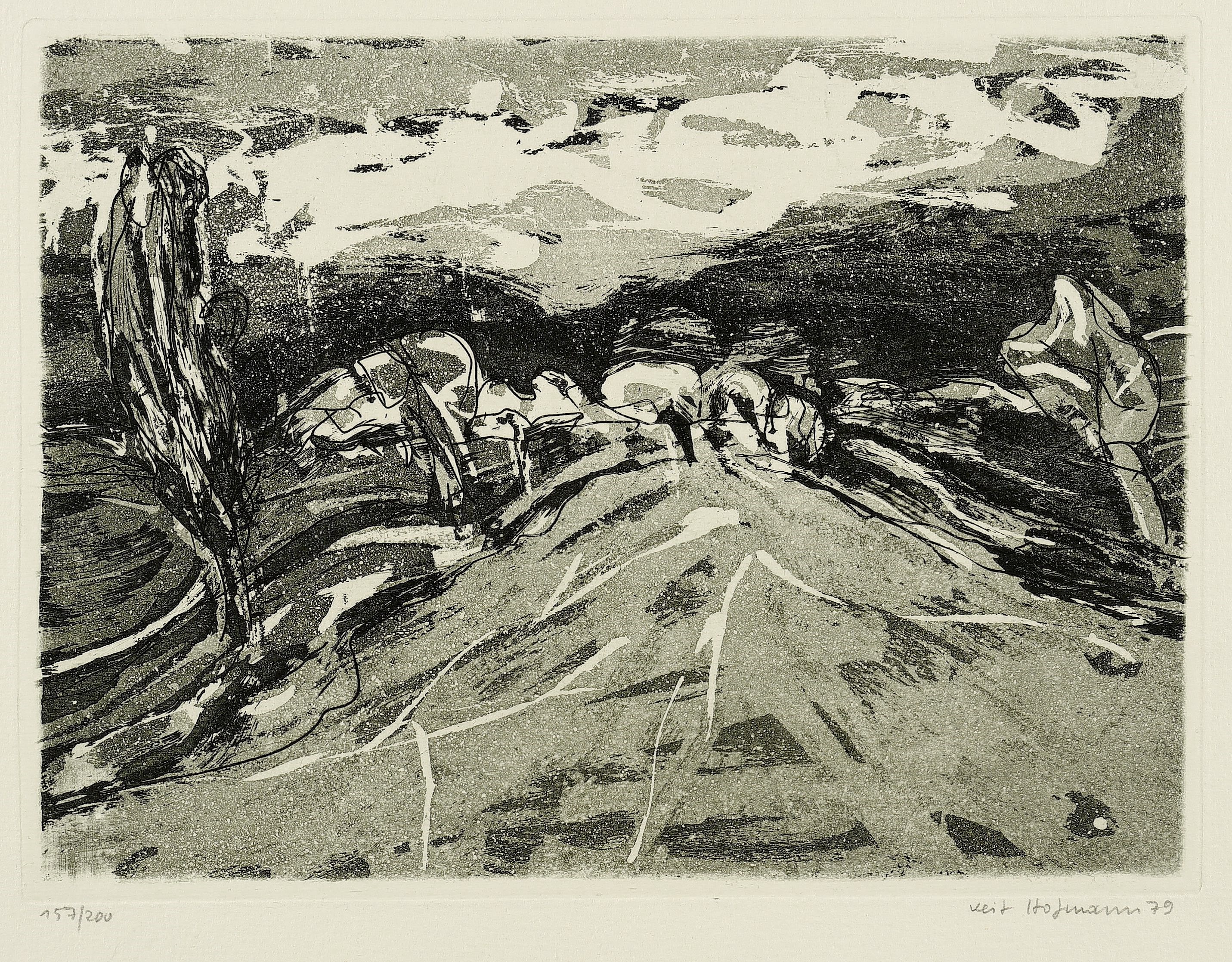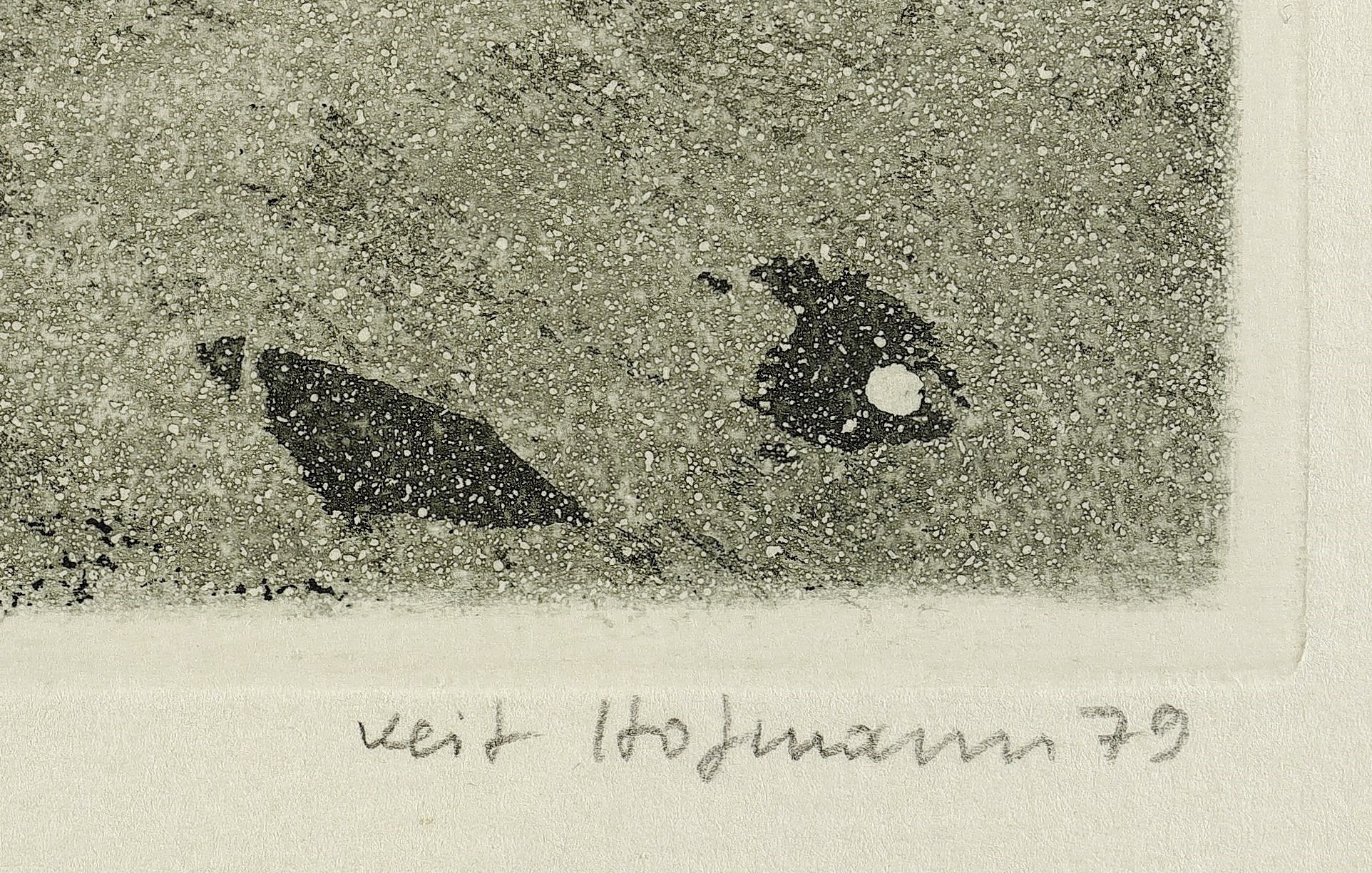 1979. Radierung / Aquatinta & Reservage, in Schwarz, auf hellchamois Velin. – Originale Künstlergrafik, von Veit Hofmann. – Auflage Exemplar Nr. 157/200. – 19,2 x 25,9 cm (Darstellung), 20,0 x 26,7 cm (Platte), 37 x 36 cm (Blatt).
