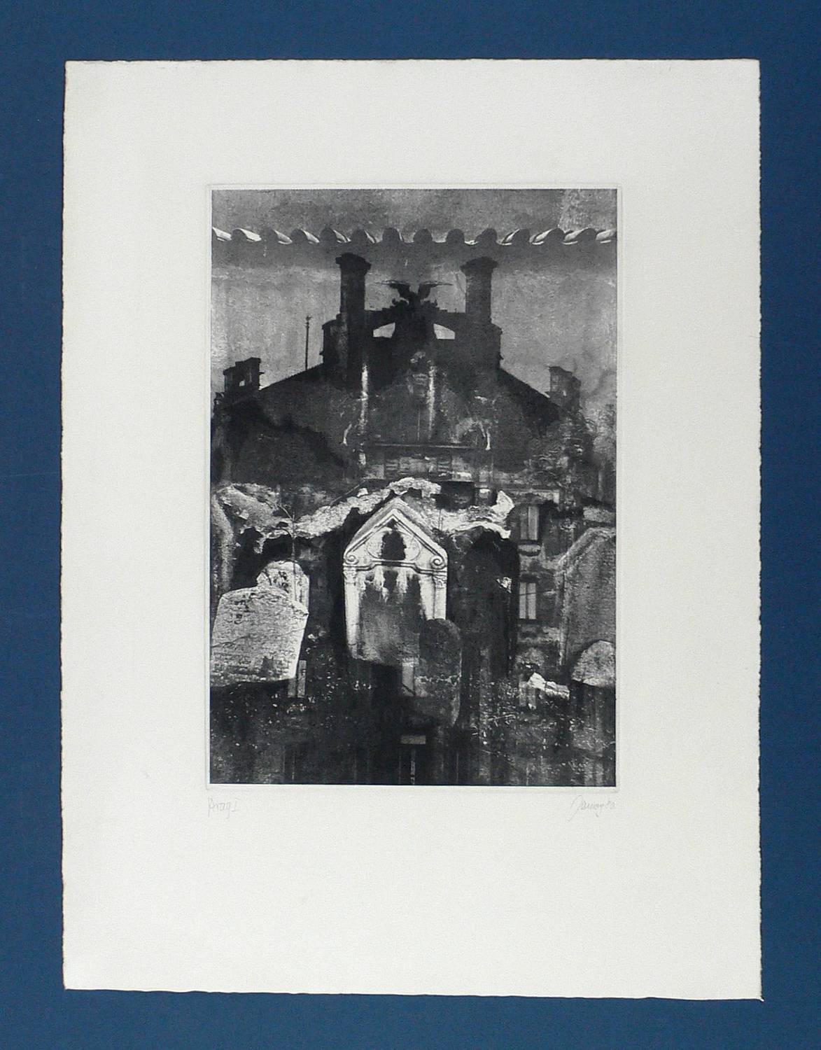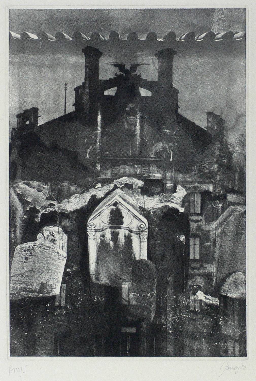 Rechts unter der Platte in Bleistift signiert und datiert und links betitelt. Am Blattrand rechts unten Wasserzeichen der Hahnemühle. – Radierkünstlerische Montage fotografischer Aufnahmen des Bahnhofs und des Jüdischen Friedhofs in Prag. Darüber eine Mauer und Fassaden. – Wichtiges Hauptblatt aus dem Schaffen des Künstlers. – Papier leicht gebräunt. Sonst sehr schön erhalten.