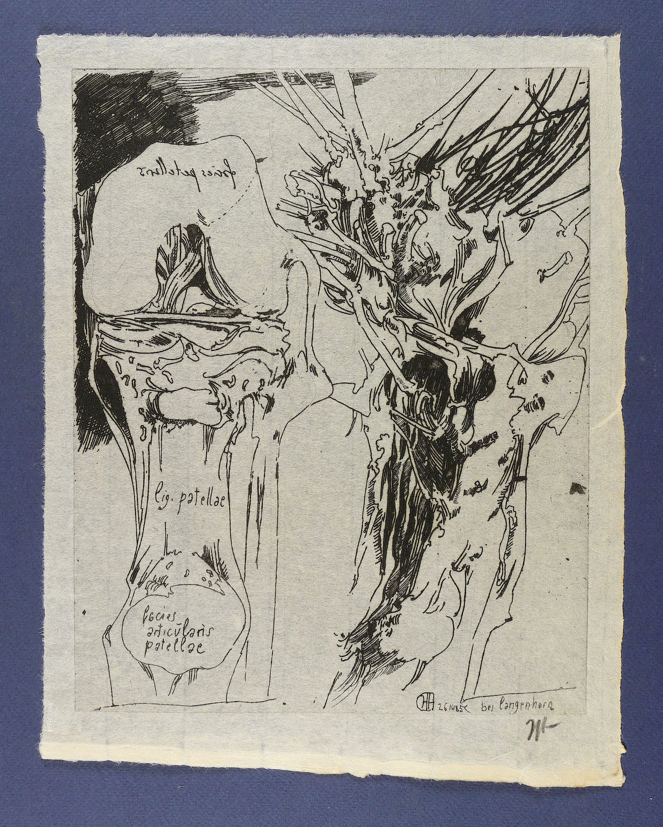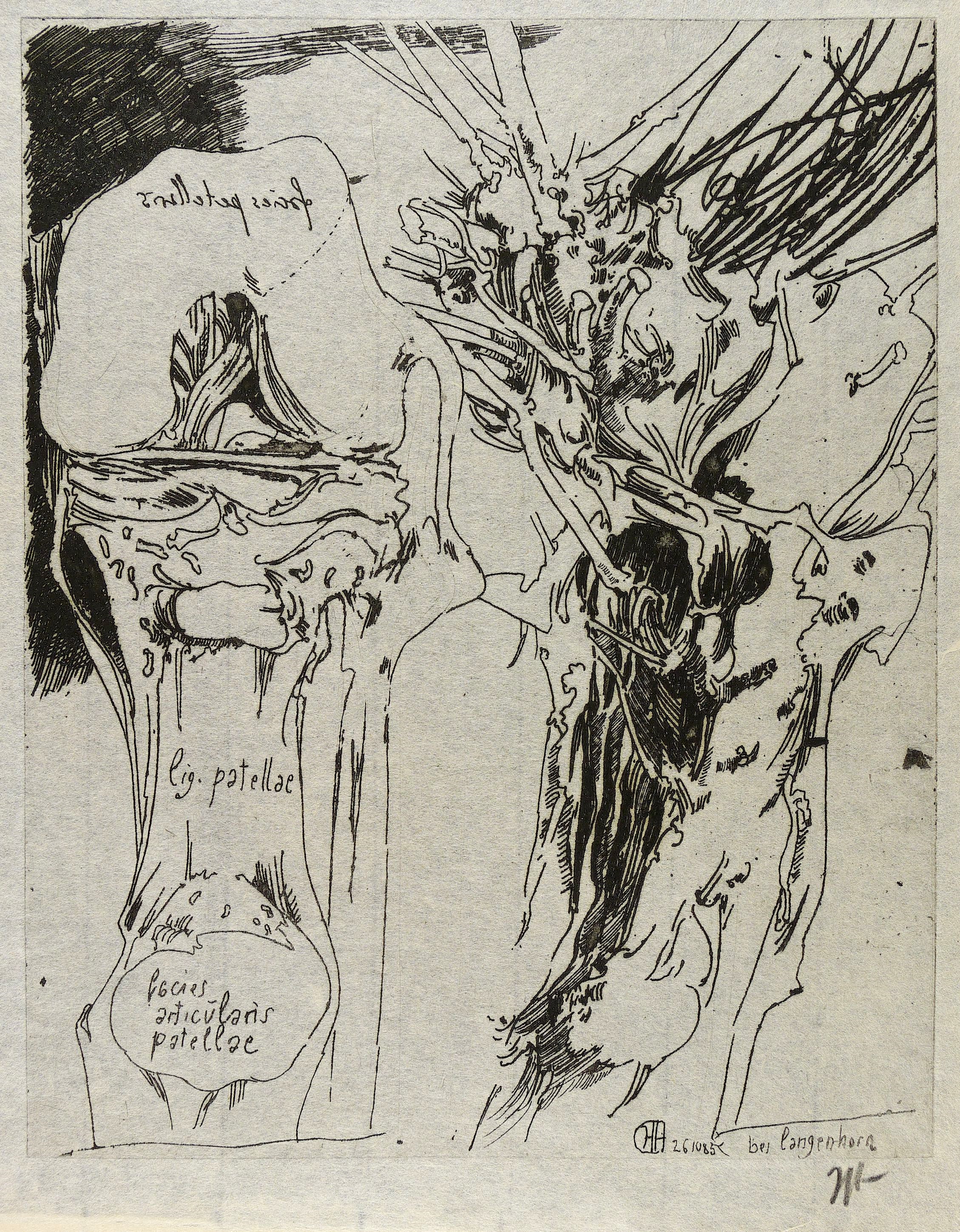 Rechts unten in der Platte monogrammiert, datiert und bezeichnet ″bei langenhorn″. In der Darstellung links mit der Inschrift: ″facies articularis patellae″. Rechts unter der Platte in Bleistift signiert ″Janssen″. – Die Blattkanten etwas stärker gebräunt. Minimale Randmängel. Gut erhaltenes Exemplar.