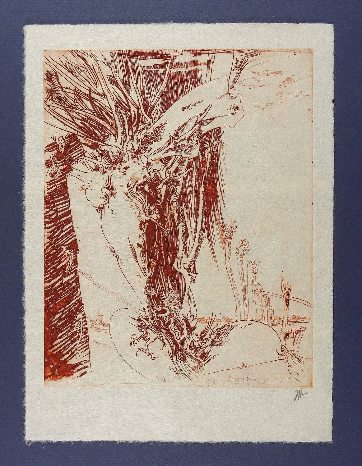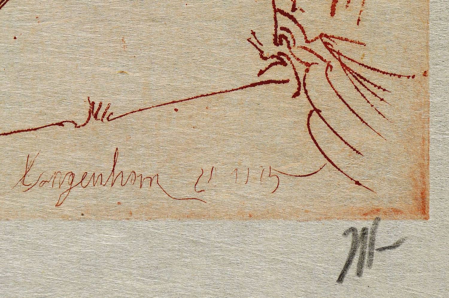1985. Radierung / Strichätzung, in Rotbraun, auf hellgelbem Japan. – Originale Künstlergrafik, von Horst Janssen. – 27,4 x 21,9 cm (Darstellung / Platte), 34,0 x 23,5 cm (Blatt).