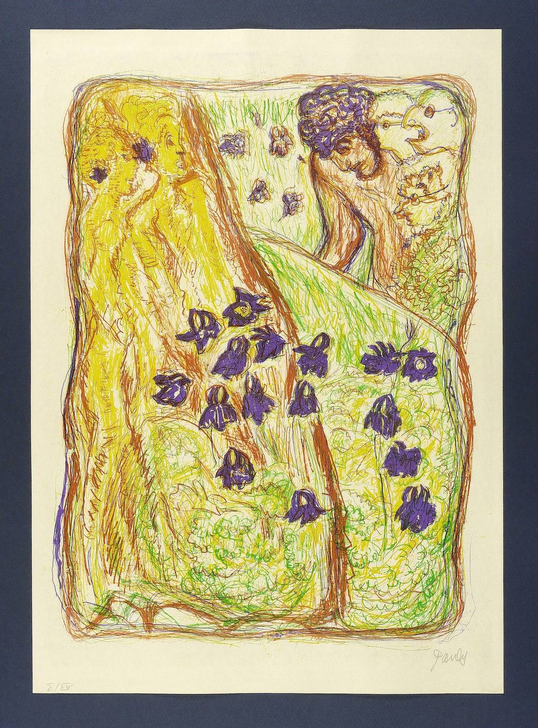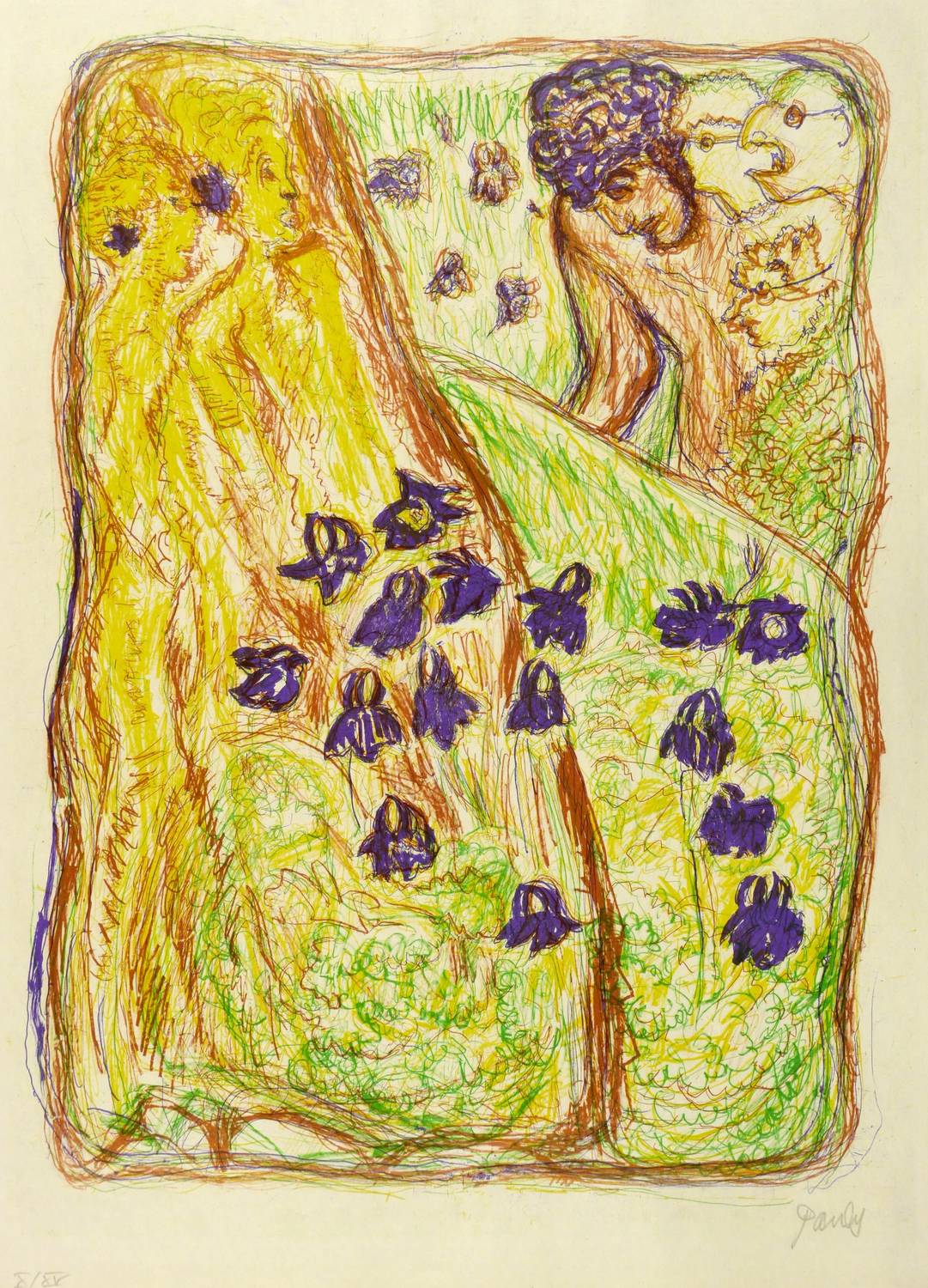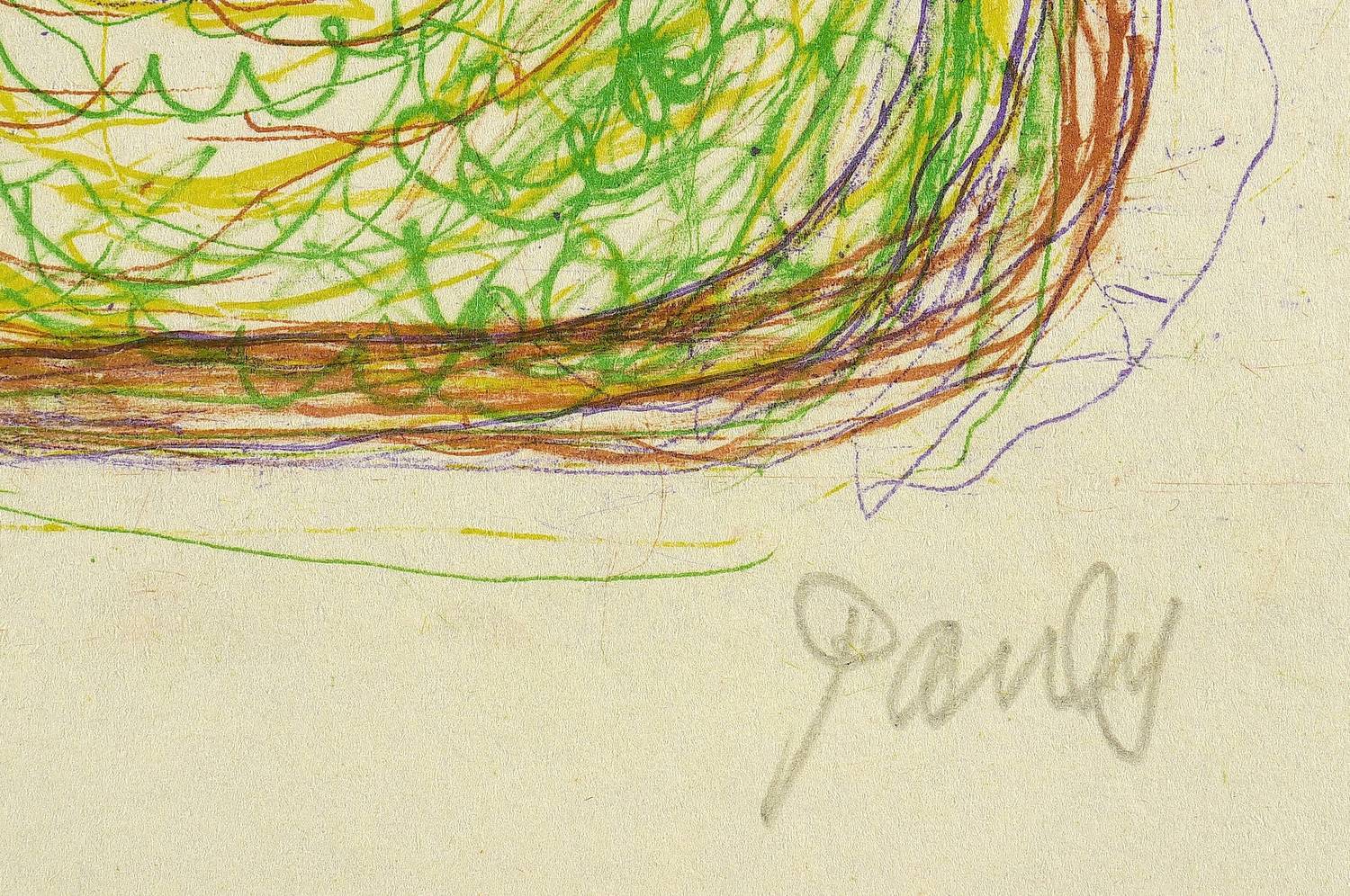 1972/1973. Farbzinkografie / Kreide-, Pinsel- & Federzinkografie, in 4 Farben, auf hellchamois Velin. – Originale Künstlergrafik, von Charlotte Elfriede Pauly. – Auflage Exemplar Nr. 10/15. – 24,5 x 30,5 cm (Darstellung), 49 x 35 cm (Blatt).