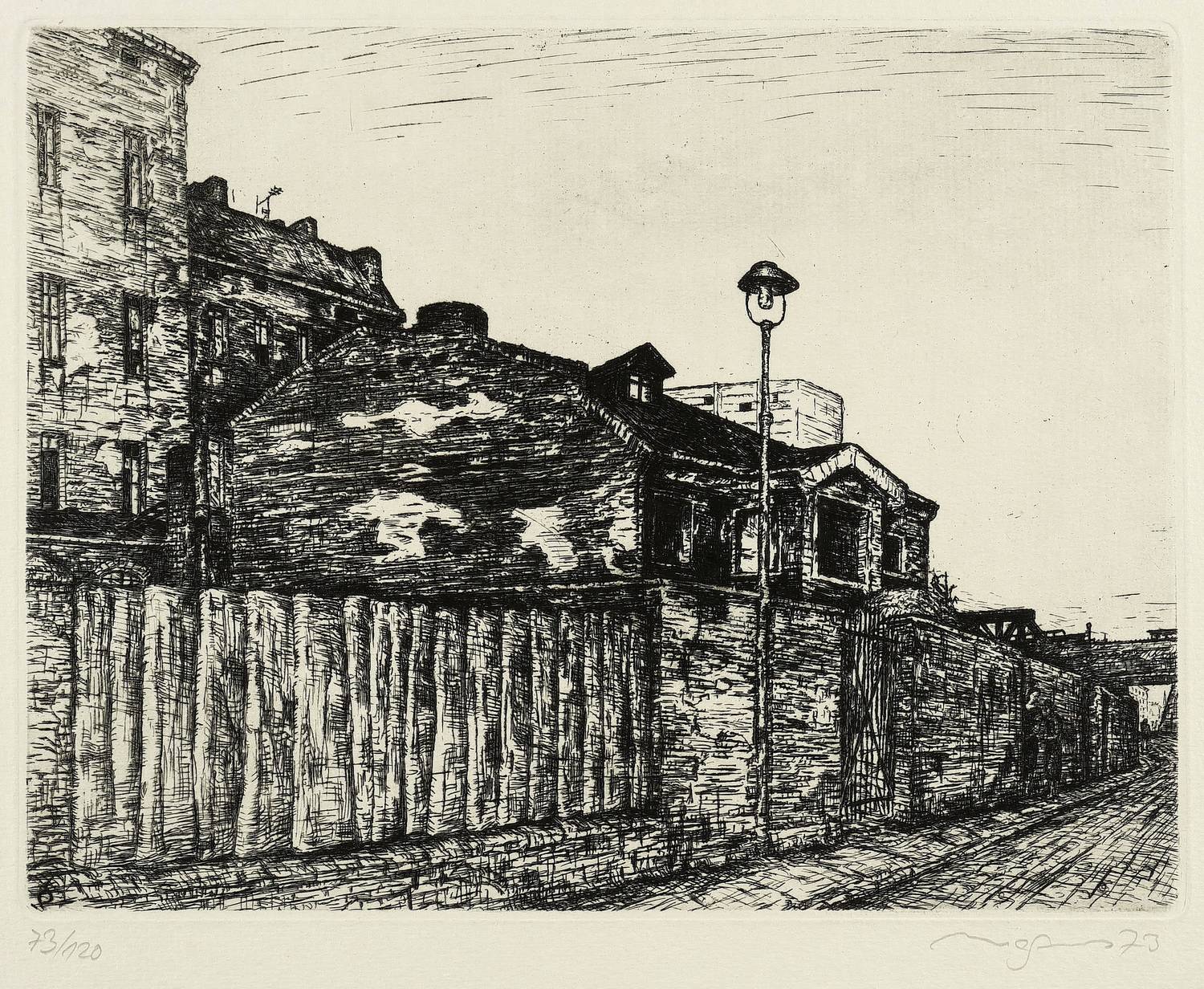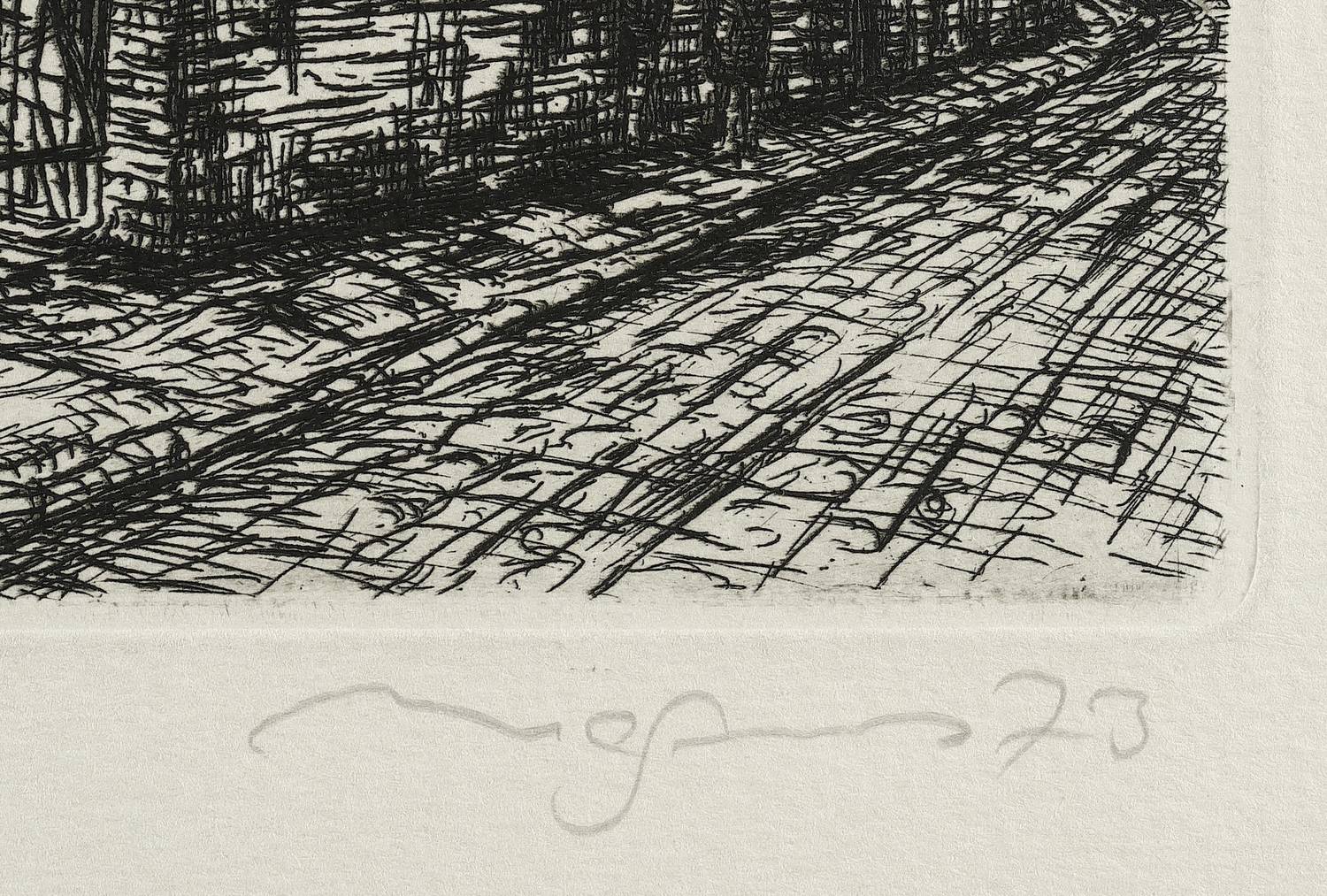 1973. Radierung / Strichätzung, in Schwarz, auf hellem Velin. – Originale Künstlergrafik, von Klaus Magnus. – Auflage Exemplar Nr. 73/120. – 23,5 x 30,5 cm (Darstellung / Platte), 37 x 47 cm (Blatt).