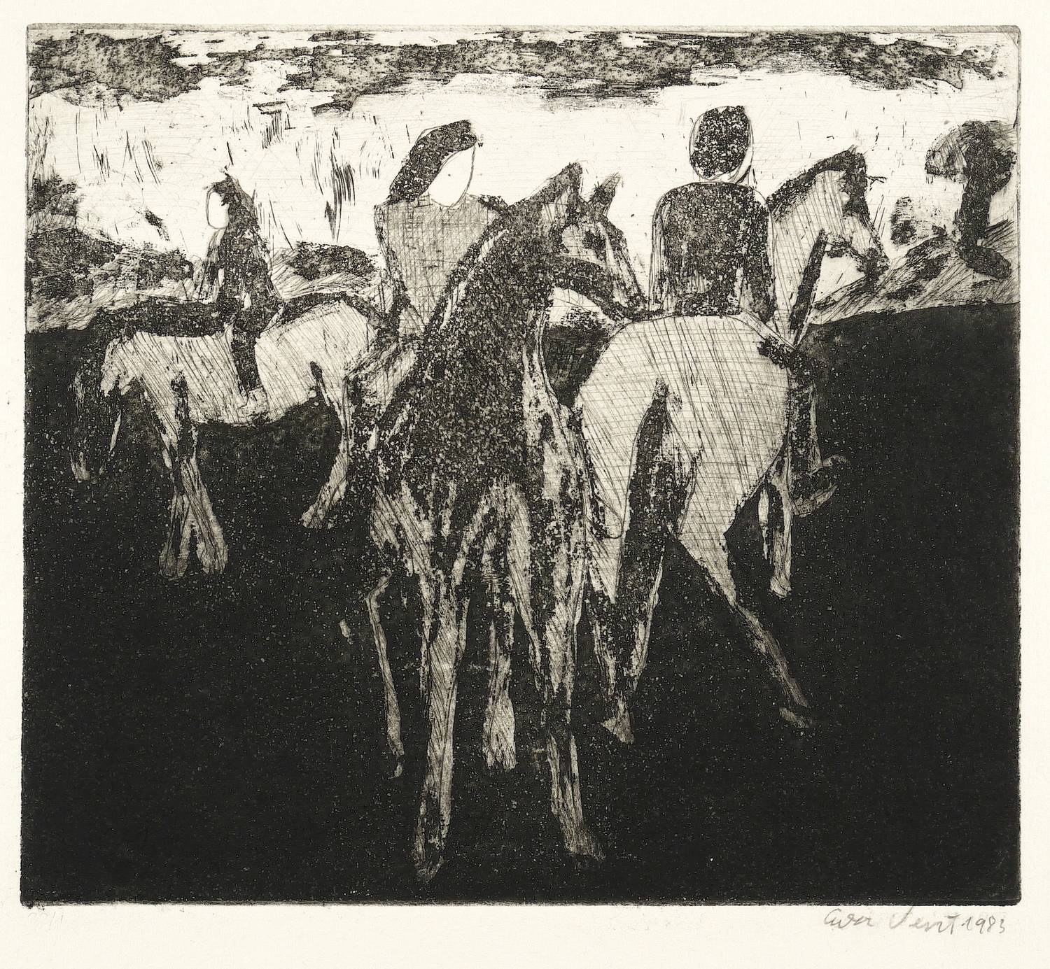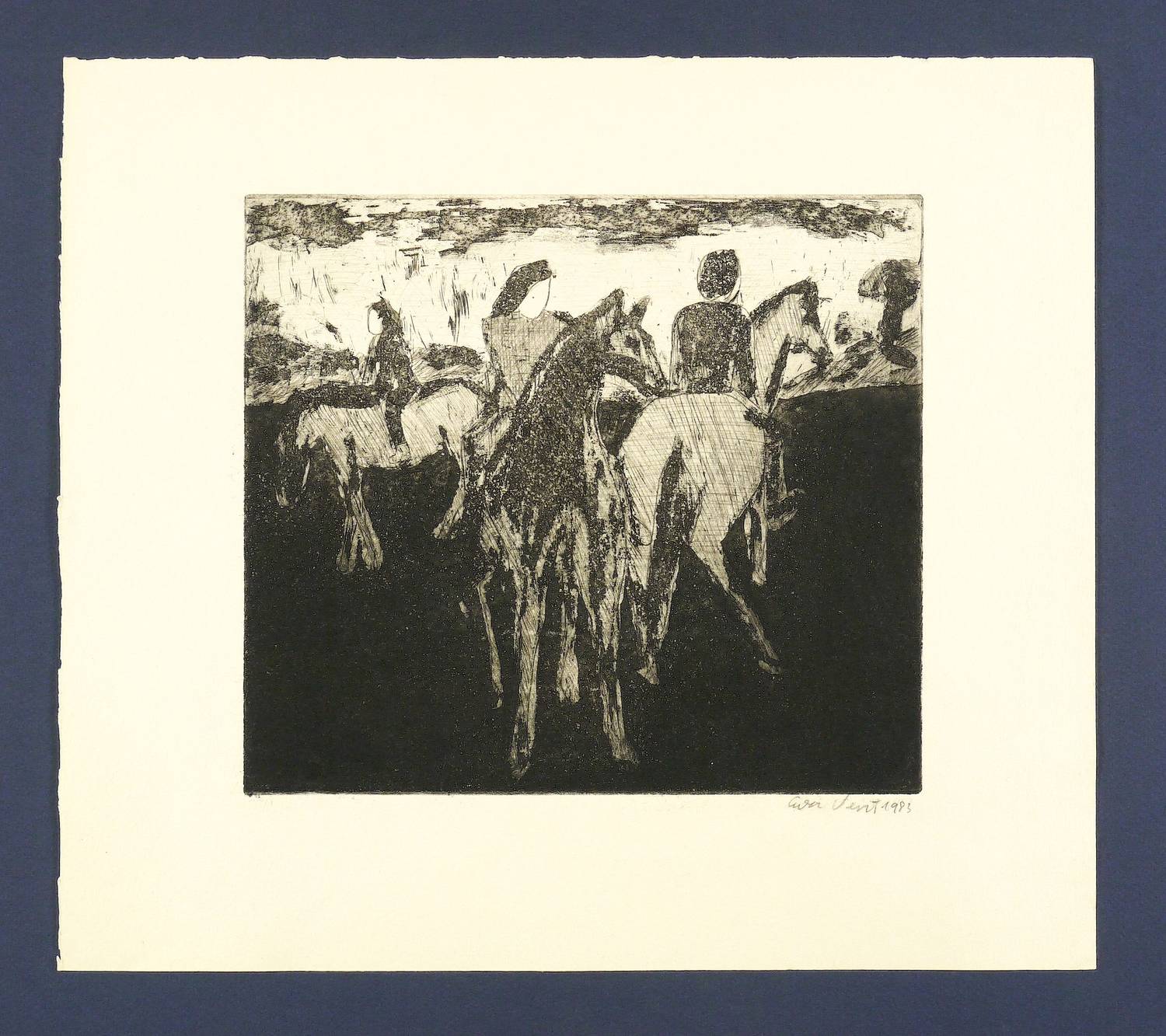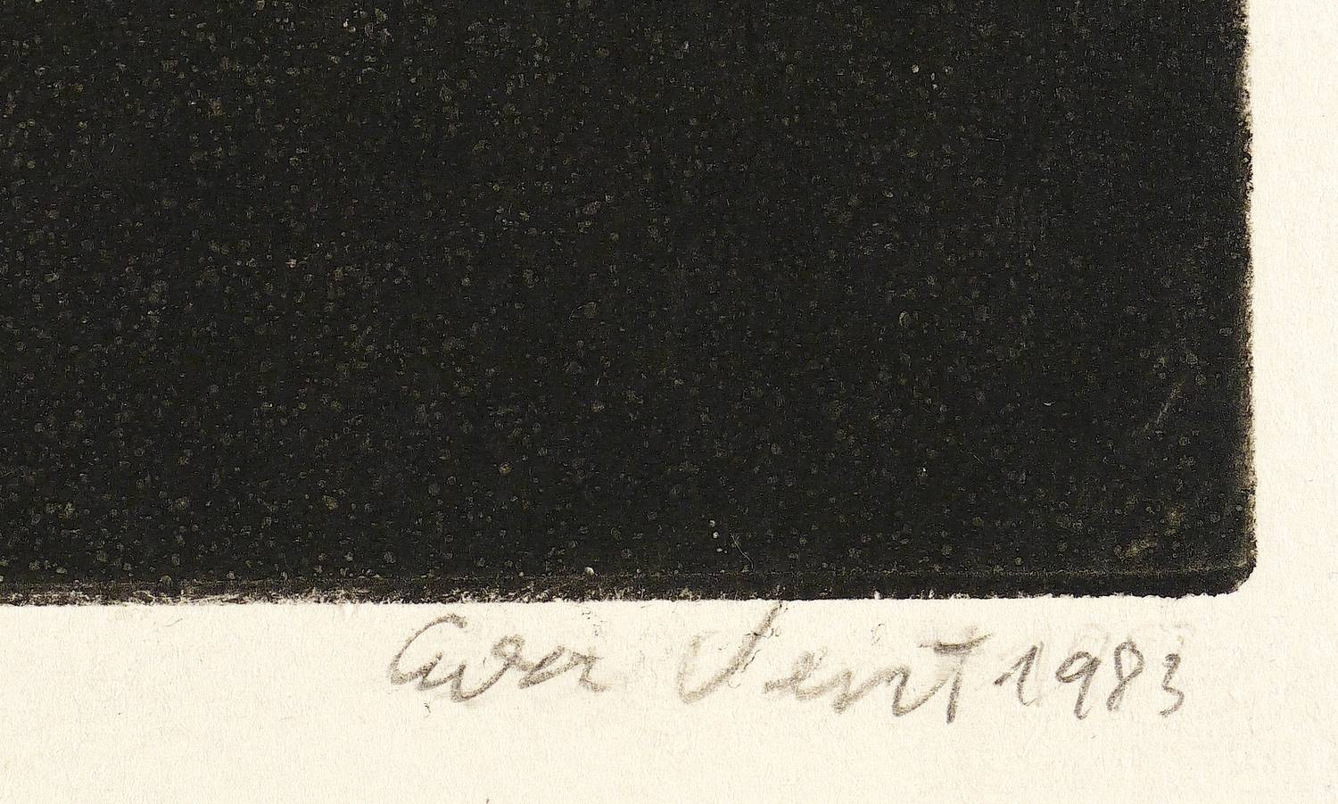 1983. Radierung / Strichätzung & Aquatinta, in Schwarz, auf hellchamois Velin. – Originale Künstlergrafik, von Eva Vent. – Auflage Exemplar Nr. 1/22. – 21,7 x 24,6 cm (Darstellung / Platte), 33 x 37 cm (Blatt).