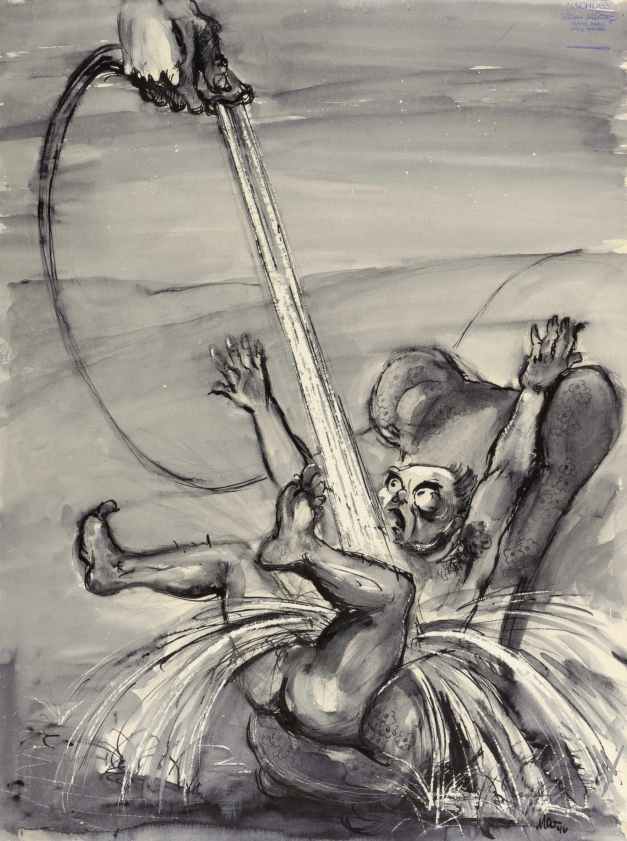 Verso in schwarzer Feder signiert und datiert: ″Mau 46″. Ebenso auf der Rückseite Nachlass-Stempel Hans Mau. – Verso schöne sorgfältig durchgearbeitete Tuschezeichnung, Höhen partiell gekratzt, mit der Darstellung eines ″kalt erwischten″, mit einem Schlauch bespritzten Mannes im Ohrensessel. – In den Ecken originale Reißzwecklöchlein. Linke untere Ecke mit schwach ausgeprägtem Eselsohr. Bisweilen geringfügige Lagerspuren. Insgesamt noch guter Zustand.