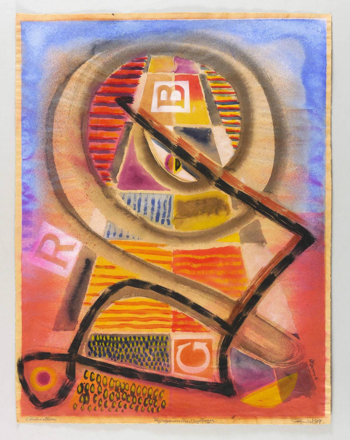 1989. Mischtechnik / Aquarell, Gouache & Tusche, auf orangem Büttenpapier. – Originale Künstlergrafik, von Günther Huniat. – Unikat. – 61,0 x 47,3 cm (Darstellung), 63 x 48,5 cm (Blatt).