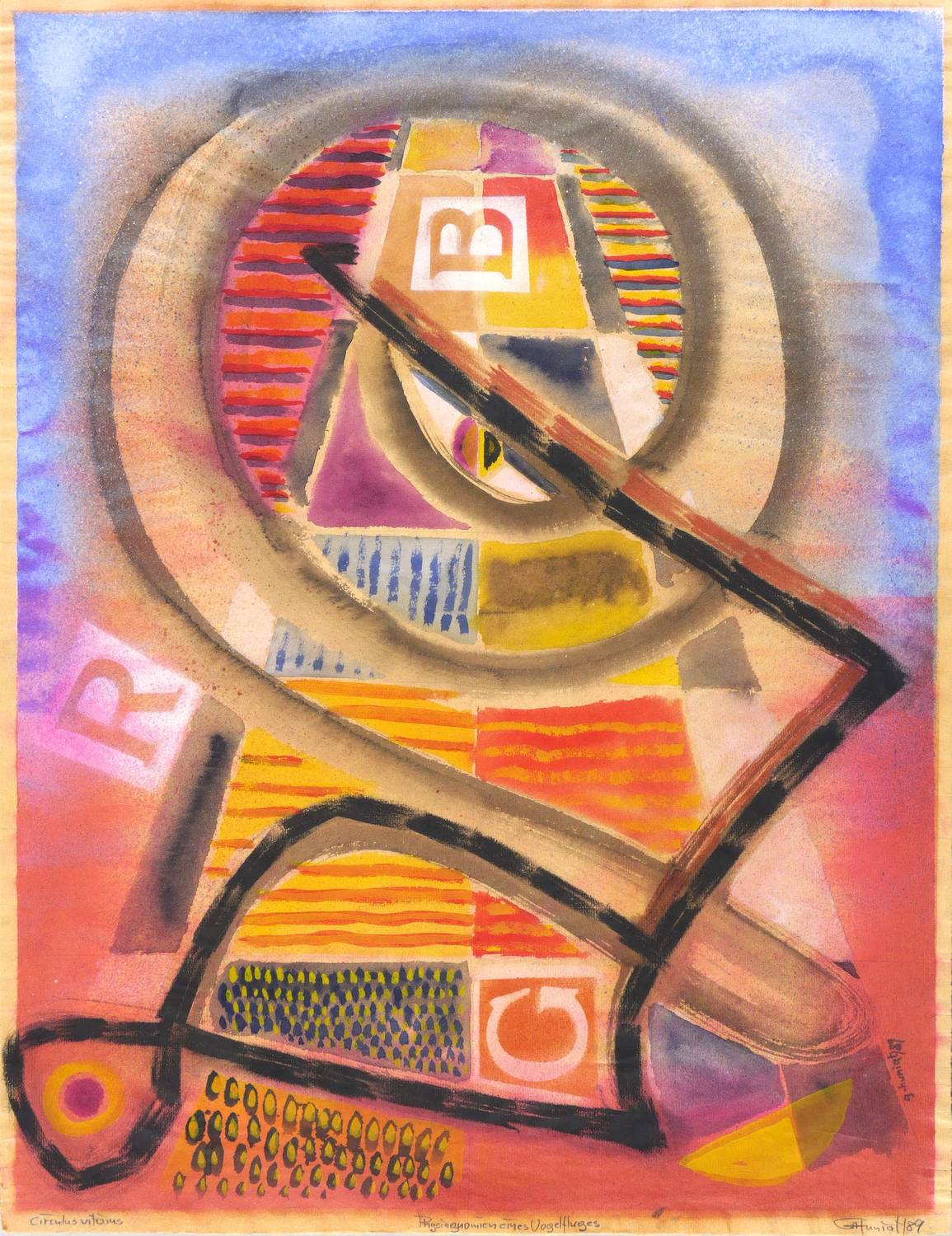 In der Darstellung in schwarzer Tusche signiert und datiert: ″g. huniat 89″. Rechts unten nochmals in Bleistift signiert und datiert. Links weiter bezeichnet: ″Circulus vitiosus / Physiognomien eines Vogelfluges″. – Tadelloses Exemplar.