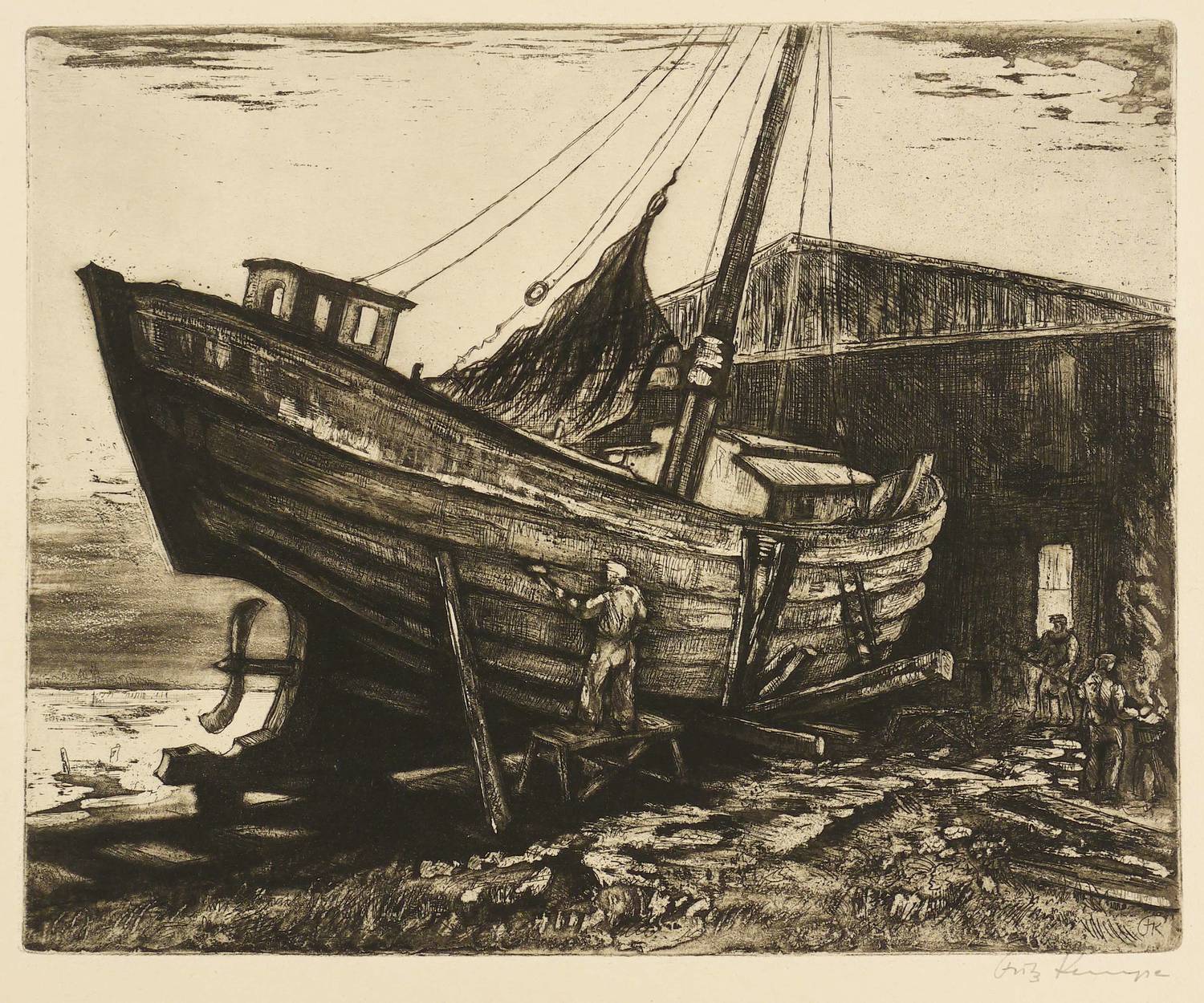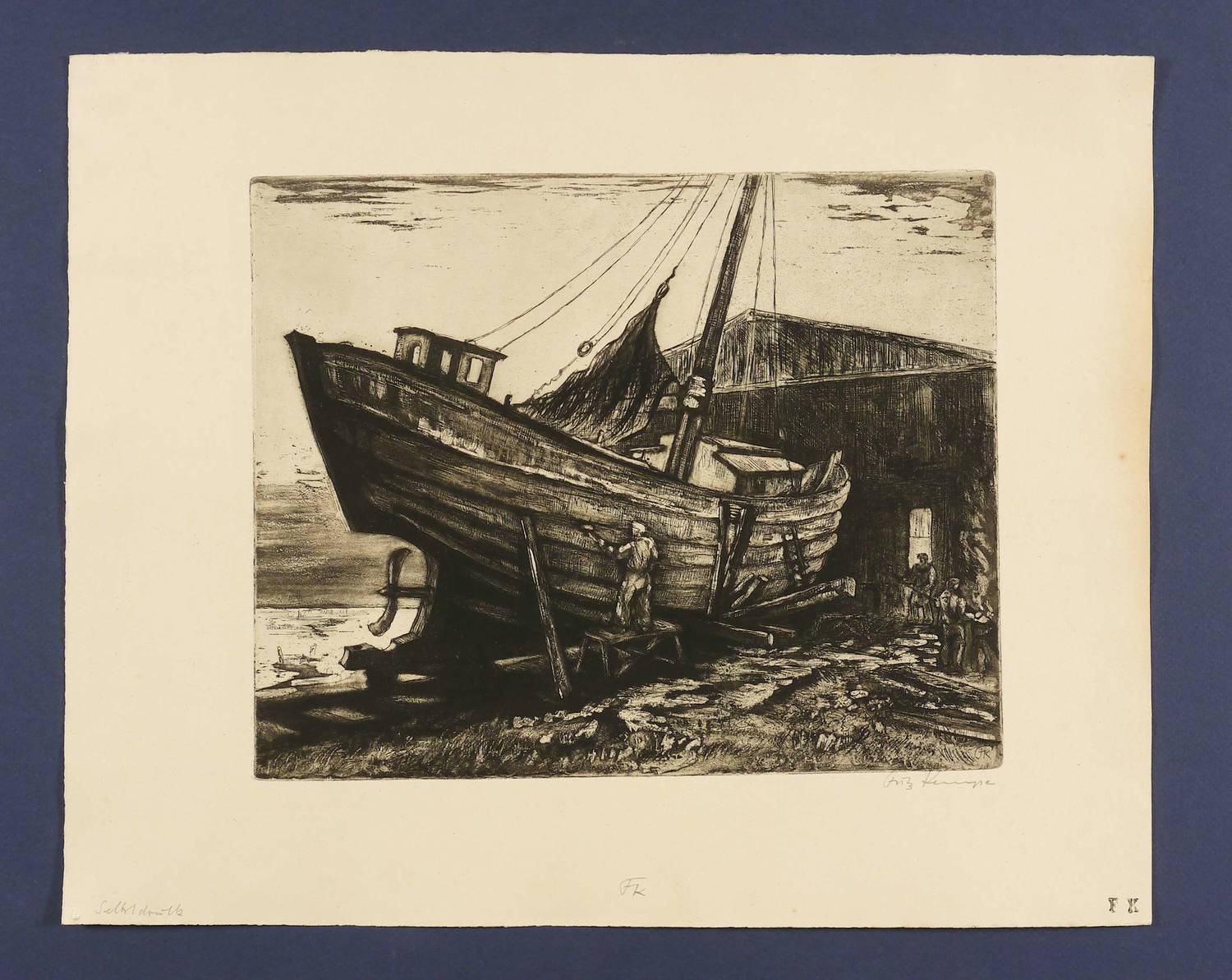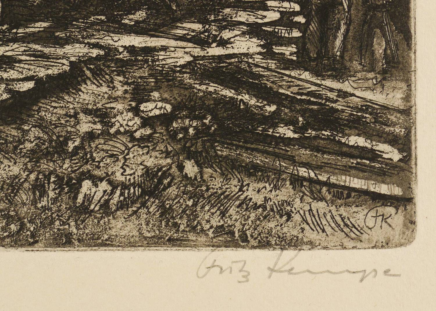 Rechts unten in Bleistift signiert: ″Fritz Kempe″. Im unteren Blattrand bezeichnet und monogrammiert: ″Selbstdruck / FK″. Rechts Monogrammstempel des Künstlers. In der Platte rechts unten zusätzlich monogrammiert. – Papier etwas gebräunt und minimal stockfleckig. Die Blattkanten etwas bestoßen mit leichten Läsionen. Insgesamt guter Erhaltungszustand.